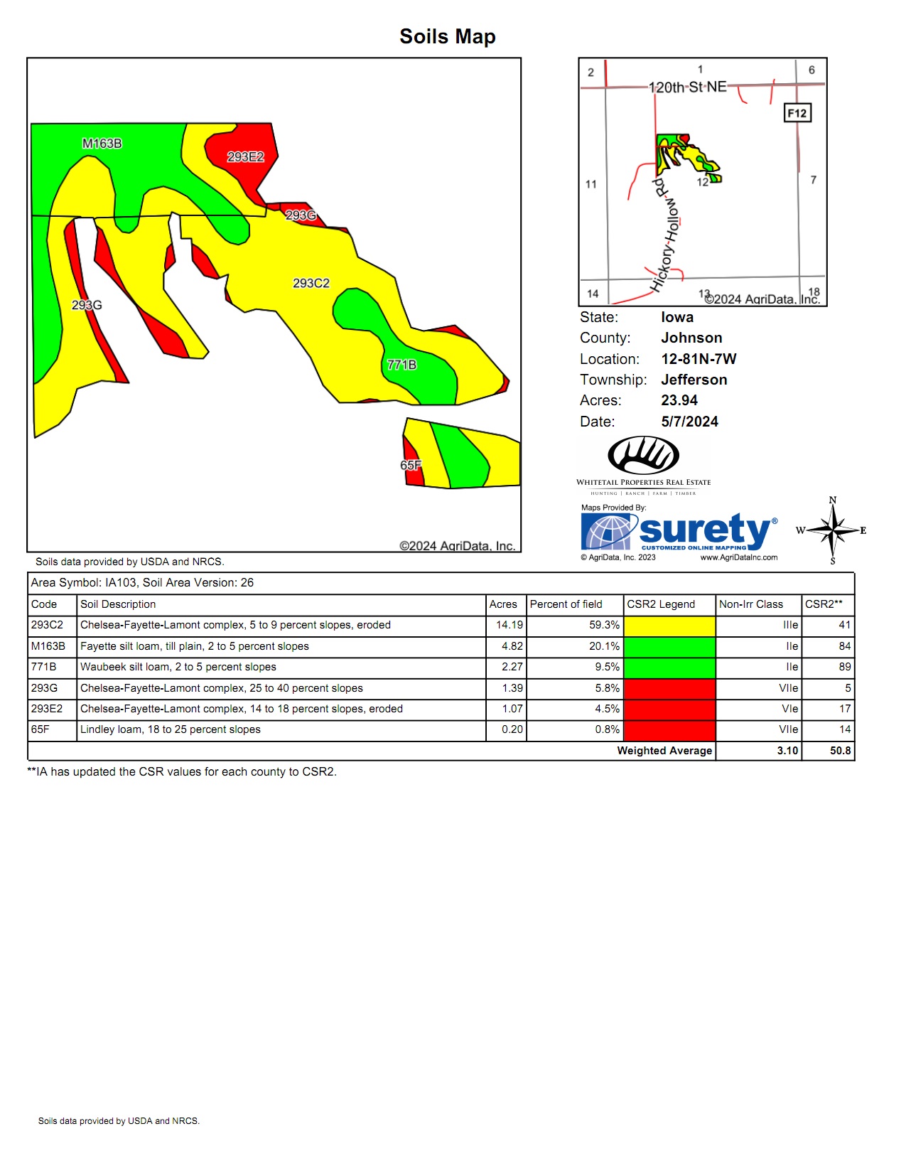 - 32 tillable acres of farmland with average CSR2 of 50, will be planted in soybeans this year