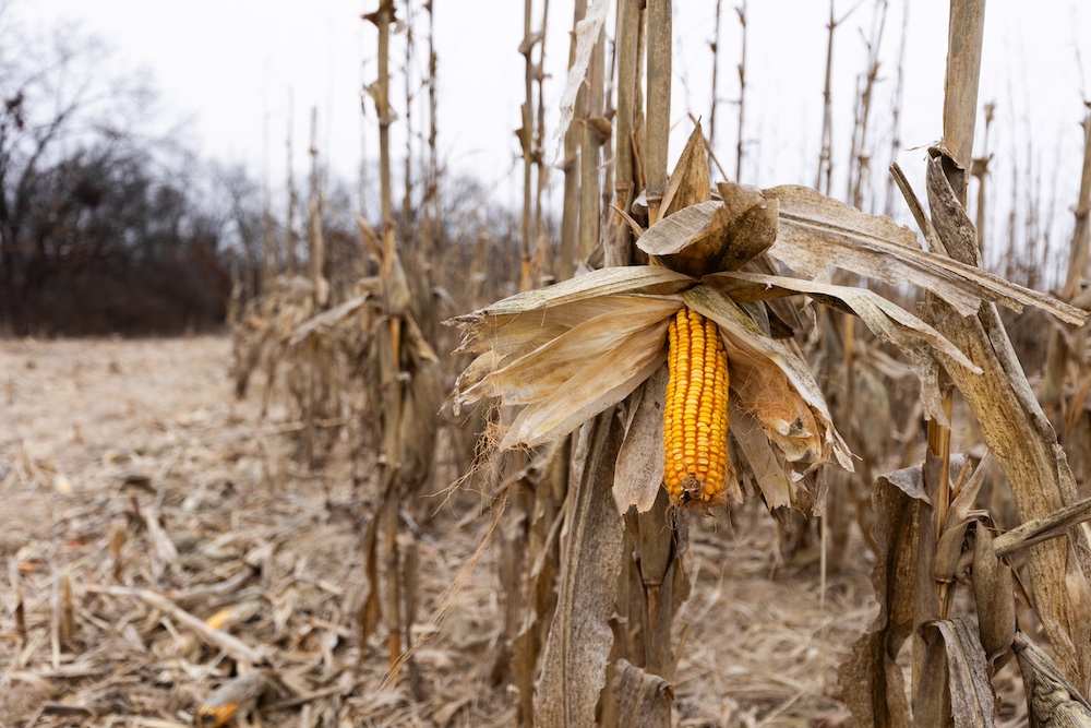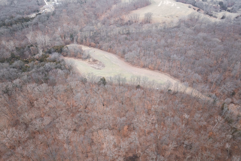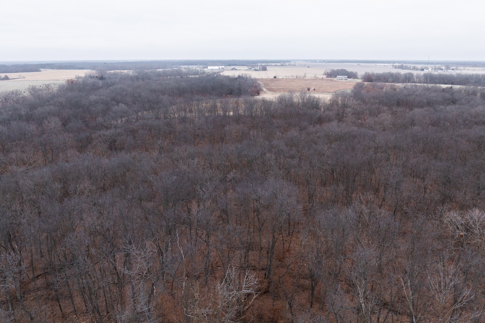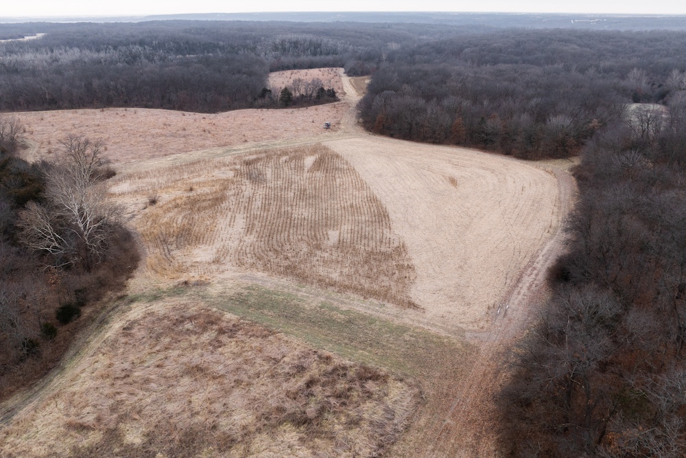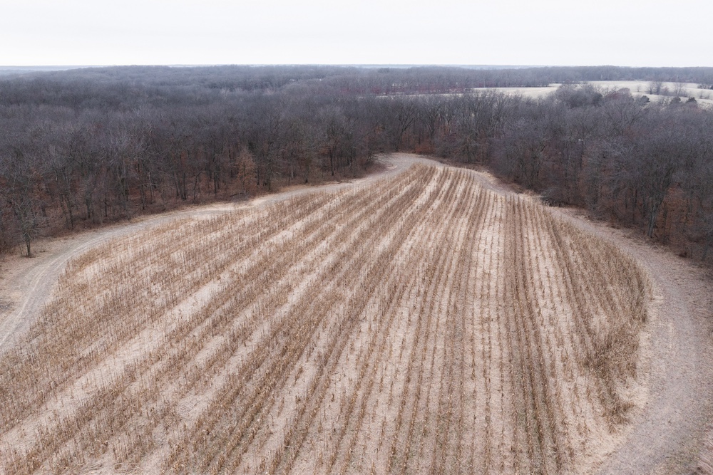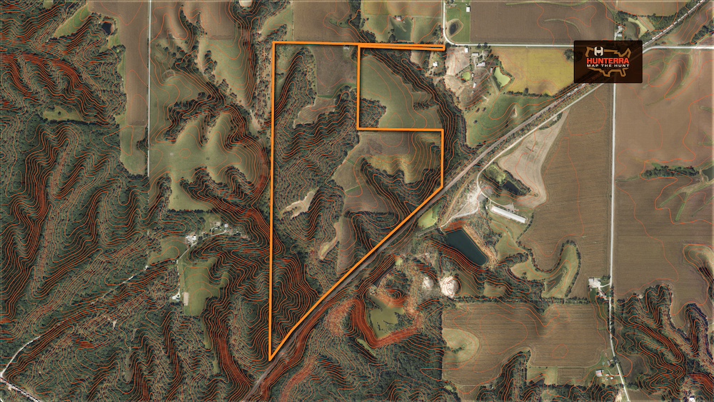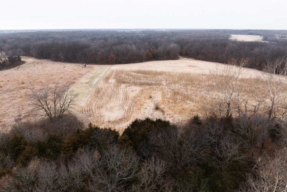 Several established food plots are in place, including three large corn plots with clover edges. A secluded green plot in the southwest ties into the southern corn plot, creating a tight movement corridor that sets up especially well for October hunts. Multiple field pinch points allow true-wind setups, and the hilltop terrain adds another advantage.