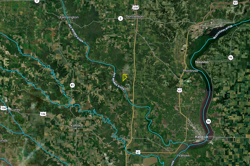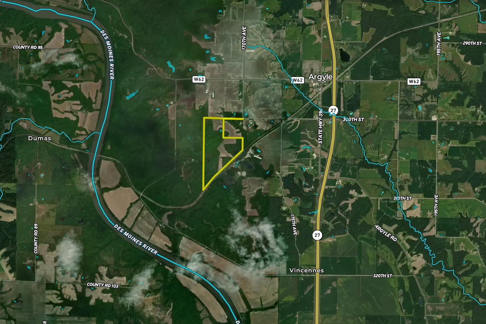 Located near Argyle in southern Lee County, the farm sits 5.5 miles from the Missouri state line, 17 miles from Illinois and within an hour and a half of the Iowa City and Cedar Rapids corridor. It’s easy to reach yet feels secluded, with the added benefit of convenient access to multiple states for hunters who like flexibility during the season.