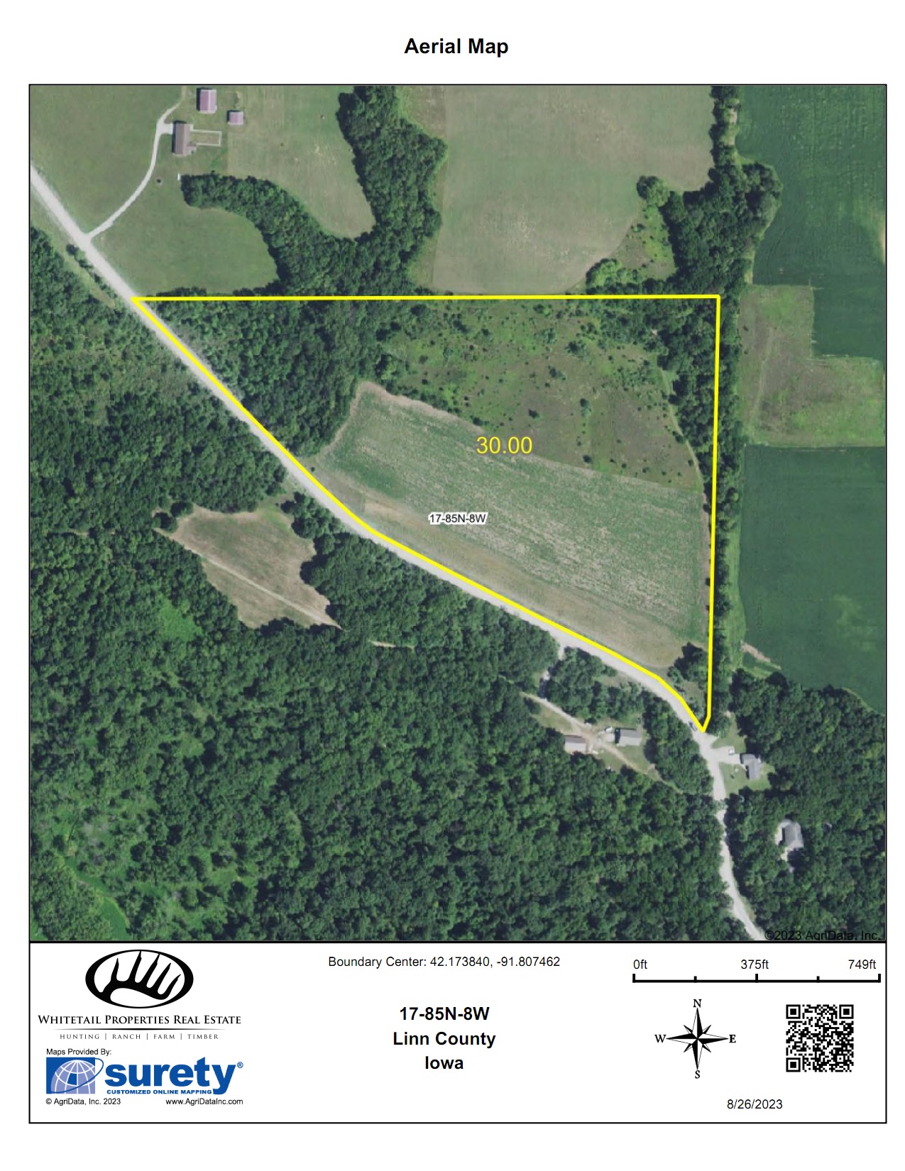 - Acres (m/l): 30 total (12 acres tillable, 5 acres timber, 10 acres rolling brushy hills, 3 acres other)