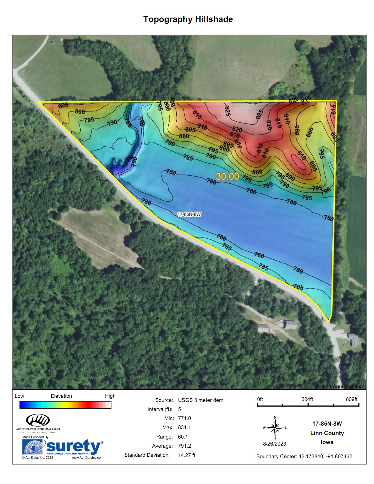 This country acreage is located in northwest Linn County near Center Point, with high-quality farmland, timber, and a prime hilltop building site. It sits along Indian Boundary Road, around a mile from Highway 380, and is under a 20-minute drive from the Cedar Rapids area.