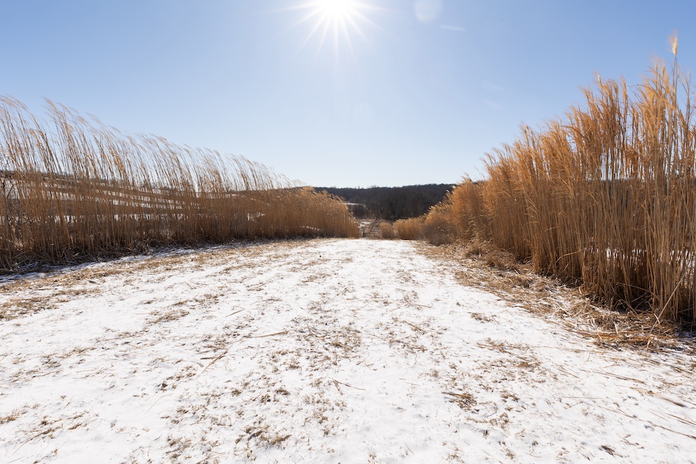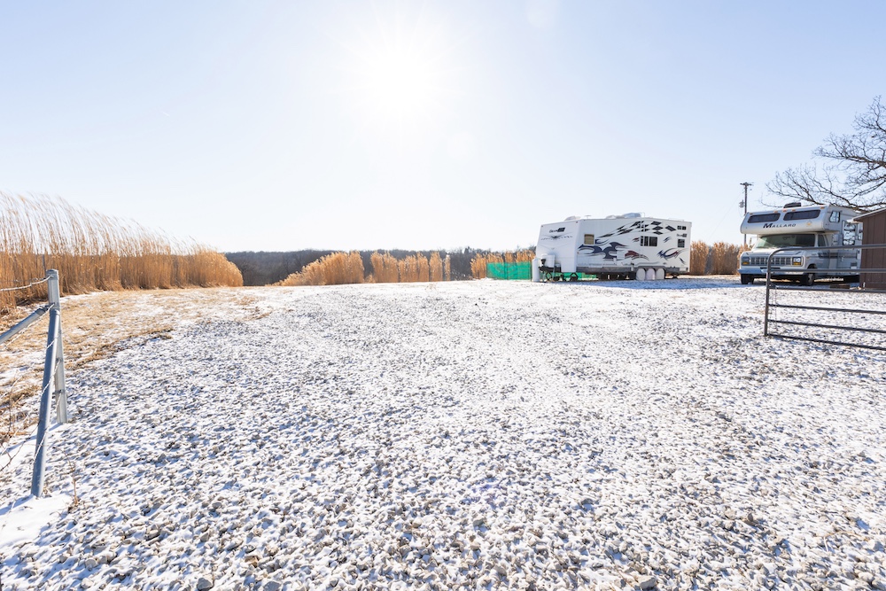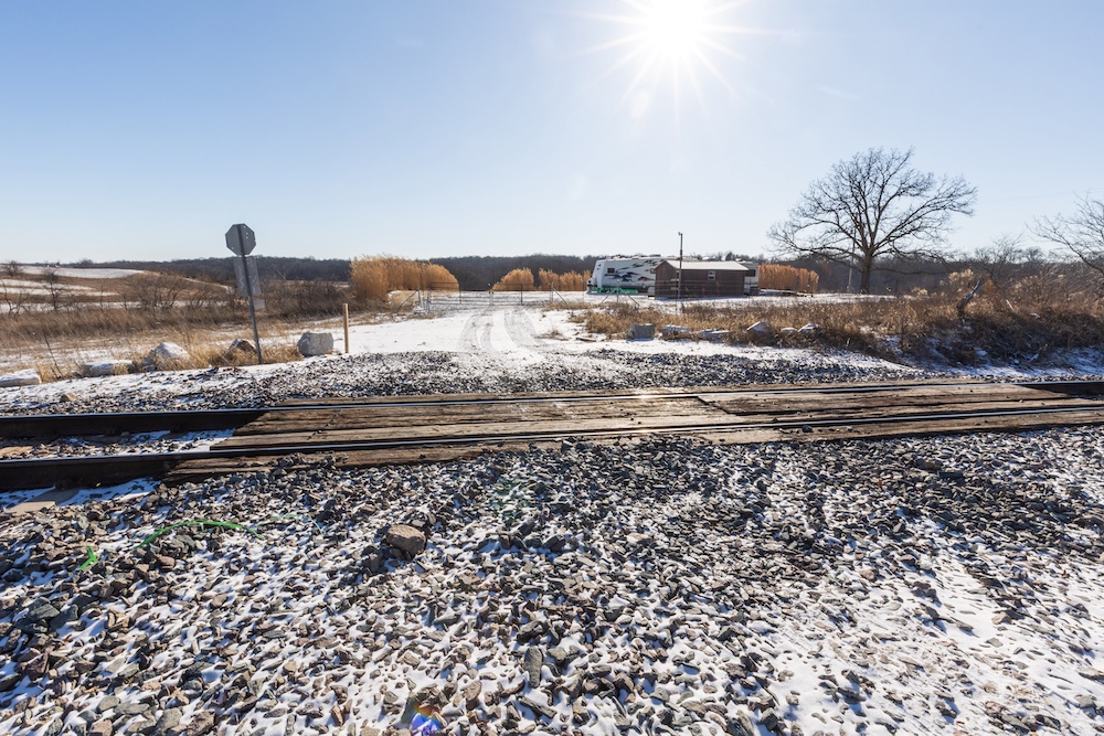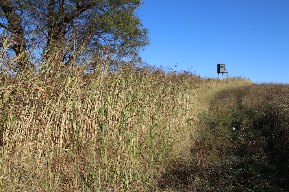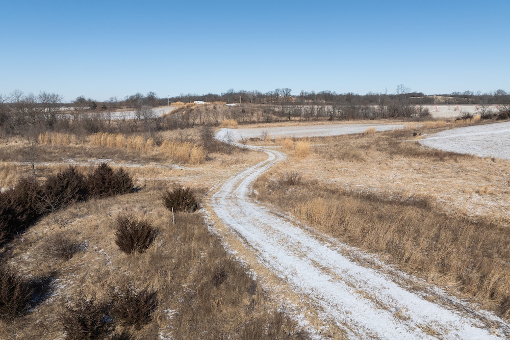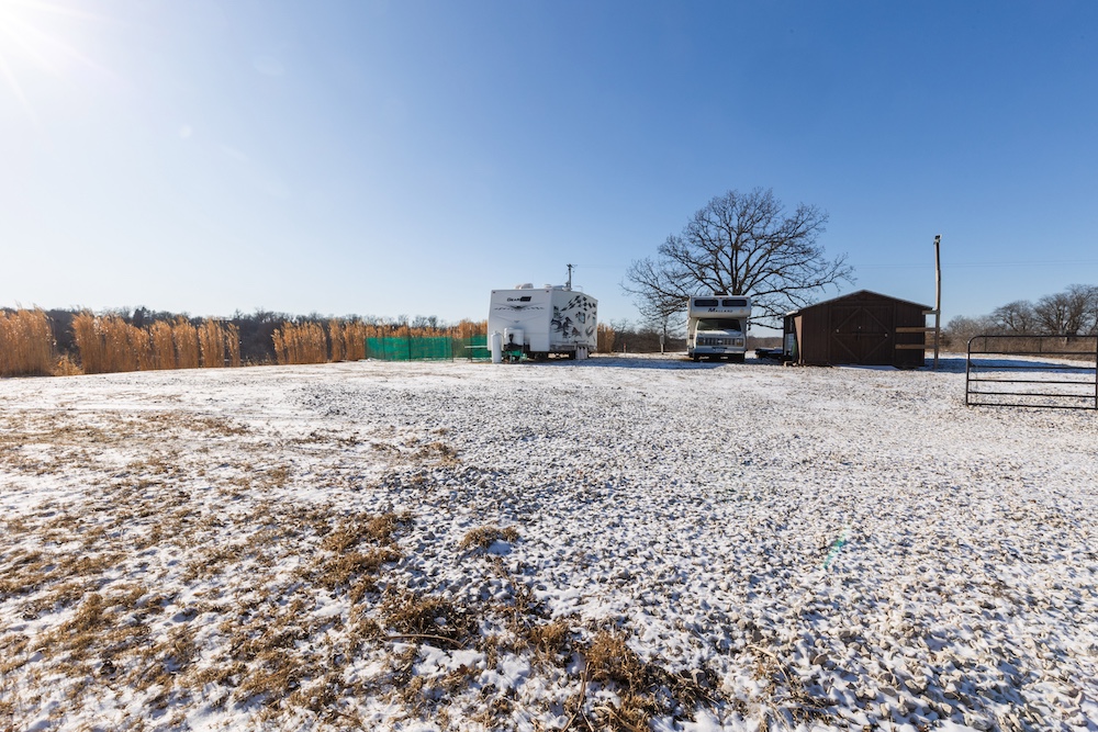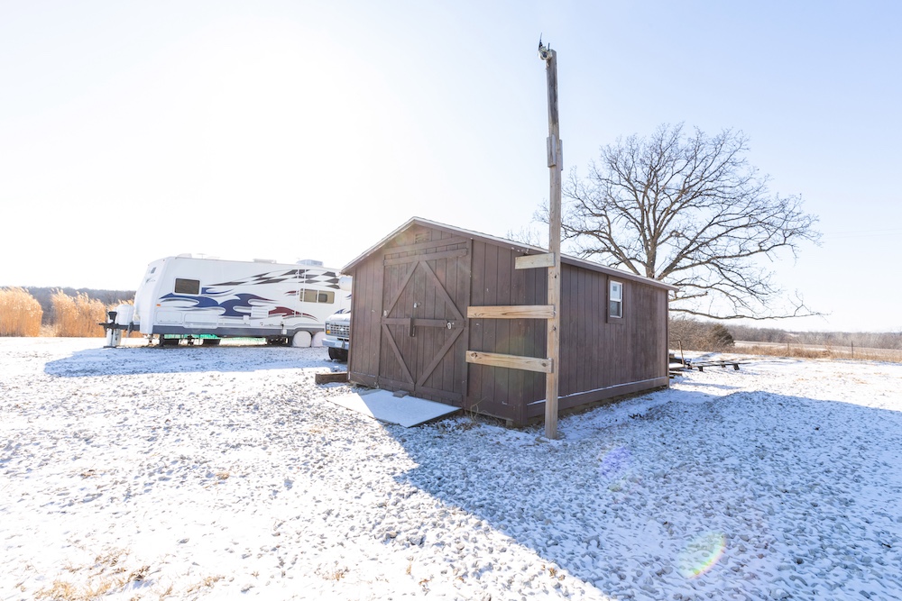 Access further enhances the seclusion. After turning off the gravel road, you cross railroad tracks that naturally limit traffic and result in virtually no road frontage or visibility into the property. As you enter through the gated entrance, you’ll find a level area with electricity and rural water already on site—an excellent location for parking a camper or building a cabin. There is a smaller shed to store tools and hunting equipment as well. This setup allows you to stay on the property without disturbing key hunting areas. Several miscanthus plantings near the entrance provide outstanding screening around the potential campsite.