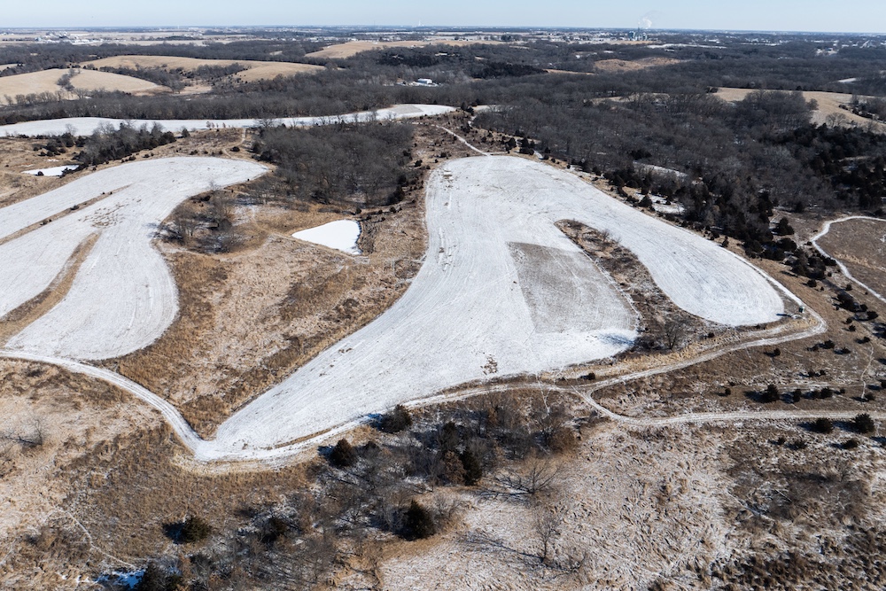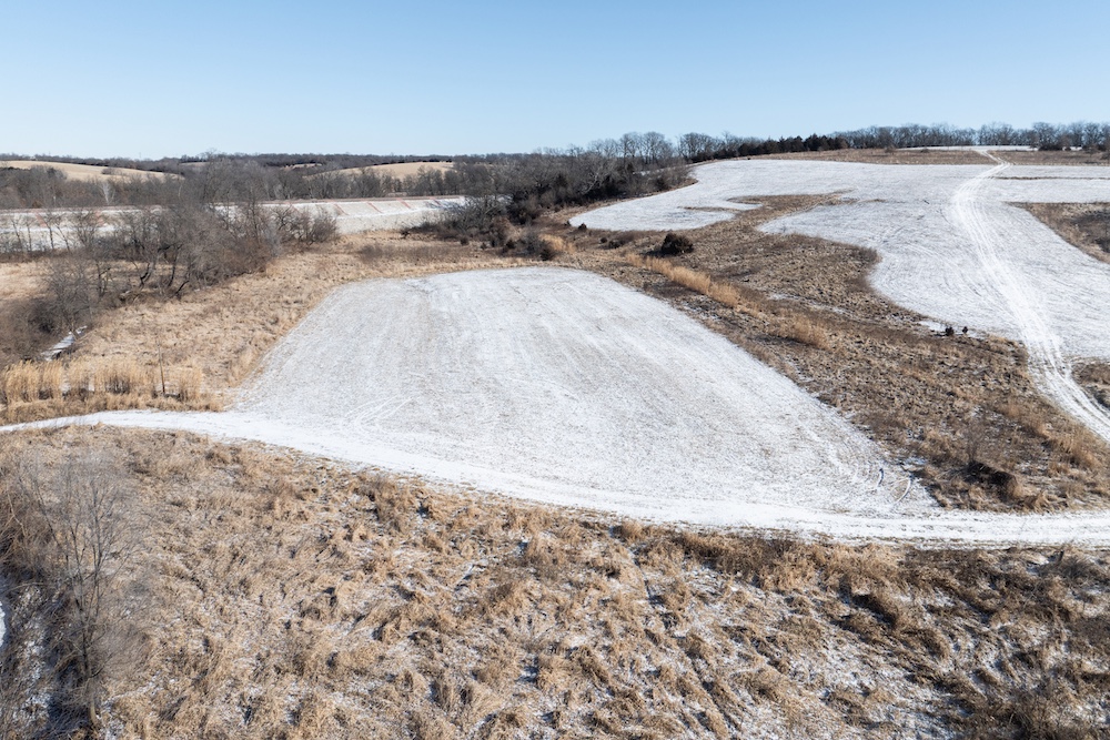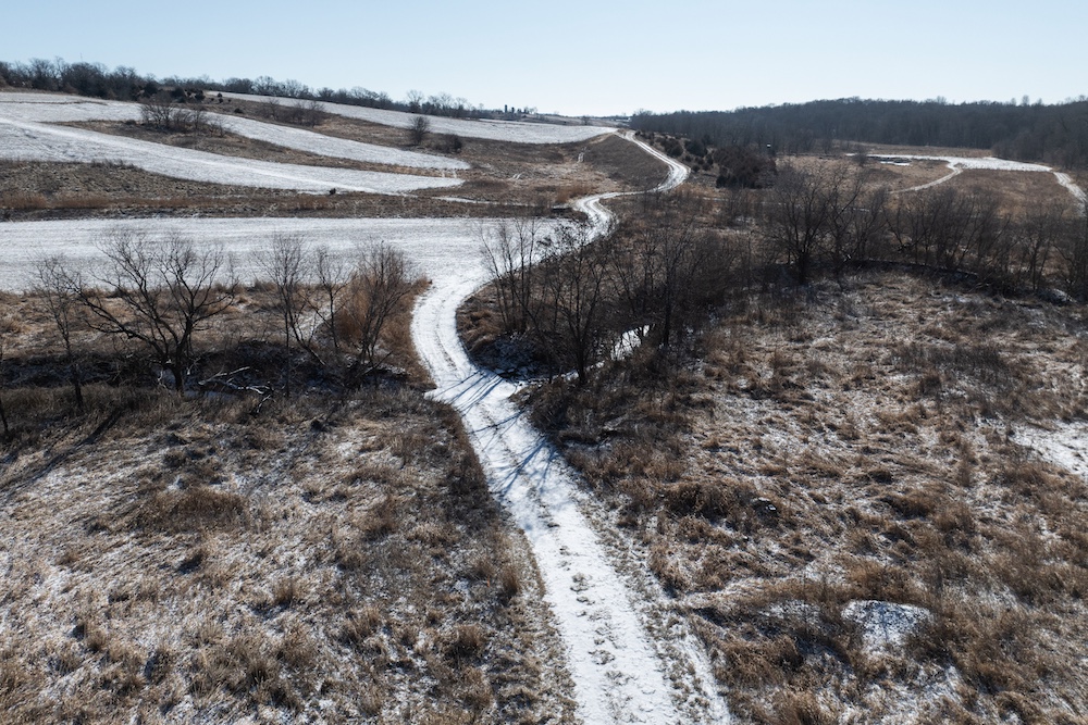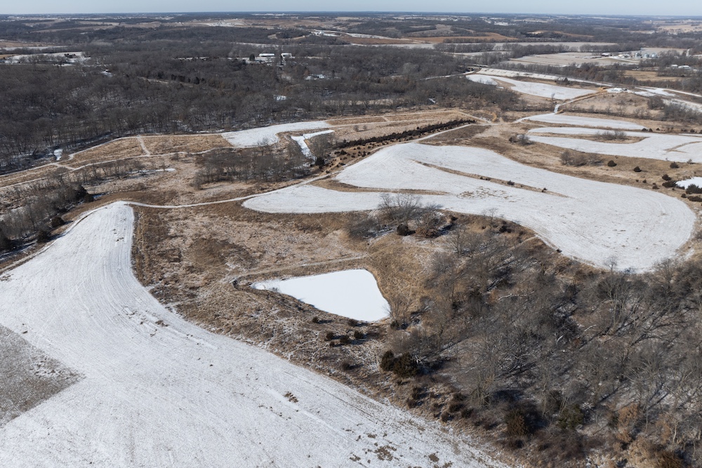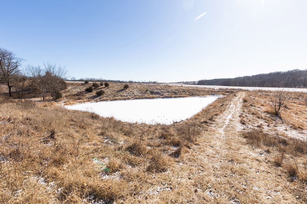 From the entrance, you’ll travel downhill across a concrete creek crossing and onto a well-established trail system that winds throughout the farm. Coal Creek cuts through the southwest corner, providing a seasonal water source, in addition to five ponds across the property—some of which offer excellent fishing opportunities.