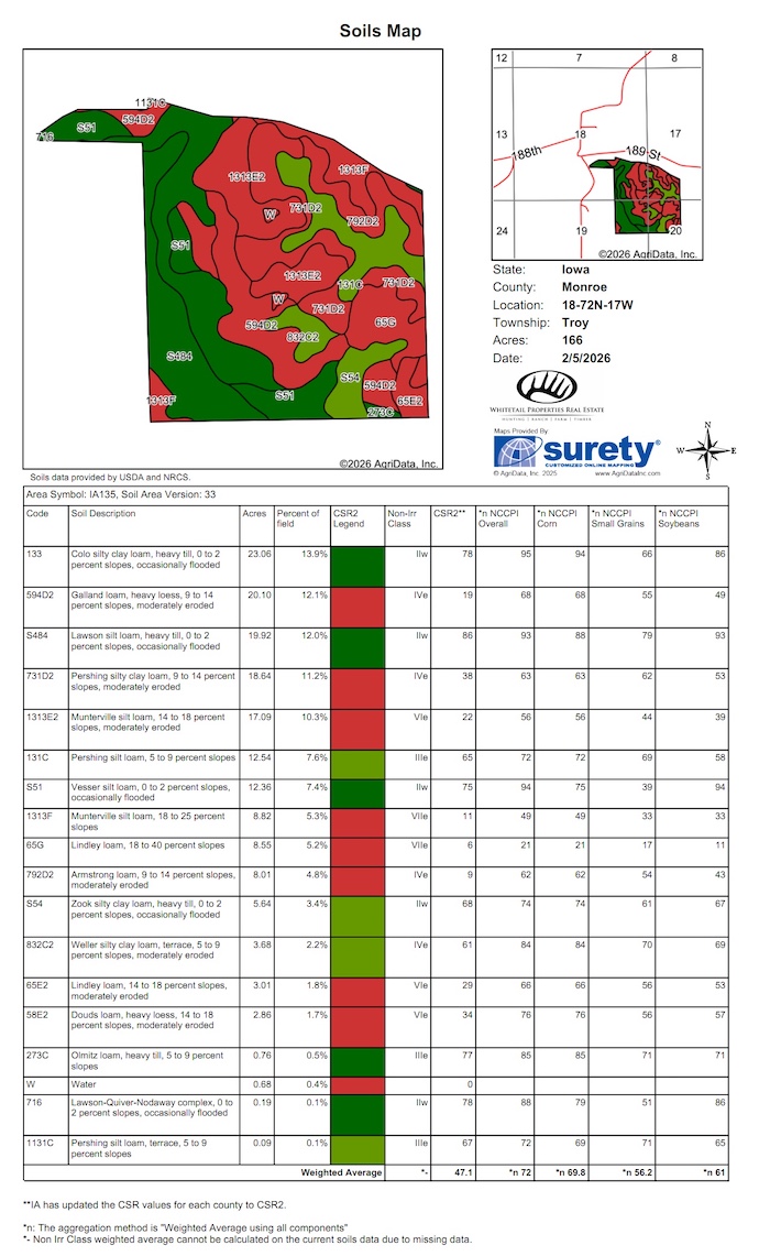 This secluded Monroe County farm is loaded with diverse habitat, including hardwood timber, bottomland timber, native grasses, tillable acres, and multiple ponds. The property is located just a couple of miles west of Albia, 28 miles southwest of Oskaloosa, and approximately 60 miles from the Des Moines metro area. Situated in the heart of one of the most well-known whitetail counties in all of southern Iowa, this is a prime hunting farm with the ideal setup to intercept the kind of giant bucks the area is famous for.