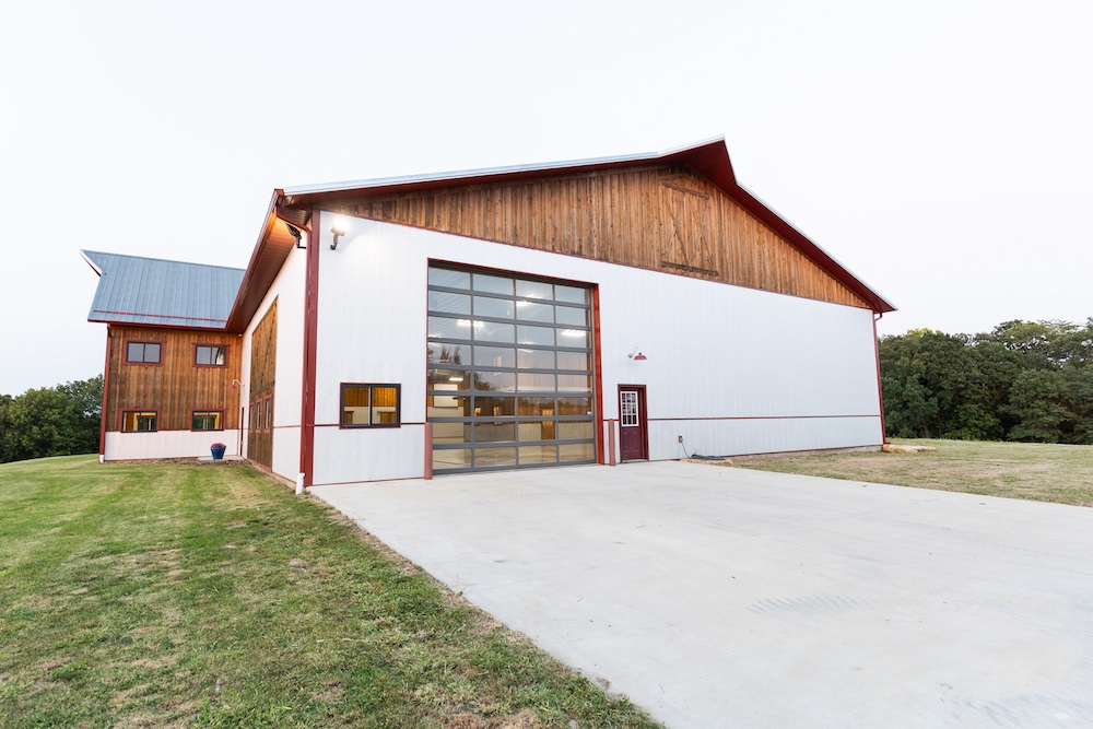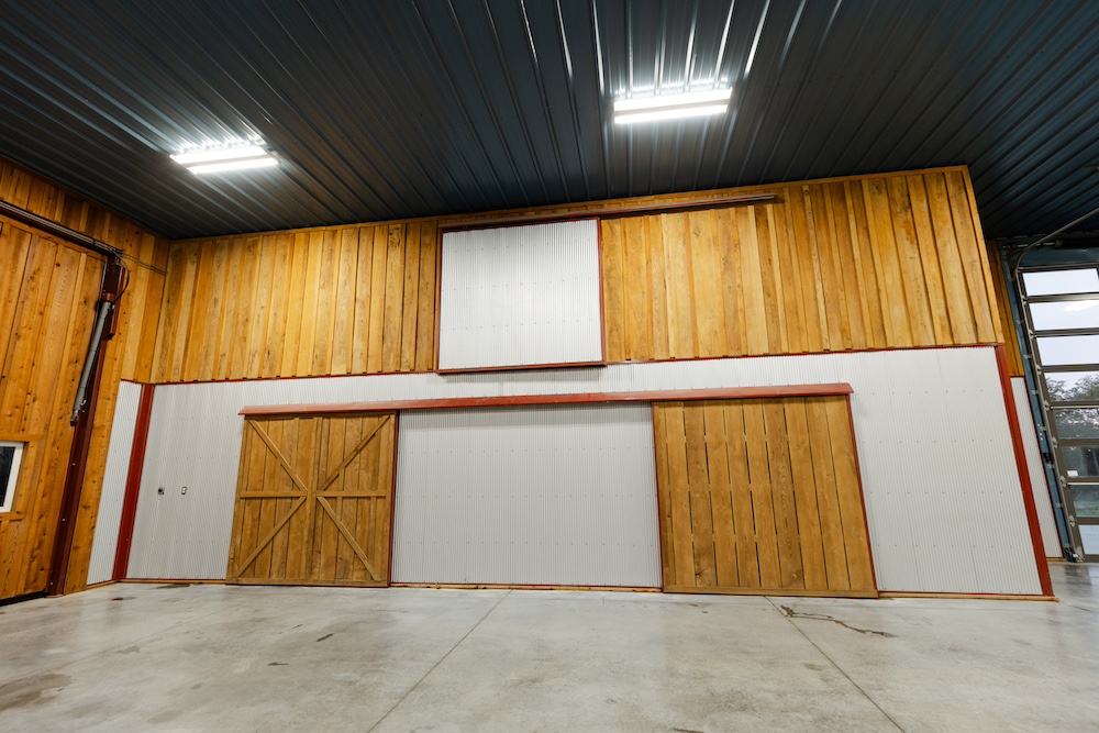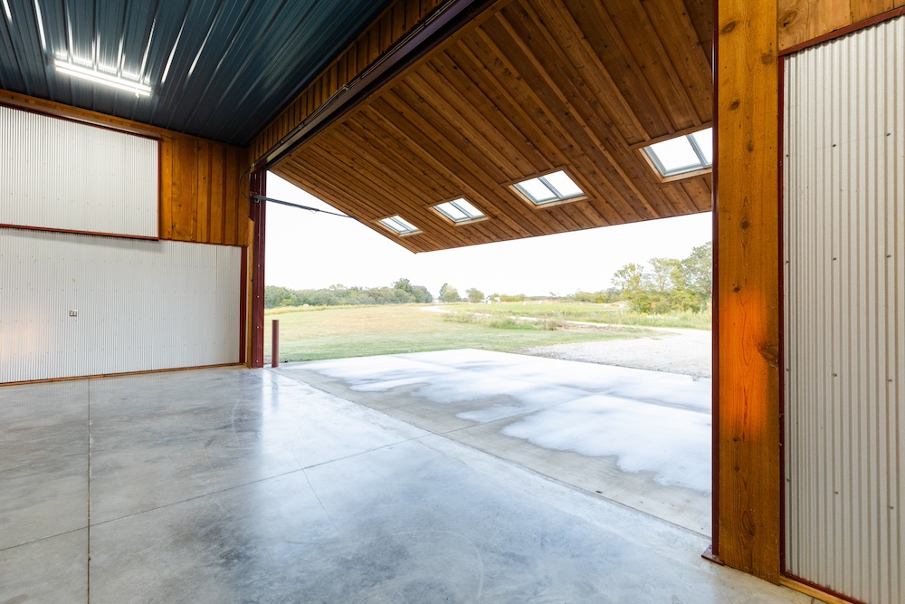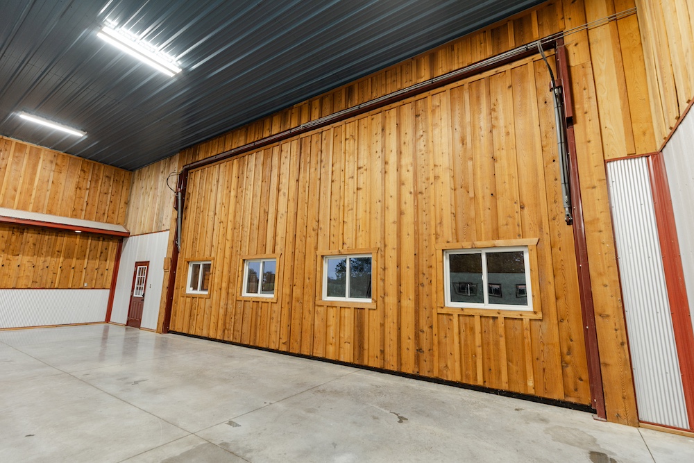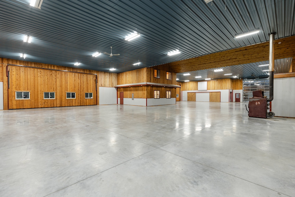 Flanking each side of the living area are two large spaces with 32-foot wide hydro lift doors. The structure is built to last, with extra-thick concrete for holding the heaviest machines, galvanized steel siding, spray foam insulation, and hardwood board-and-batten accents. Utilities include rural water, high-speed fiber internet, and extra electricity to support additional buildings. The ‘barn’ has excellent storage, with ground-level and loft options on both sides to keep tools and other items that can clutter up a shop area hidden. The heavy-duty driveway has a solid rock base and an equipment washing area on the side with a glass overhead door.