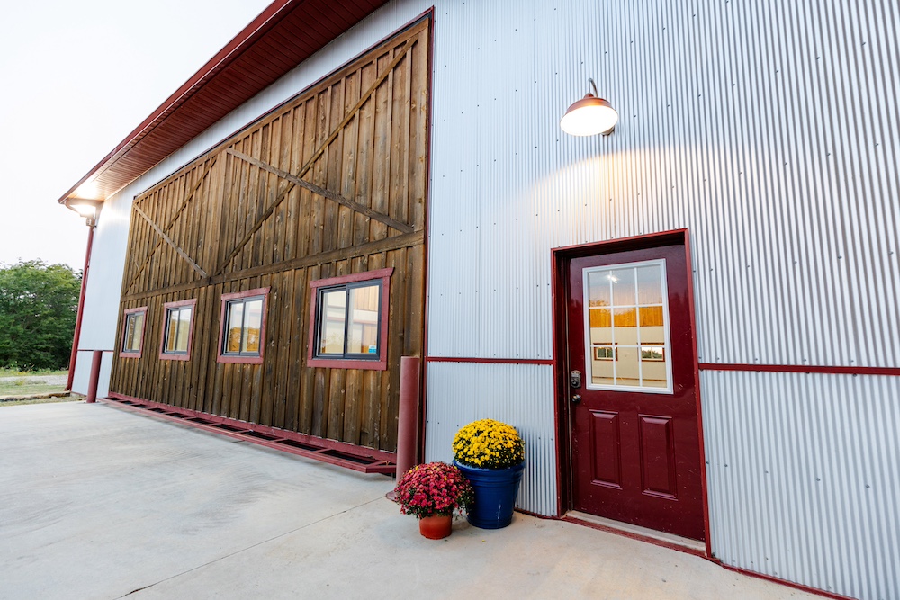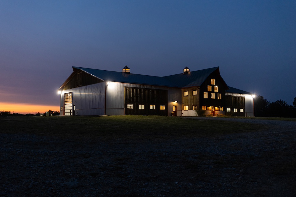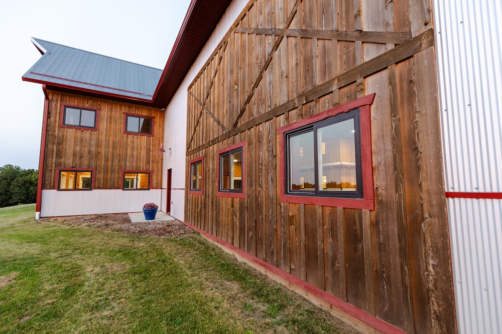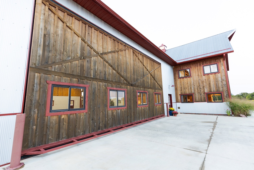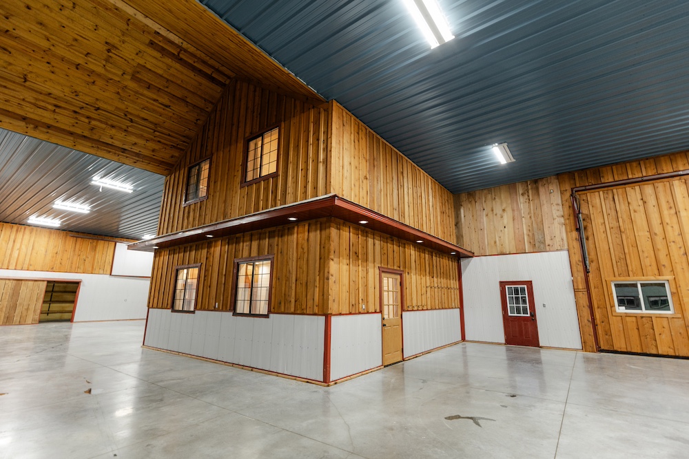 Flanking each side of the living area are two large spaces with 32-foot wide hydro lift doors. The structure is built to last, with extra-thick concrete for holding the heaviest machines, galvanized steel siding, spray foam insulation, and hardwood board-and-batten accents. Utilities include rural water, high-speed fiber internet, and extra electricity to support additional buildings. The ‘barn’ has excellent storage, with ground-level and loft options on both sides to keep tools and other items that can clutter up a shop area hidden. The heavy-duty driveway has a solid rock base and an equipment washing area on the side with a glass overhead door.