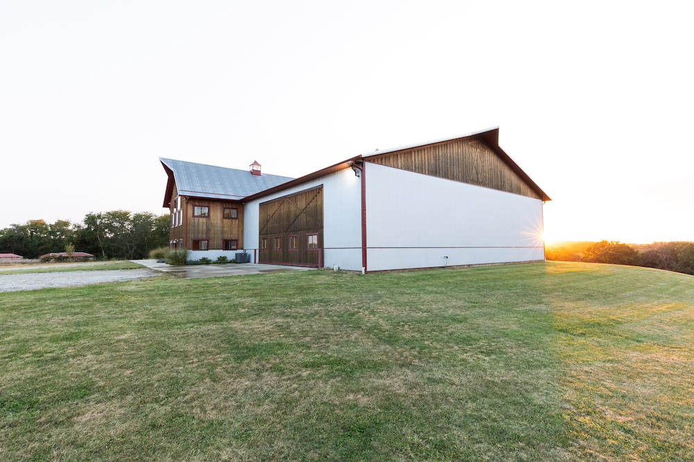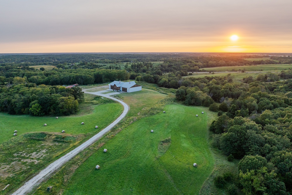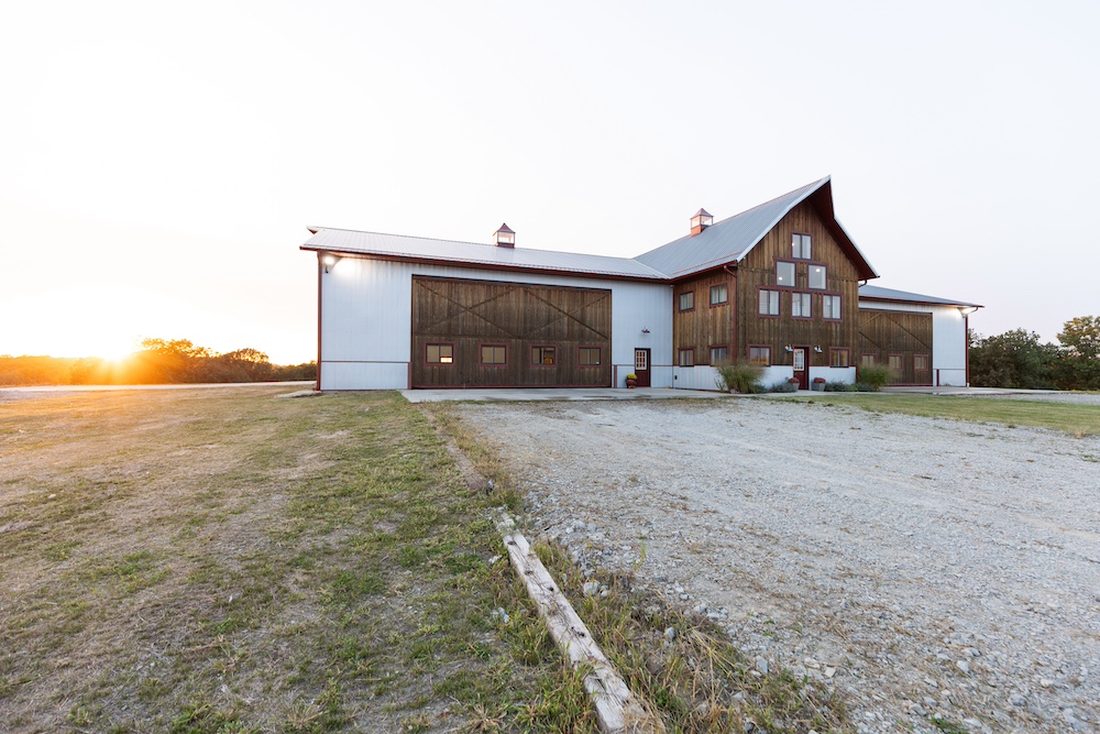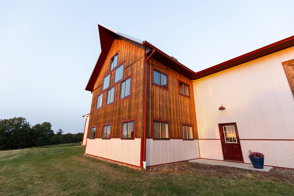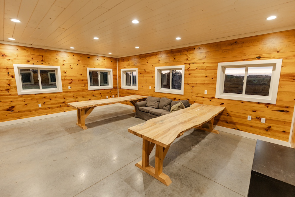 The living area includes three bedrooms, two bathrooms, a family room, and a large kitchen. The beautiful kitchen features marble countertops, quarter-sawn oak cabinets, stainless steel appliances, and a farmhouse sink. Shiplap walls give it a sturdy, timeless feel, and it’s all climate-controlled with a furnace and central air. Each evening, you can enjoy glorious sunsets to end the day, showcasing the beauty of the rolling hills.