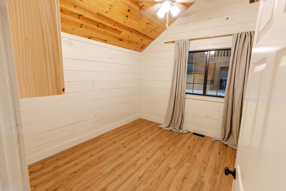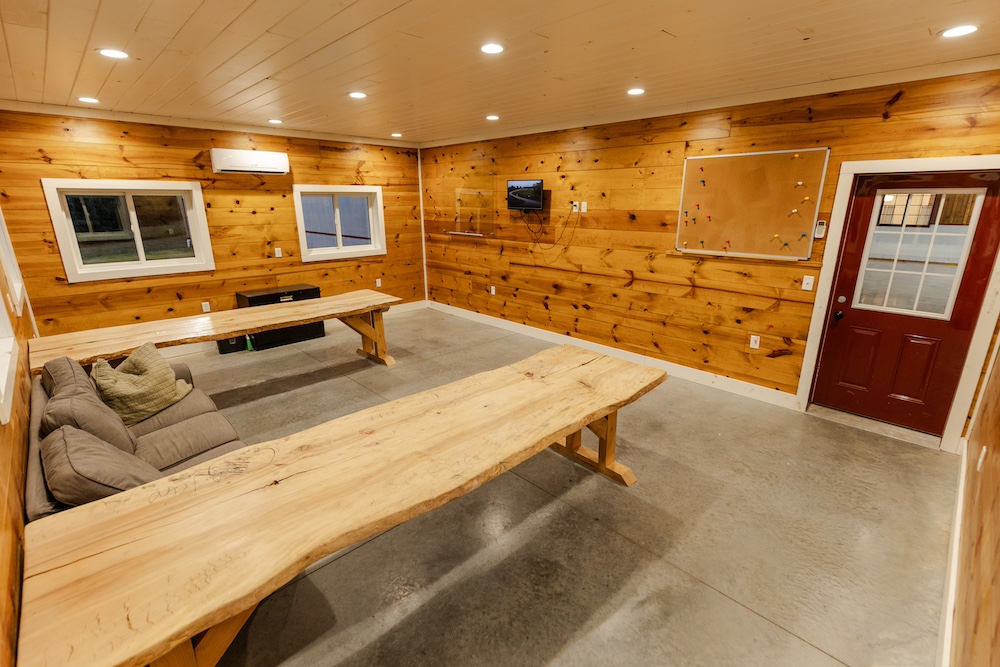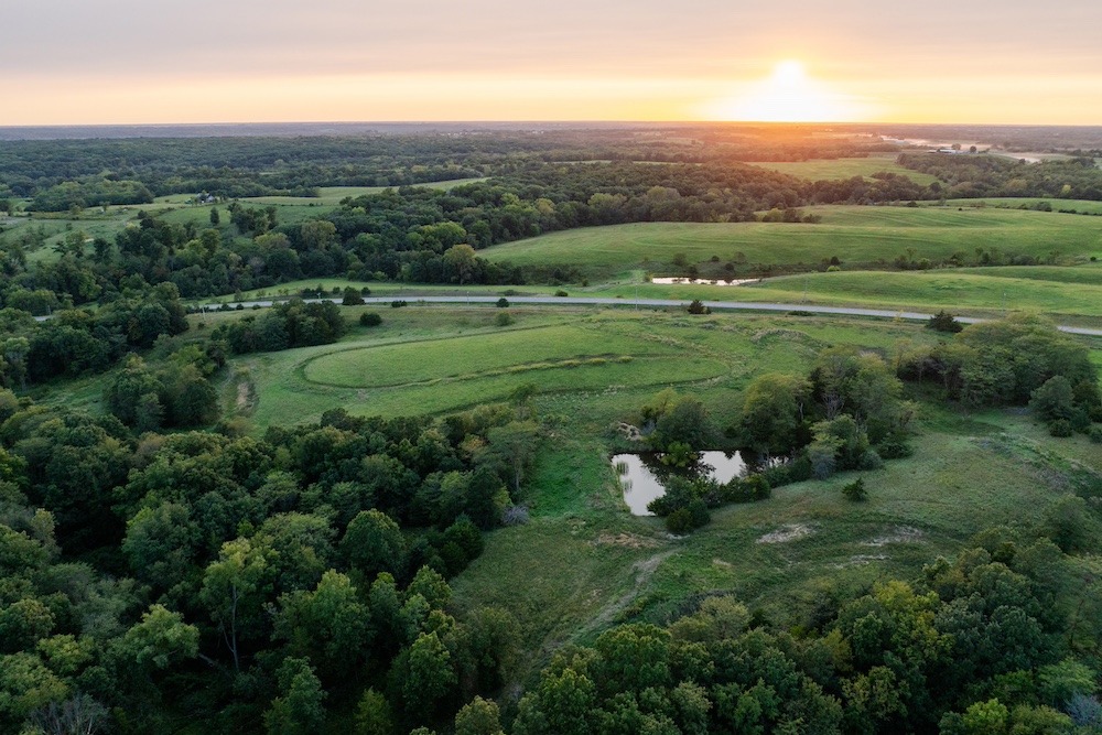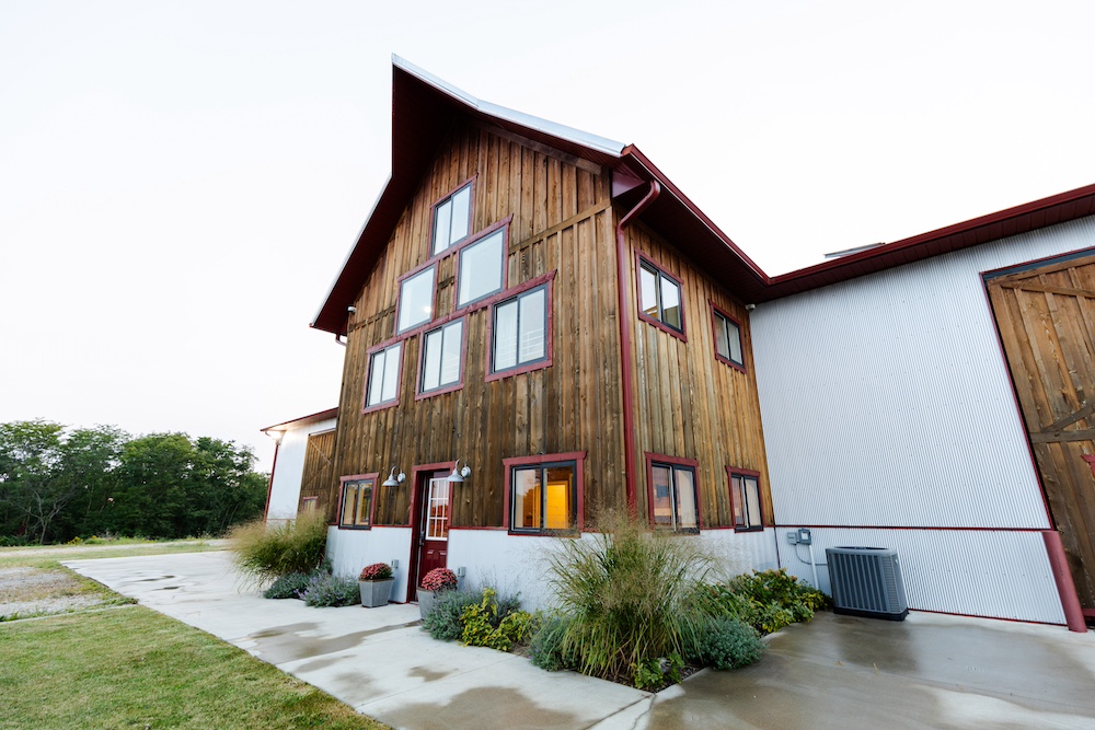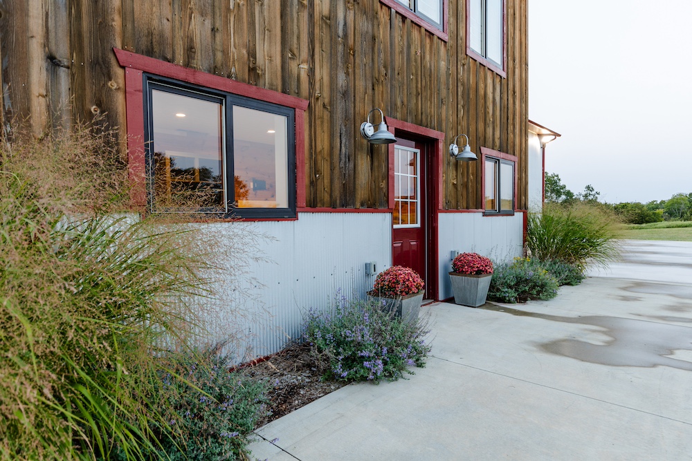 The living area includes three bedrooms, two bathrooms, a family room, and a large kitchen. The beautiful kitchen features marble countertops, quarter-sawn oak cabinets, stainless steel appliances, and a farmhouse sink. Shiplap walls give it a sturdy, timeless feel, and it’s all climate-controlled with a furnace and central air. Each evening, you can enjoy glorious sunsets to end the day, showcasing the beauty of the rolling hills.
