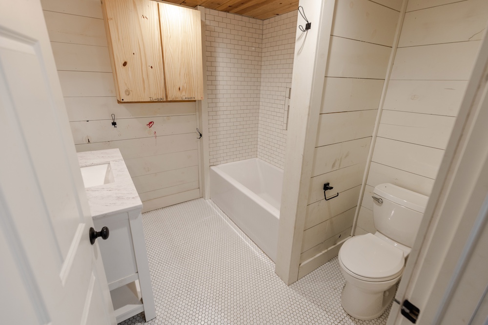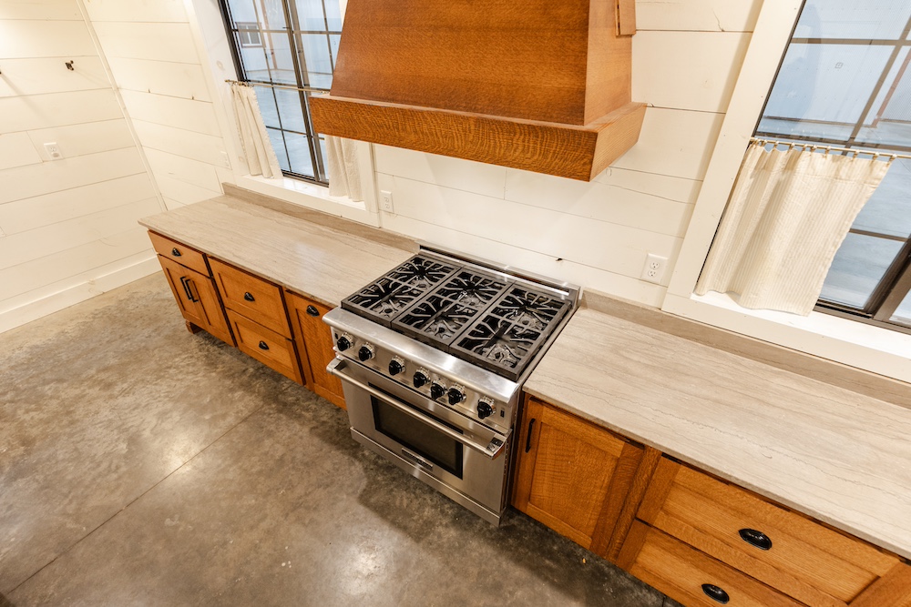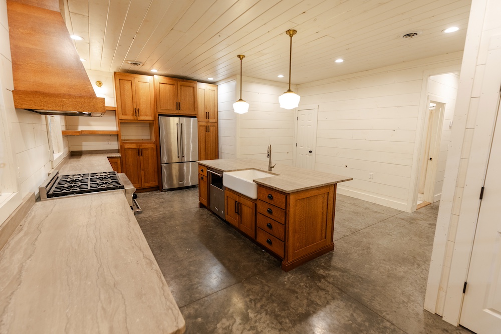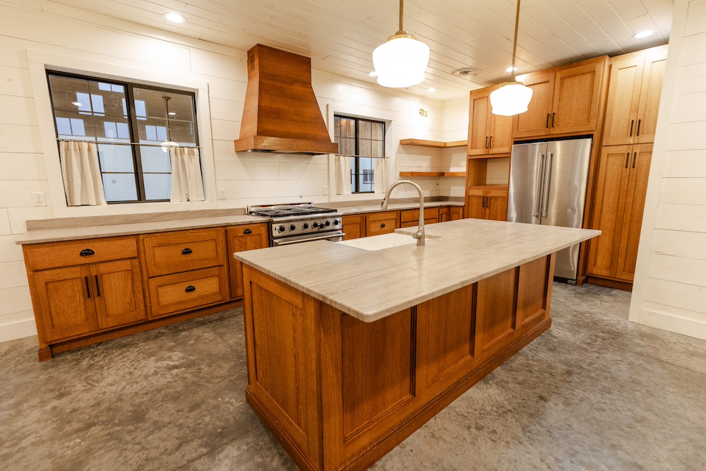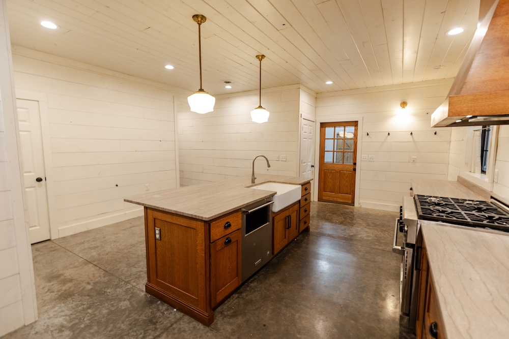 - Marble countertops, oak cabinets, stainless appliances, shiplap walls
