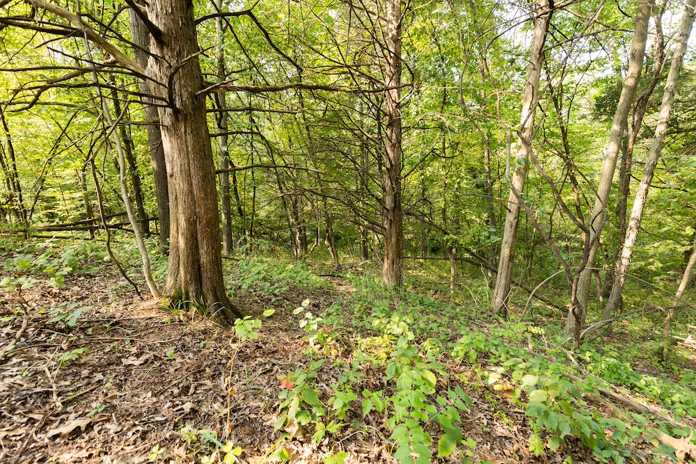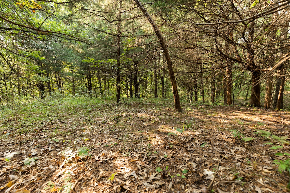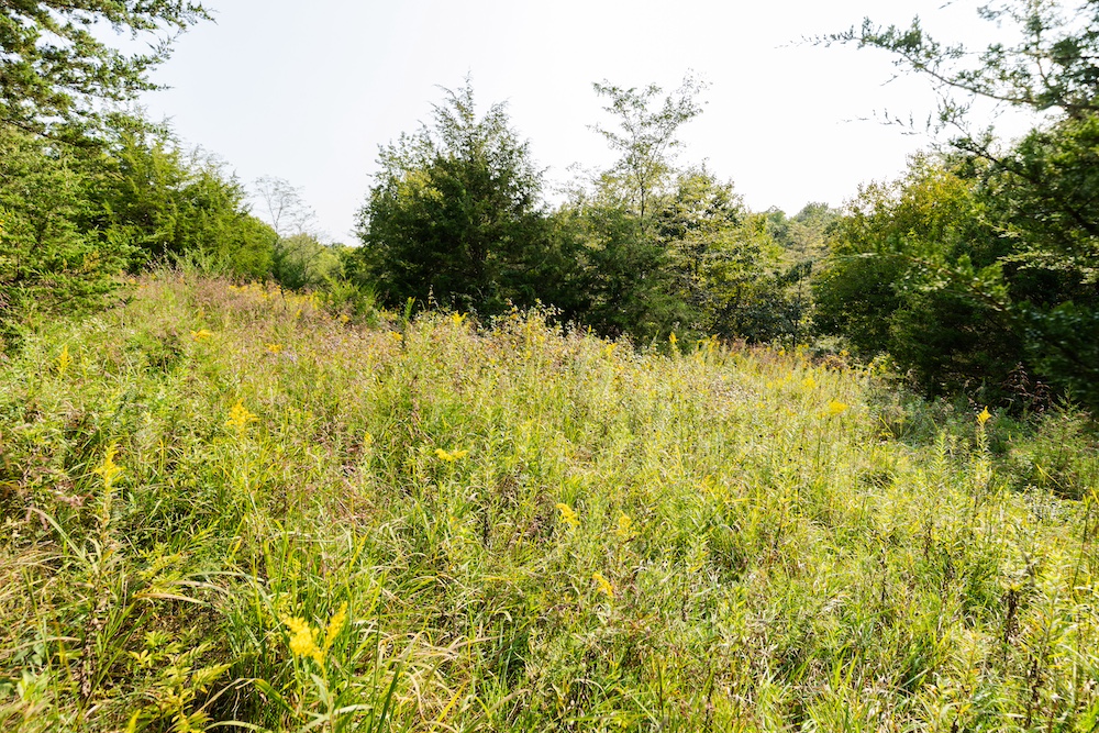 Moving on to the farm, this is an absolutely killer hunting property. It's nearly all south-facing, the terrain you want deer to stay in when the weather gets cold. About 40 acres of open ground, with several secluded coves offering perfect food plot locations. Just south of the building is a completely hidden three-acre field, which would be a dynamite place to have a variety of food sources and set up well for early archery hunting. The cover is thick and diverse, with big hardwood ridges, bedding pockets with brush and scattered cedars, and a creek bottom that flanks the entire west side as it wraps around the property. With this farm layout, if you provide food in the middle of the farm, the deer will stay, allowing you to predict their movement consistently throughout the season.