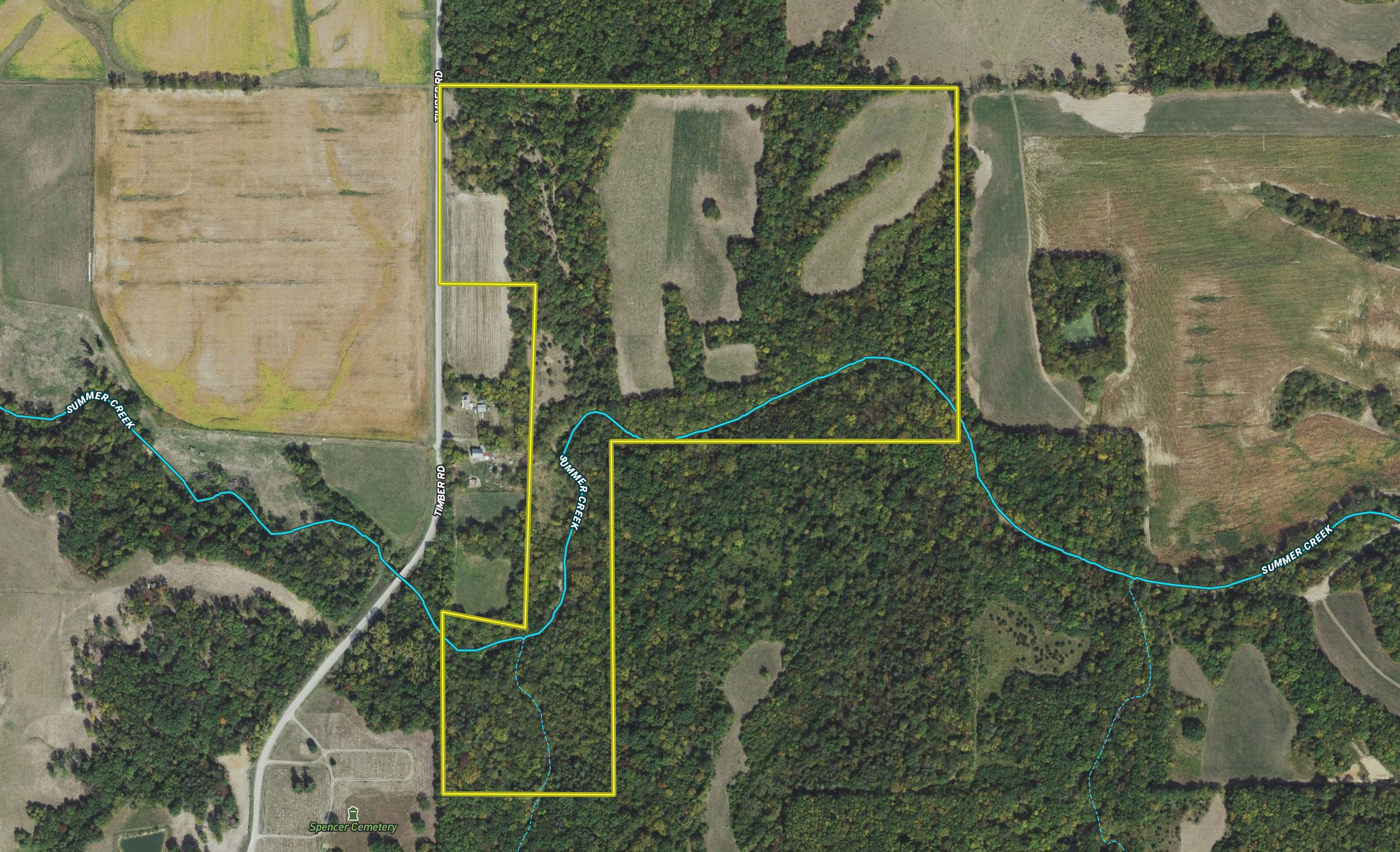 Comprising approximately 50 acres of timber and 20 acres of open ground, the diversity on this property allows for strategic food plot locations, treestand placement, and rut funnels for reliable whitetail hunting. Summer Creek, which flows through the property, is a good water source for the wildlife and creates a travel corridor to hunt.