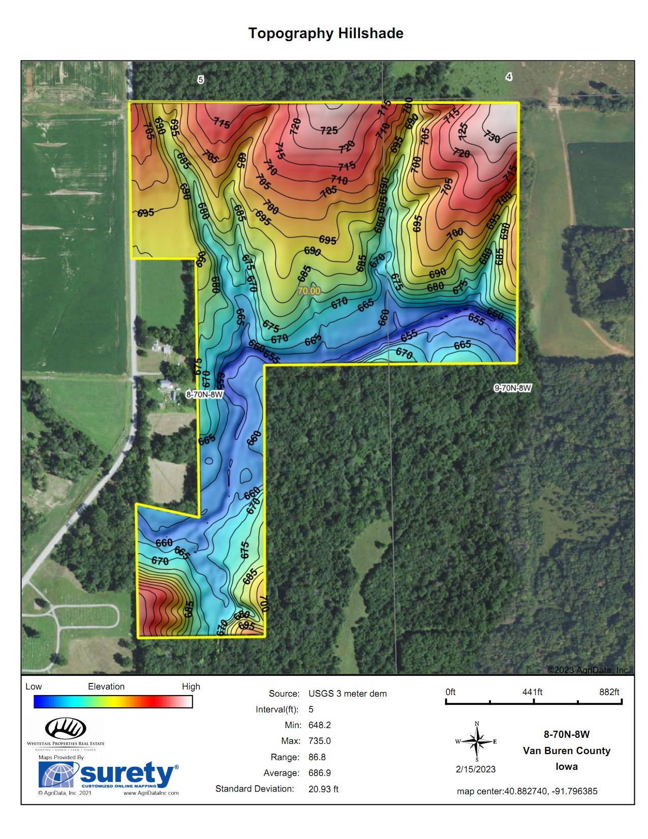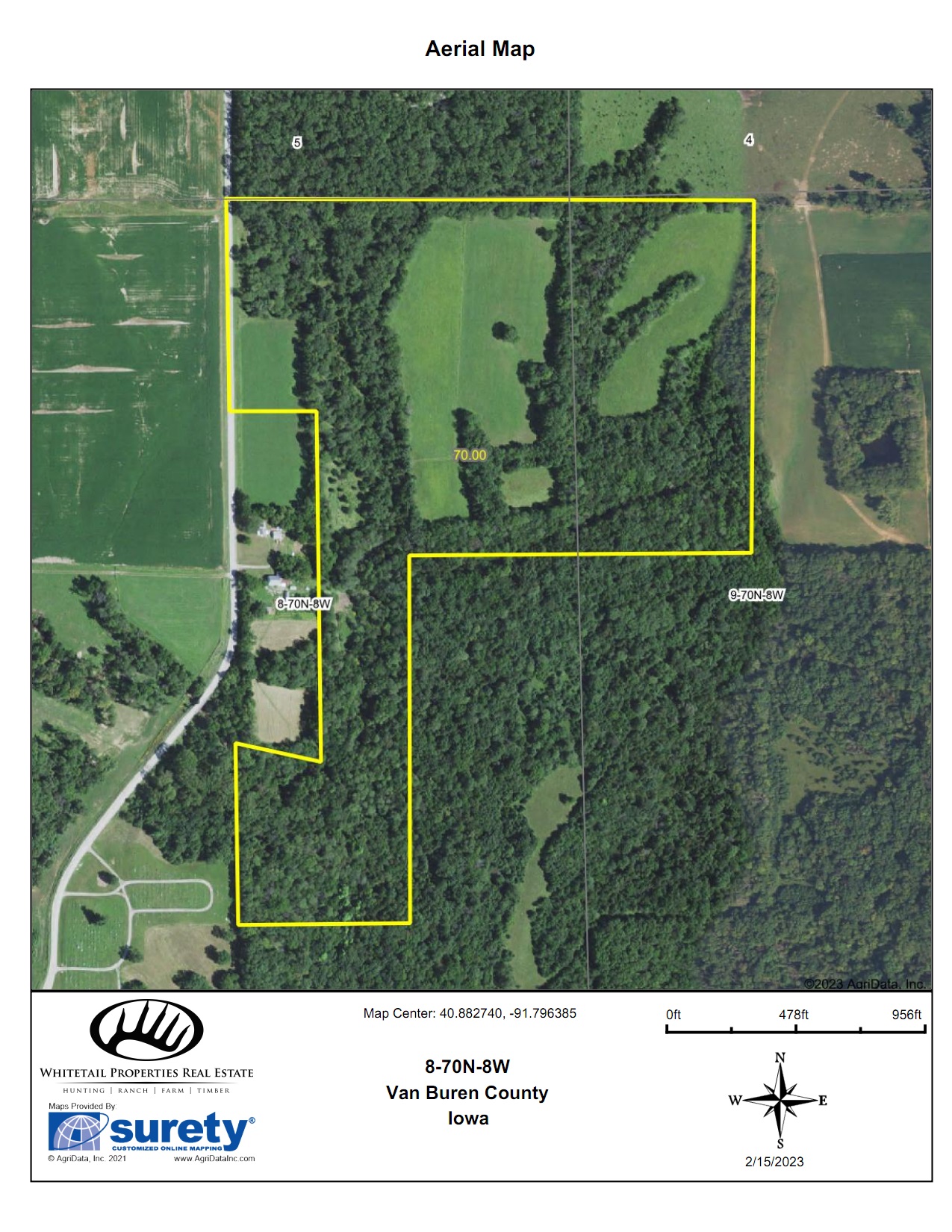 - Acres: 50 ac. m/l of timber, 20 ac. m/l of tillable