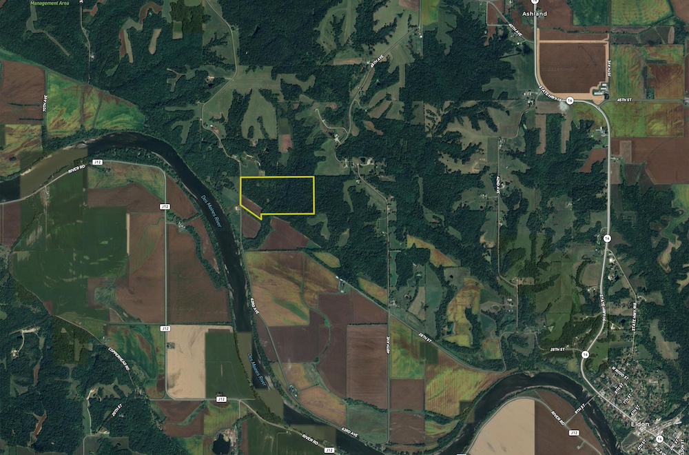 Located in the hills along the Des Moines River, this 78-acre hunting property is ideal for serious whitetail hunters who want to be in a proven deer management area. With 72 acres of hardwood timber, 6 acres of tillable, and a well-documented history of mature bucks, this land offers exceptional deer hunting—please check out the impressive trail camera history! The landscape features south-facing hillsides, hardwood ridges, secluded timber plots, fertile bottomland tillable, and a good building site.