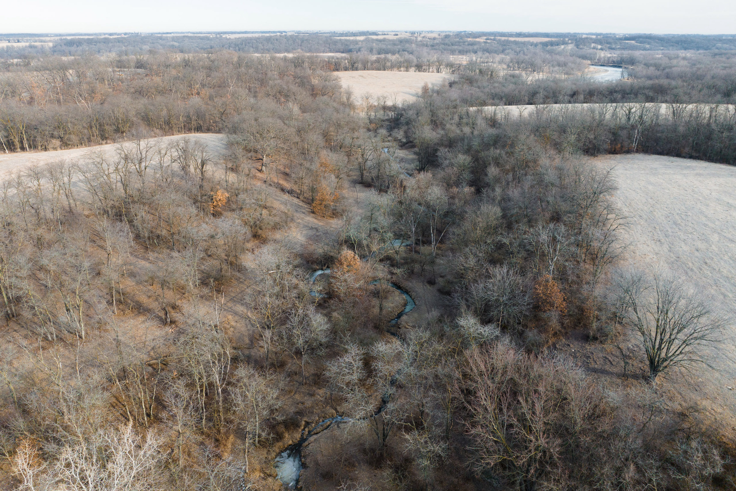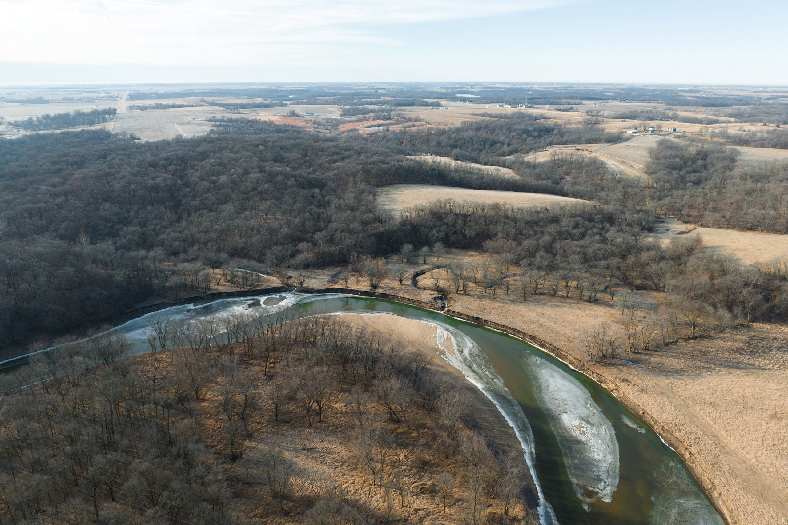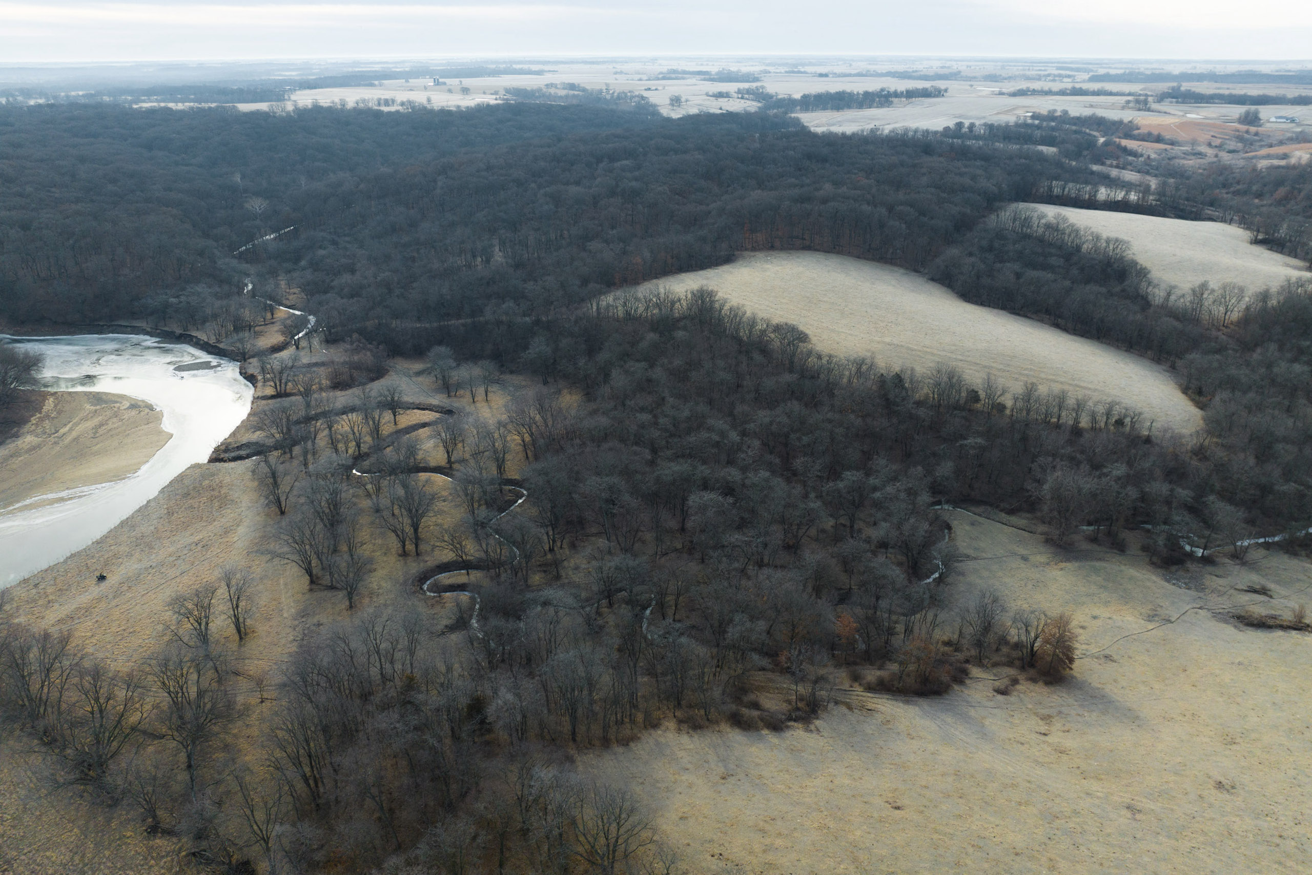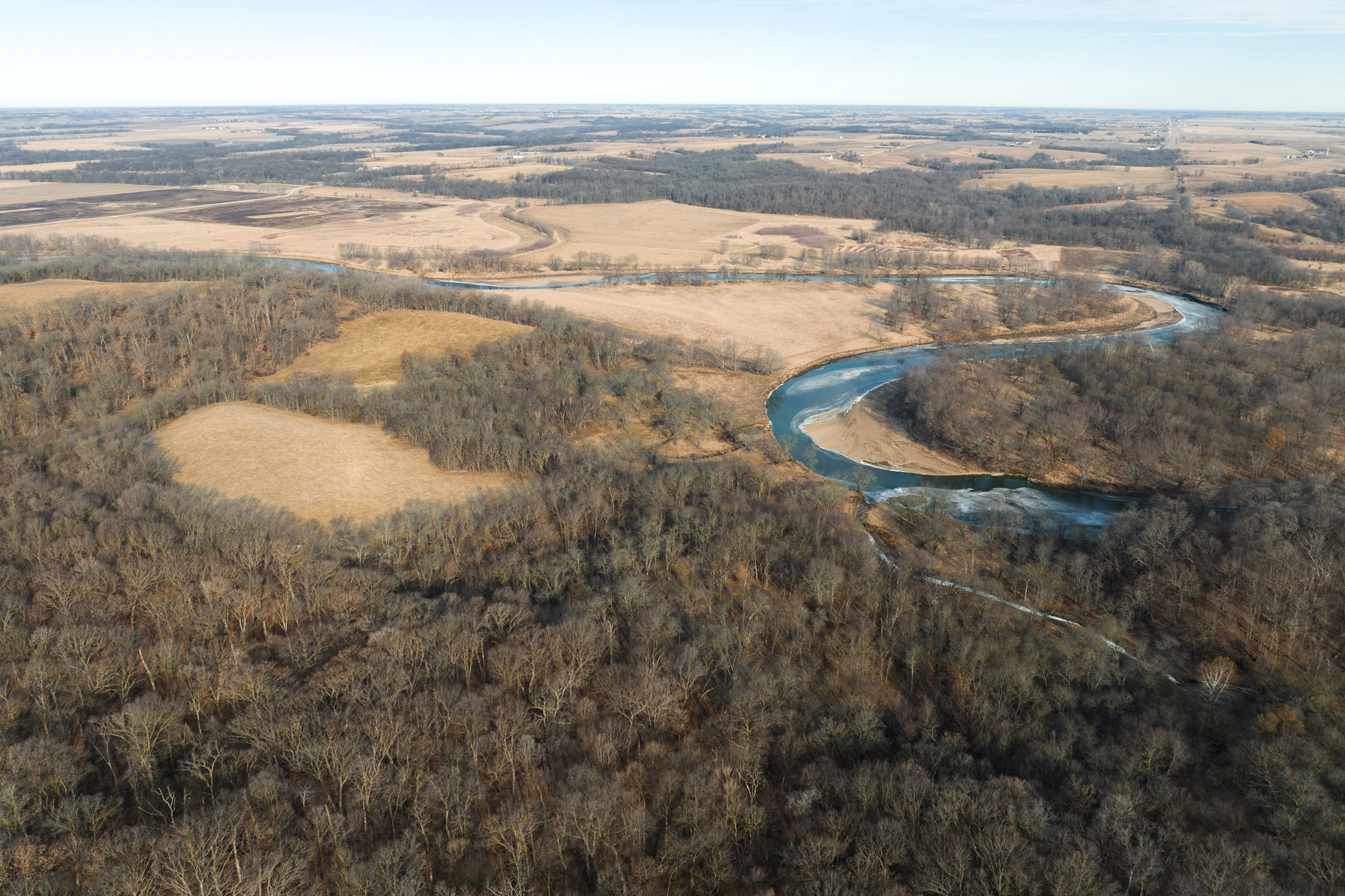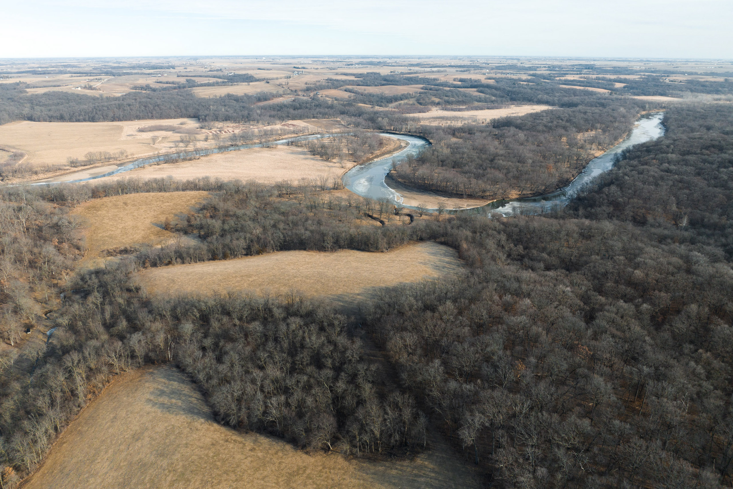 This scenic farm lies next to a solid forest of no-hunting wildlife sanctuary; northwest of Brighton, among the hills of the notorious Skunk River. The rolling topography, open pasture, tillable potential, timber, and river frontage are all ingredients to its desirable landscape. It borders Brinton Timber, a 320-acre county park that is a refuge for the neighboring wildlife because no hunting is allowed. This is an exclusive advantage for those who want to manage land for the trophy whitetails of southeast Iowa.