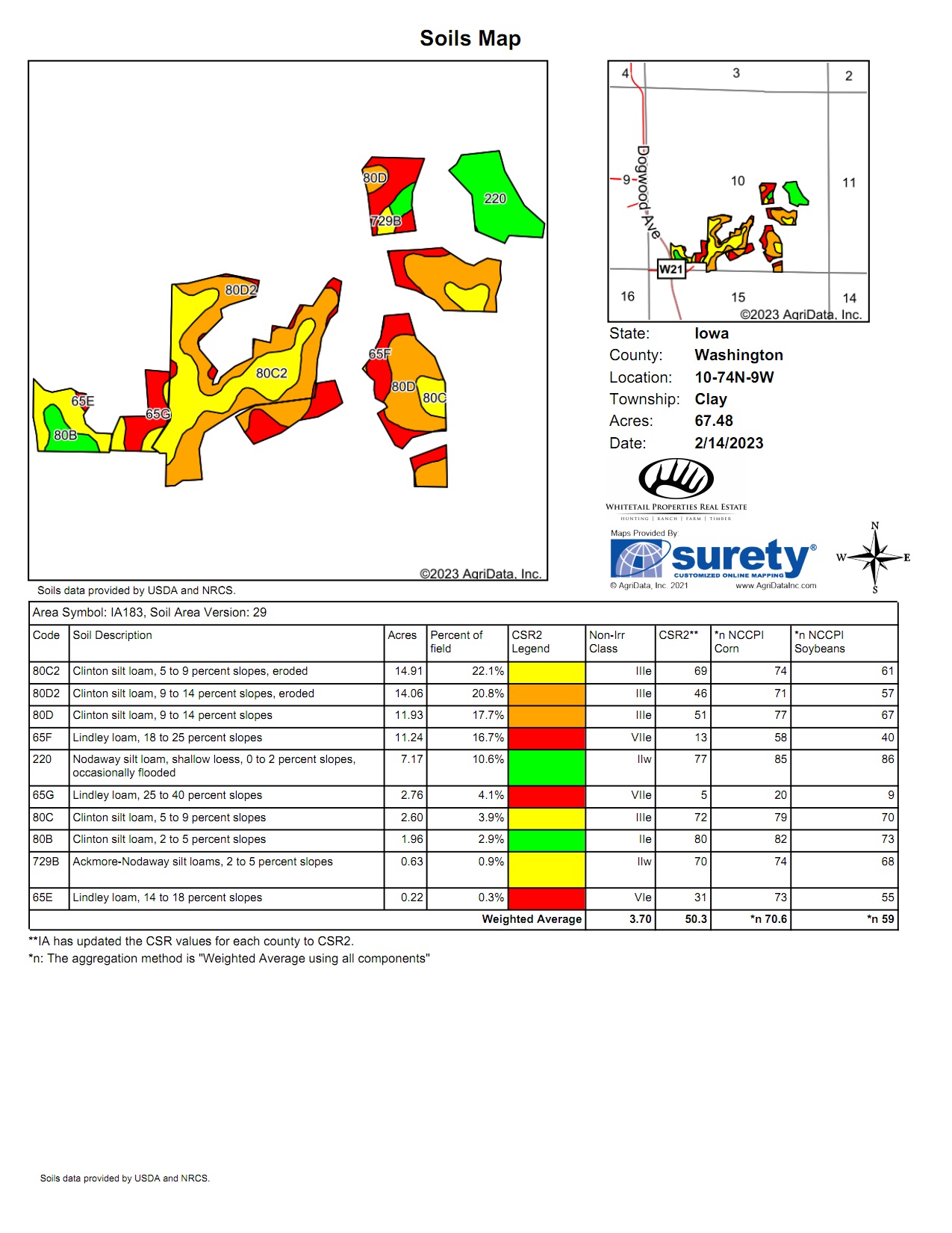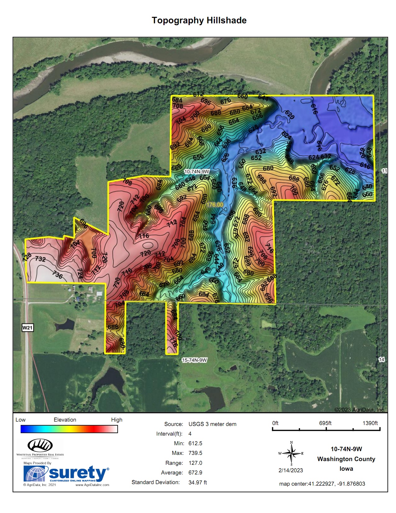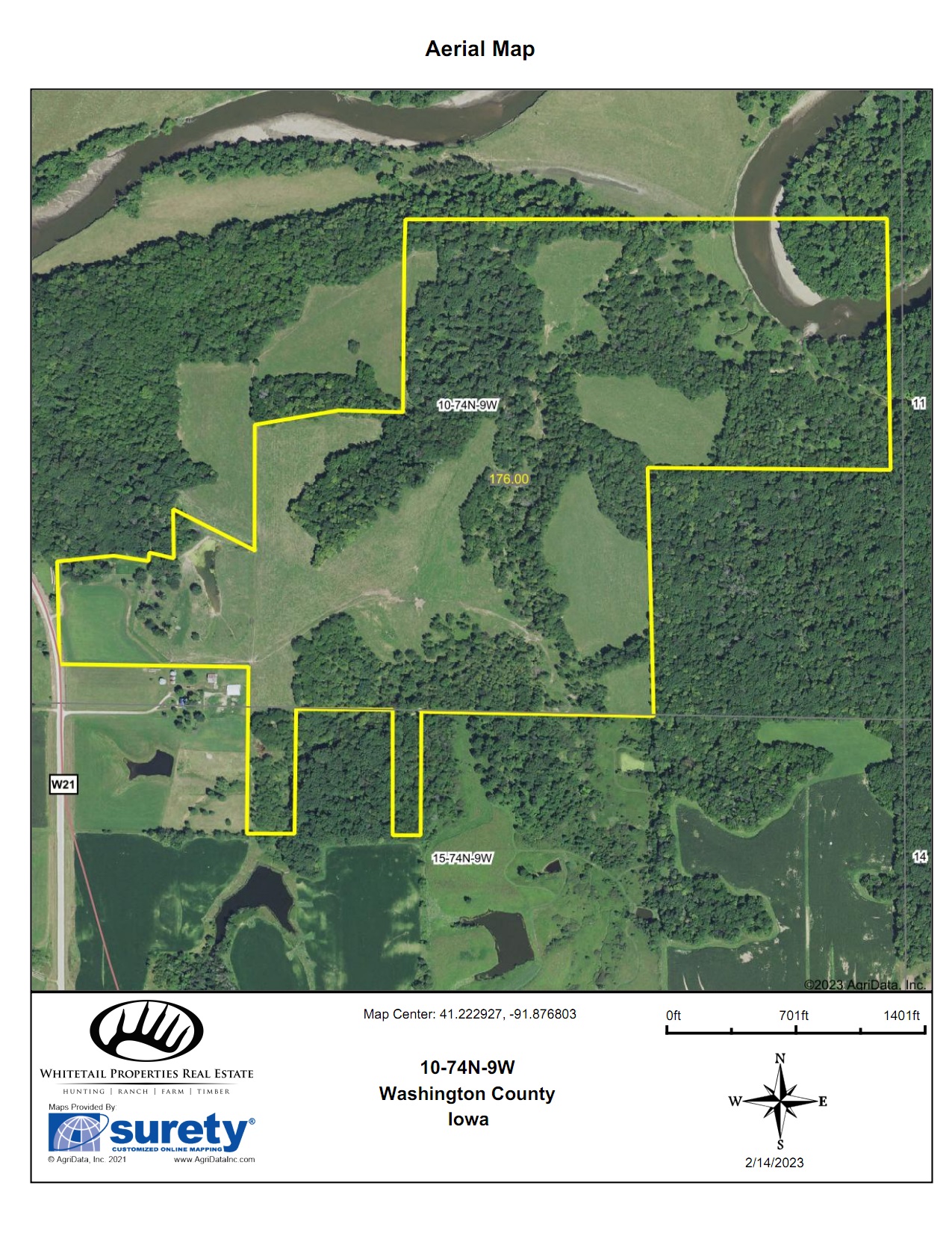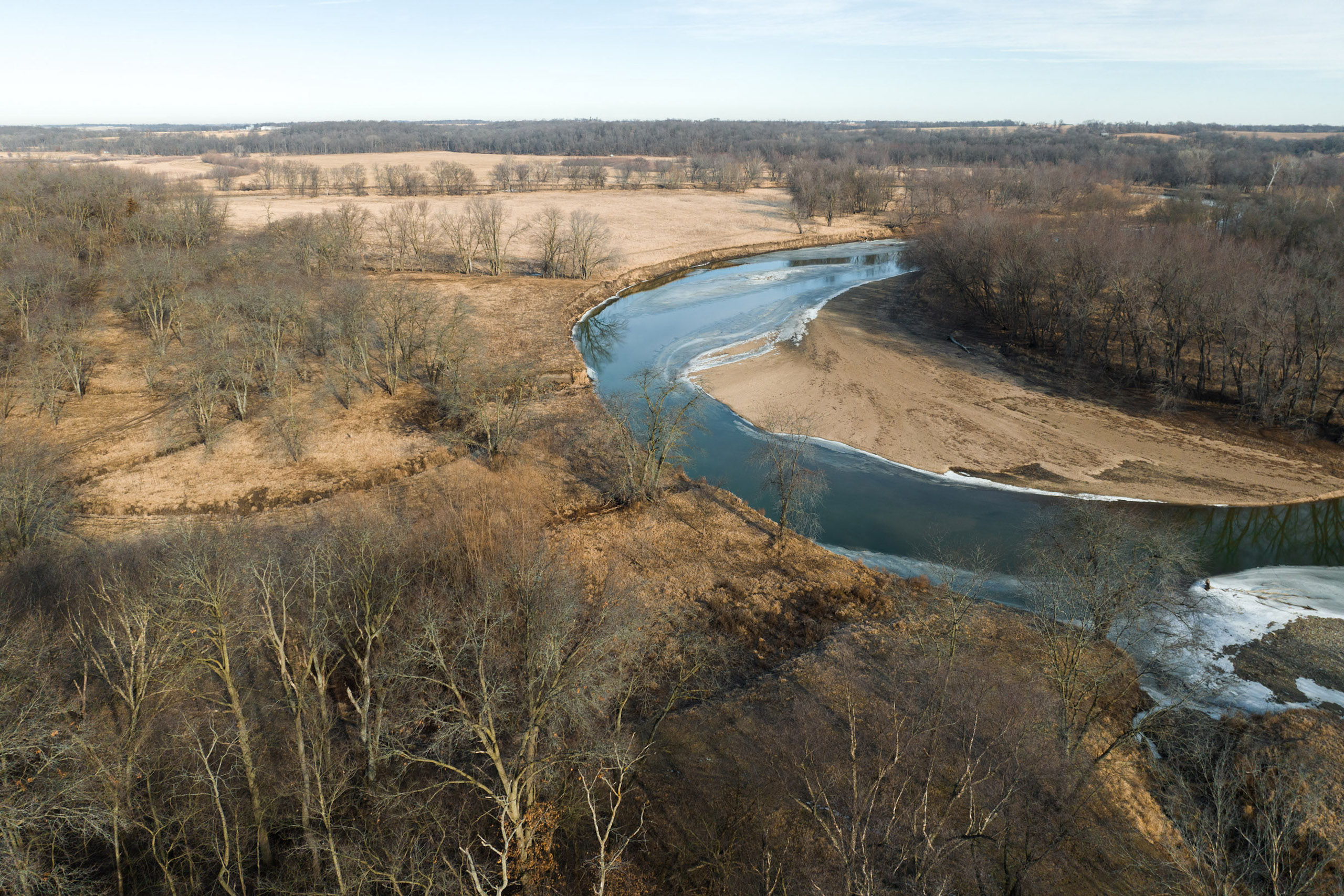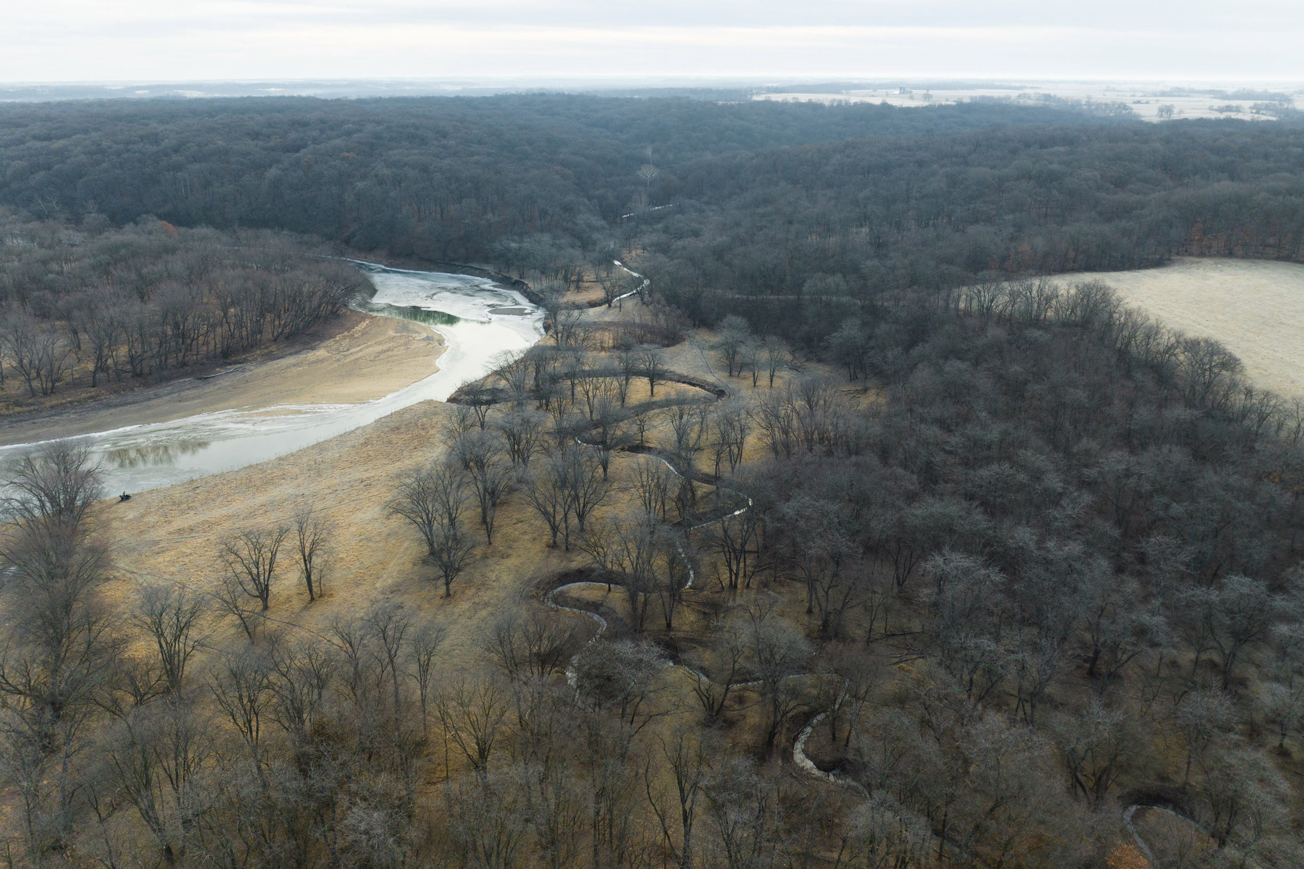 This scenic farm lies next to a solid forest of no-hunting wildlife sanctuary; northwest of Brighton, among the hills of the notorious Skunk River. The rolling topography, open pasture, tillable potential, timber, and river frontage are all ingredients to its desirable landscape. It borders Brinton Timber, a 320-acre county park that is a refuge for the neighboring wildlife because no hunting is allowed. This is an exclusive advantage for those who want to manage land for the trophy whitetails of southeast Iowa.