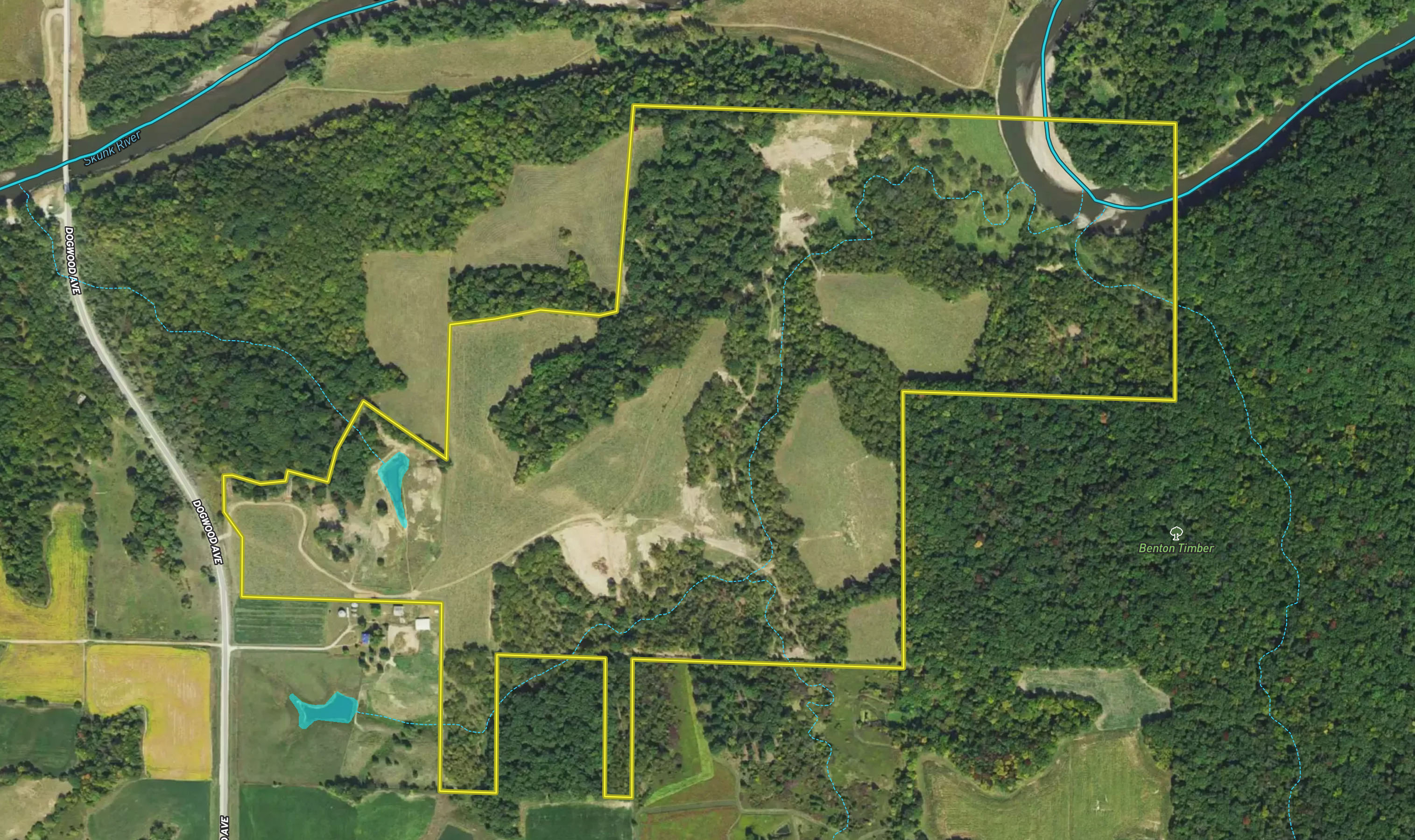 - Has it all - income acres, pond, building sites, amazing hunting, spring-fed creek, topography, and Skunk River frontage