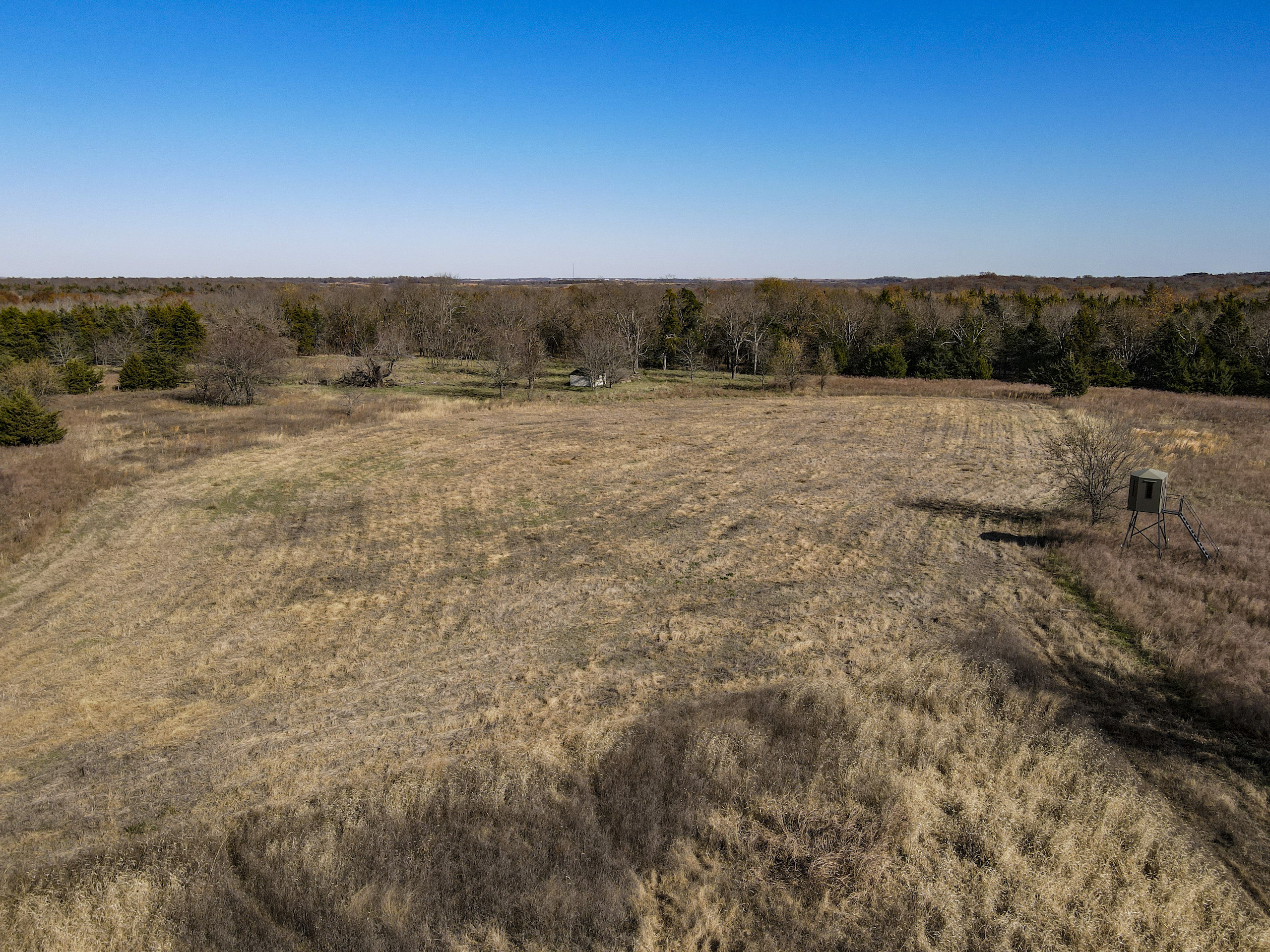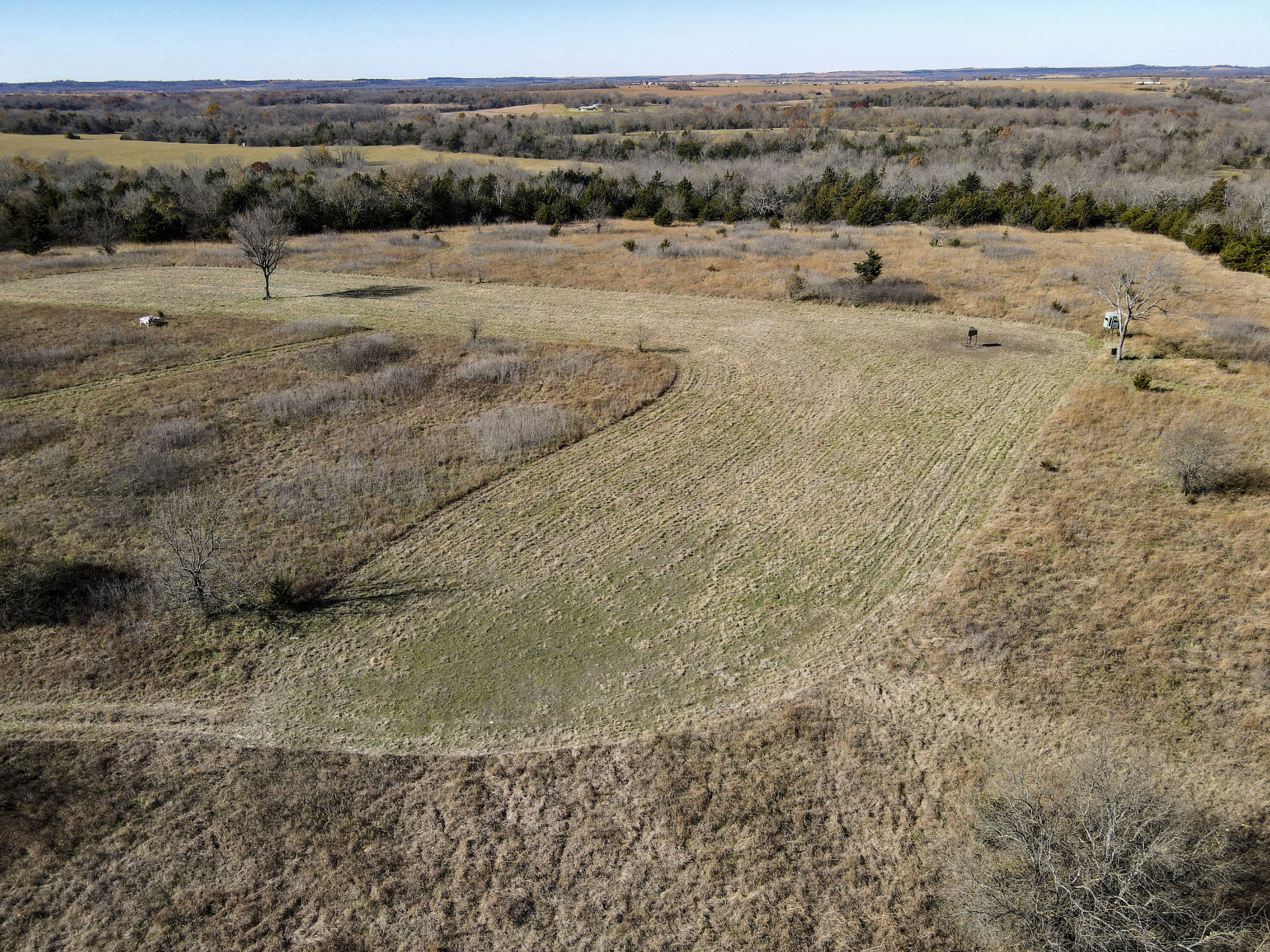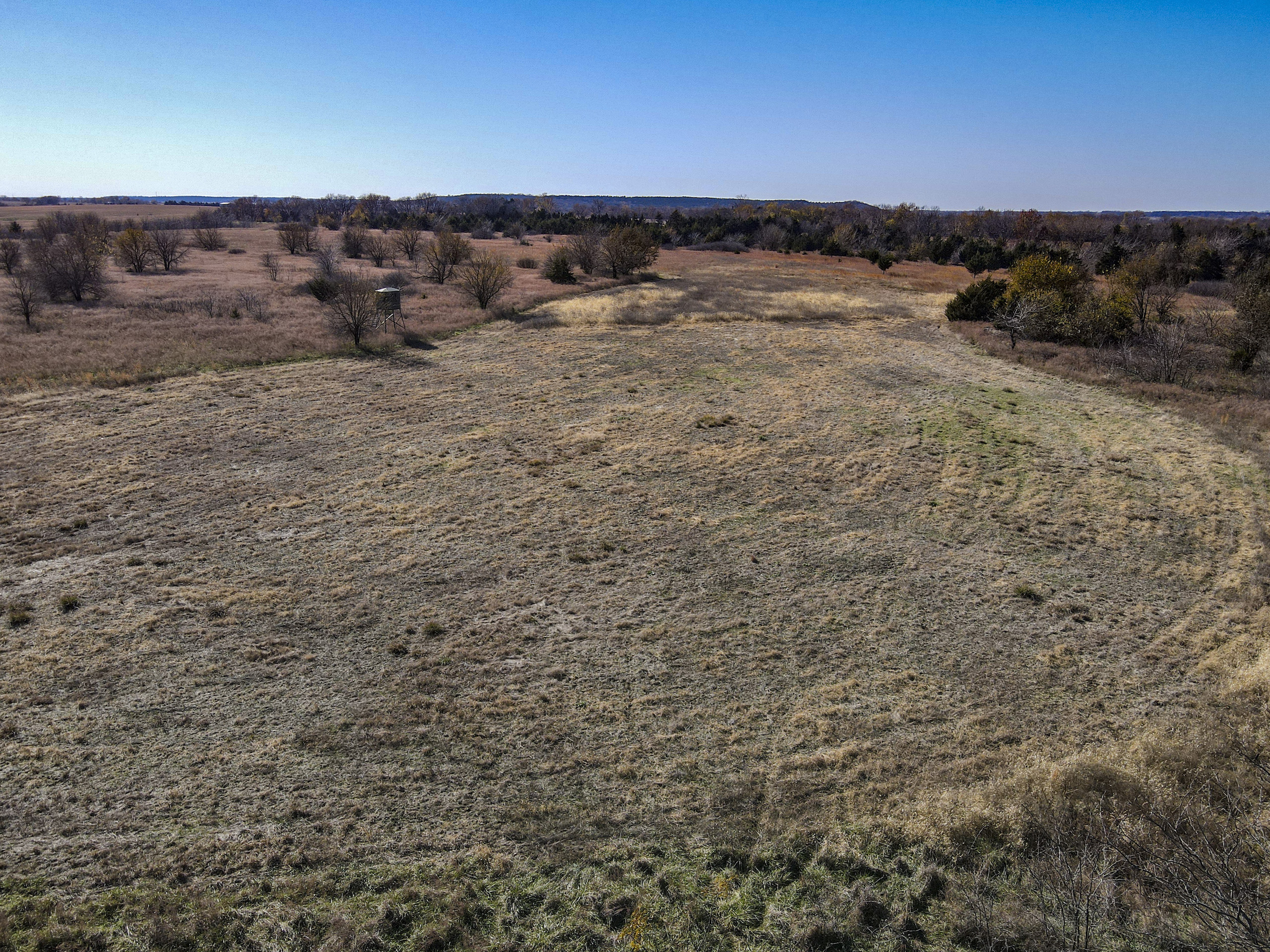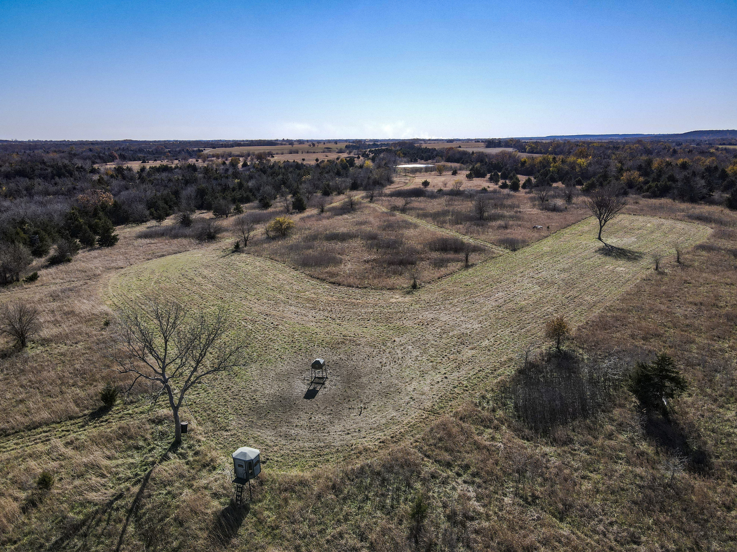 Situated within a carefully managed area for high-end mature deer these 120 acres are conveniently located near the Anderson and Linn County line. With years of no grazing and limited pressure, this farm is flush with brushy areas, quality stand of native grass, and several deep pockets of larger timber. Timber habitat includes a wide range of hardwood trees including big cedars, oaks, sycamore, and some walnuts. The more open areas are thick with small brush and plum thickets with cedars mixed in making for excellent bedding for deer and other wildlife and birds. There are several blinds, feeders, and food plots that have been maintained by the current owner and the hunt spots are easily accessible from a consistently mowed trail system. There are also several small springs that feed a few small ponds that are great for the wildlife and certainly would see a few ducks to set in over the fall months. This general area, which is SW of Centerville and NE of Kincaid, is just a touch over an hour from Olathe and the south KC metro area. Known for excellent deer and turkey hunting, this part of Kansas has seen a high demand for good recreational tracts this size and the availability of listings is limited. There is also excellent county road access and nice views from possible build sites and yet the farm still maintains limited road frontage. Electric does run along 1100 Road on the southern property border so it is likely availability would be there for a cabin or homesite if so desired. Please contact the listing agent if you wish to schedule a viewing of this property.