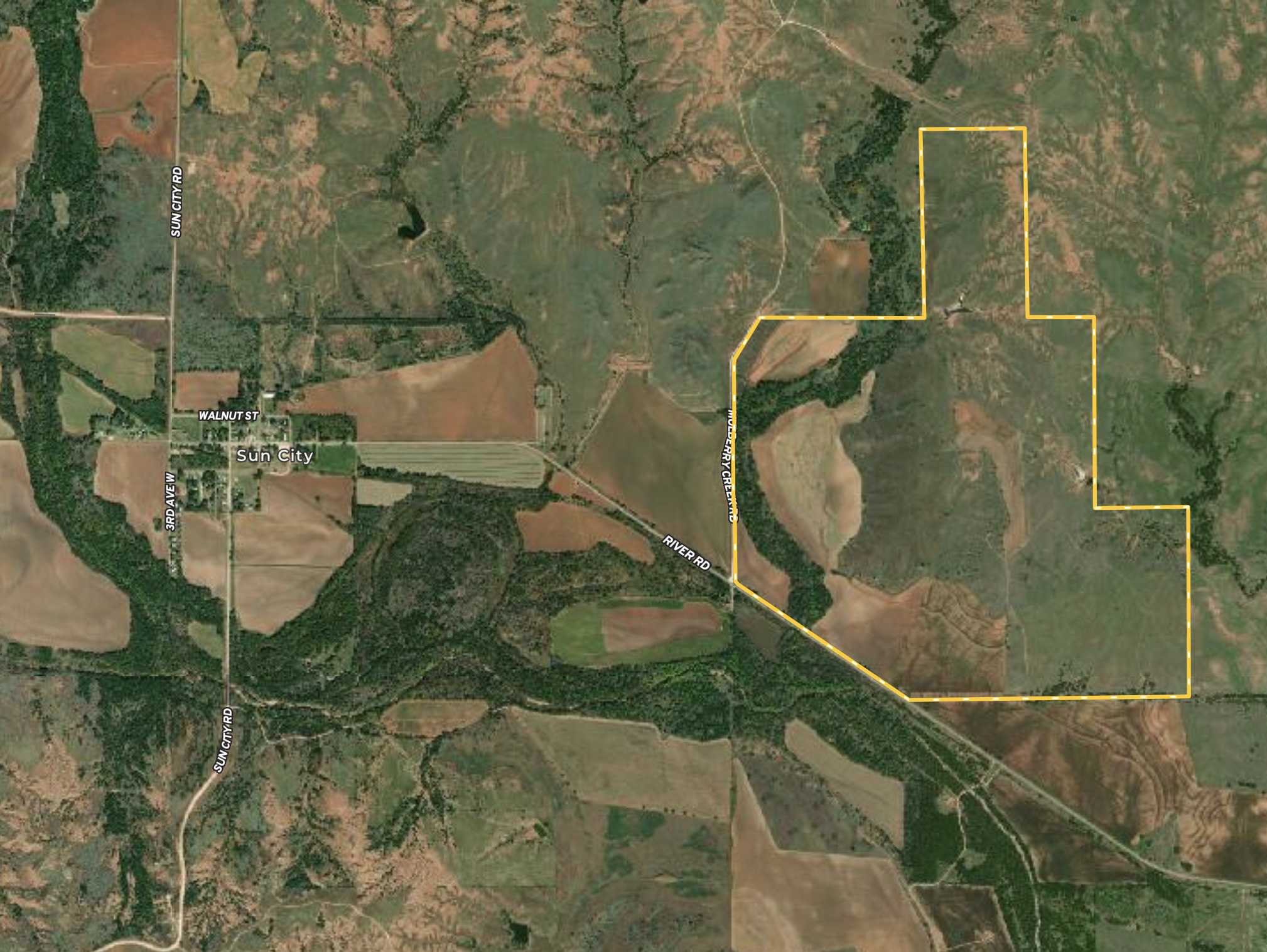 PRICE REDUCED! This incredible Sun City hunting ranch represents Unit 16 deer hunting at its absolute finest. Situated within an area which has rightfully earned the reputation as one of the most productive Boone and Crockett whitetail hunting destinations in the entire Midwest, this ranch consists of well over a mile of Mulberry Creek which is loaded with a variety of mature timber and fresh spring water creating unbelievable whitetail and turkey hunting habitat directly bordering the Medicine River. Highly intensive wildlife management practices and strategic development of food plots, bedding habitat, and stand locations has enabled this ranch to be offered as a turnkey whitetail hunting farm unlike anything you’ve seen. The nearly 195 acres of productive tillable land have been planted to a variety of crops (alfalfa, wheat, sorghum) which are focused toward attracting, growing, and holding whitetail deer to the property. An additional 4 acres of food plots have been planted within the timber creating beneficial high protein food sources and incredible archery hunting opportunities. Multiple tower blinds are strategically positioned throughout the ranch providing outstanding vantage points during early muzzleloader and regular firearms seasons, as well as multiple Banks blinds setup within the timber providing foolproof archery setups during all phases of the Fall hunting season. In addition to the plentiful spring water provided by Mulberry Creek, this ranch features 3 ponds which offer quality year-round water sources and terrific bass and channel cat fishing. A 90 acre fenced sanctuary and pond are located in the center of the property. This area features excellent year-round whitetail bedding habitat. Multiple coveys of quail are commonly flushed from the abundant grassland, brush, and thickets of the ranch as well. Located just over a mile East of the historical Sun City, there is blacktop access to the ranch and incredible views from its hilltops. This is a can’t-miss opportunity to purchase a turnkey whitetail hunting ranch directly in the heart of Kansas big buck country! This ranch is to be viewed by appointment only. Contact the Whitetail Properties land specialist today to schedule a private tour.