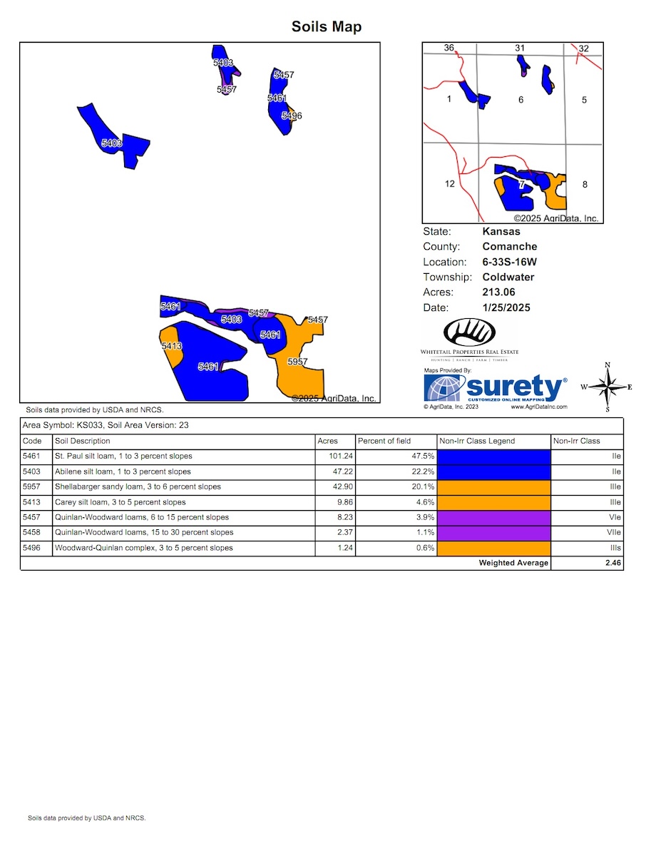 The property’s habitat is tailor-made for producing and sustaining trophy-class deer. A desirable mix of grasslands and rugged terrain provides both security and forage, while moist bottoms, natural springs, and rolling hills add diversity and sustain wildlife populations. The towering cottonwoods, scattered cedars, and sand plum thickets create ideal cover and bedding areas. Meanwhile, the approximately 213 acres of high-quality tillable land ensure a reliable food supply, capable of producing crops such as wheat, milo, and alfalfa to attract and hold deer throughout the year. Several small hunting plots are already established, with numerous opportunities to expand.