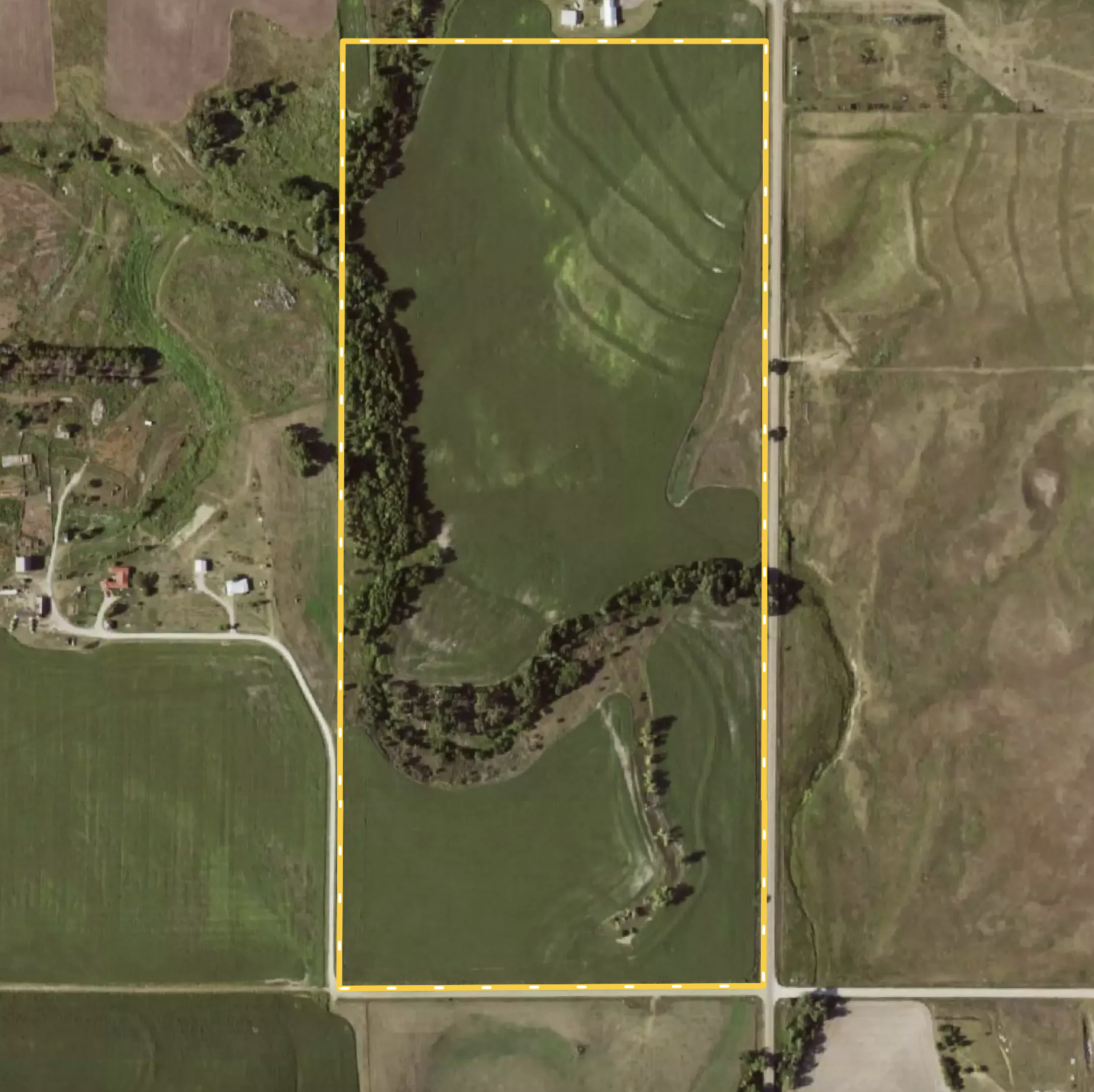 - Creek bottom bordered by cropland attracts and holds whitetail deer, turkeys, and upland game