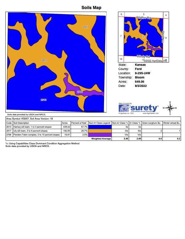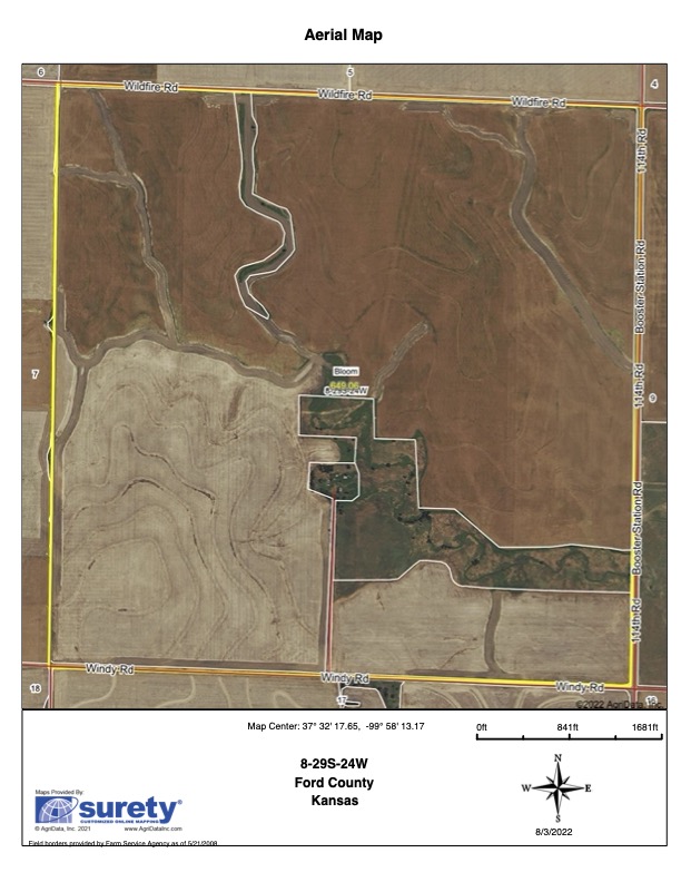 Located approximately 12 miles south of Dodge City, Kansas, on Wildfire Road sits a full section of highly productive cropland with minimal wasted acres. Very seldom will a large amount of tillable acreage come up for sale in this particular area. This is a great opportunity for a local operator or investor looking for a return. Currently, 356.03 acres are planted to a milo crop, while 217.61 acres are wheat stubble. There are 573.64 total tillable acres, with the remaining balance making up waterway and grassland. This puts this property at 90% pure cropland. High-class soils and flat contours will make this property a high producer with normal rainfall. Nearly 70% of the soil is compromised as class II Harney Silt Loams. Possession on wheat stubble acreage will be immediate as possession on planted milo acreage will be after the 2022 harvest. Milo crop will be negotiable. Waterways and terraces have recently been worked and maintained. Approximately 50 acres of grass is positioned in the center of the property; the fence is minimal. These 50 acres provide exceptional upland bird hunting. During the cold winter months, pheasants and quail congregate throughout the habitat in the middle of the section. Don’t overlook this farm when it comes to deer hunting. Several trails and rubs are present, and I wouldn’t be surprised if a new owner were to harvest a big Kansas whitetail year to year. Call one of the listing agents soon before this high-end property sells!