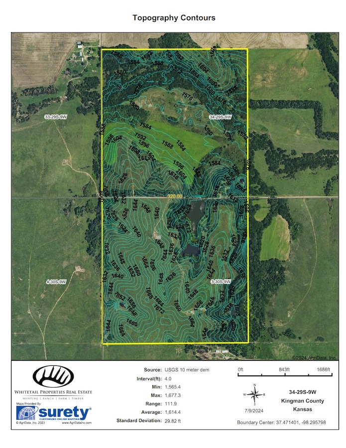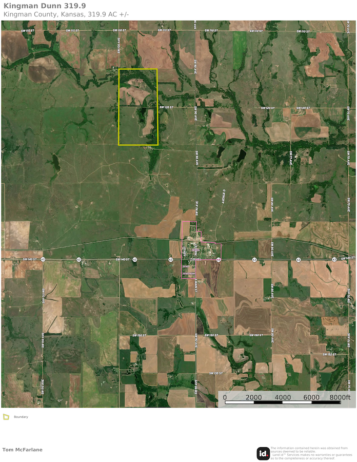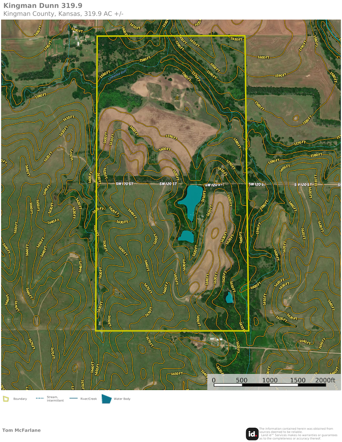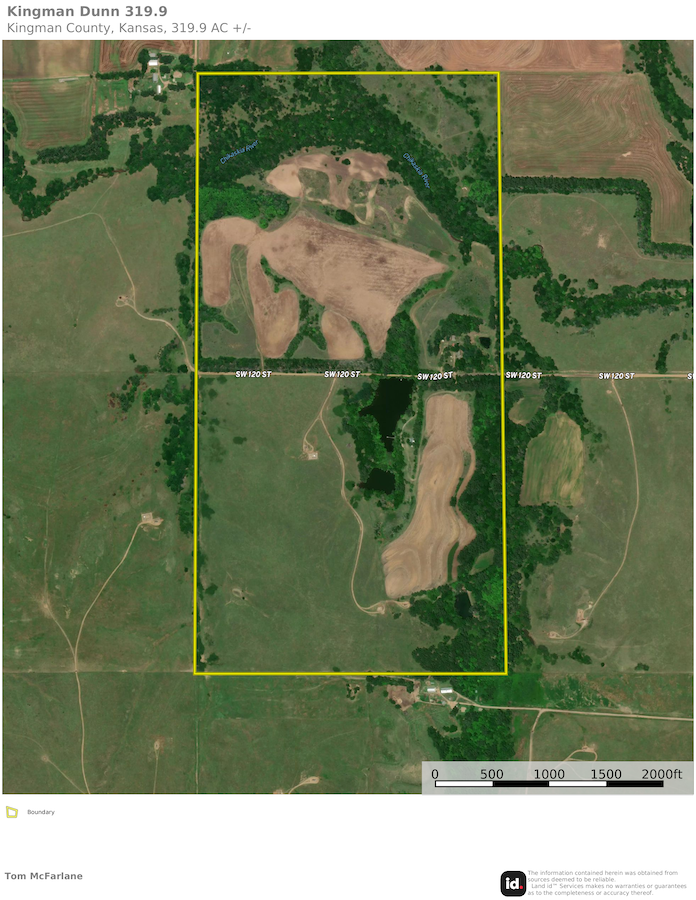 The overall land types and scenery west of Wichita and in western Kansas many times is considered to be more arid pasture country with seas of grass and sage. It can often be dry and void of water, with lakes and rivers being limited in many areas. Well, these 319.9 acres in Kingman County break that mold and are one of the most scenic, picturesque lake-style properties you will ever find in western Kansas. Totaling 319.9 acres, this farm is an outstanding combination of Chikaskia River, lake, cabin, tillable, and overall hunting or recreation habitat. The spring-fed lake is the centerpiece of the farm. It is very scenic, and a small cabin sits just slightly elevated above the lake with a nearby long floating dock and a gentle slope down to the water. The views from the cabin and around the entire lake are exceptional, with a mix of trees and open all along the water's edge. The fishing here is excellent, with clear spring-fed water and good structure. The bass and crappie fishing is right out your front door. The remaining property is filled with large trees, including numerous Walnuts, some towering Cottonwoods, and a nice mix of others. The deer hunting is excellent, and the Chikaskia River runs through the north end of the property, creating a great core area for deer that is thick with cover with rolling crop fields adjoining. That combination allows for an excellent area to grow some crops for income or create food plots for wildlife and several excellent blind and or stand sites to hunt this area effectively. There are additional opportunities to hunt quail or upland birds and, of course, some waterfowl with use the ponds. If you have been in the market for a picture-perfect, all-encompassing recreational property, this farm is top-of-class. Please contact the listing agent to schedule an in-person tour of this picturesque place.