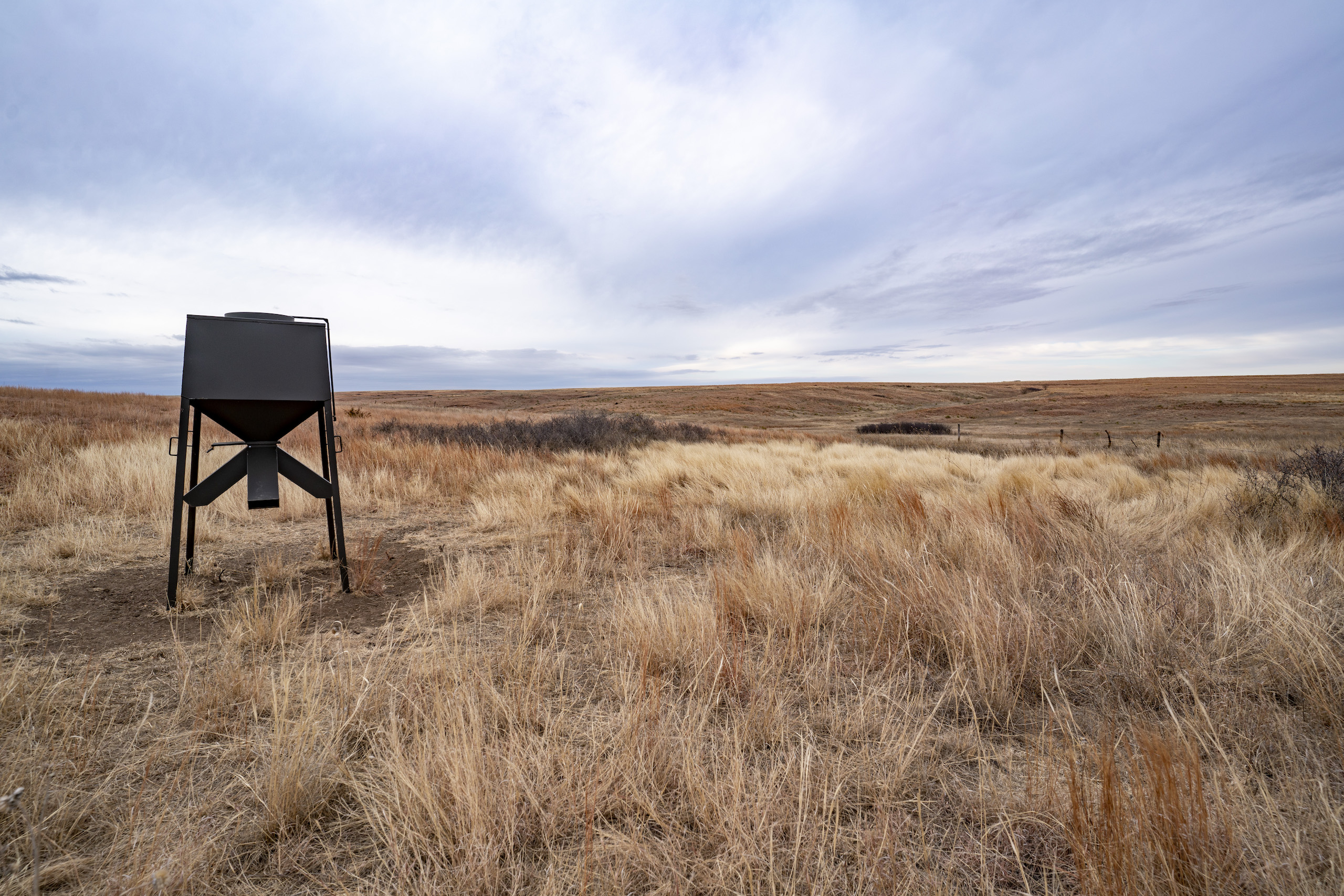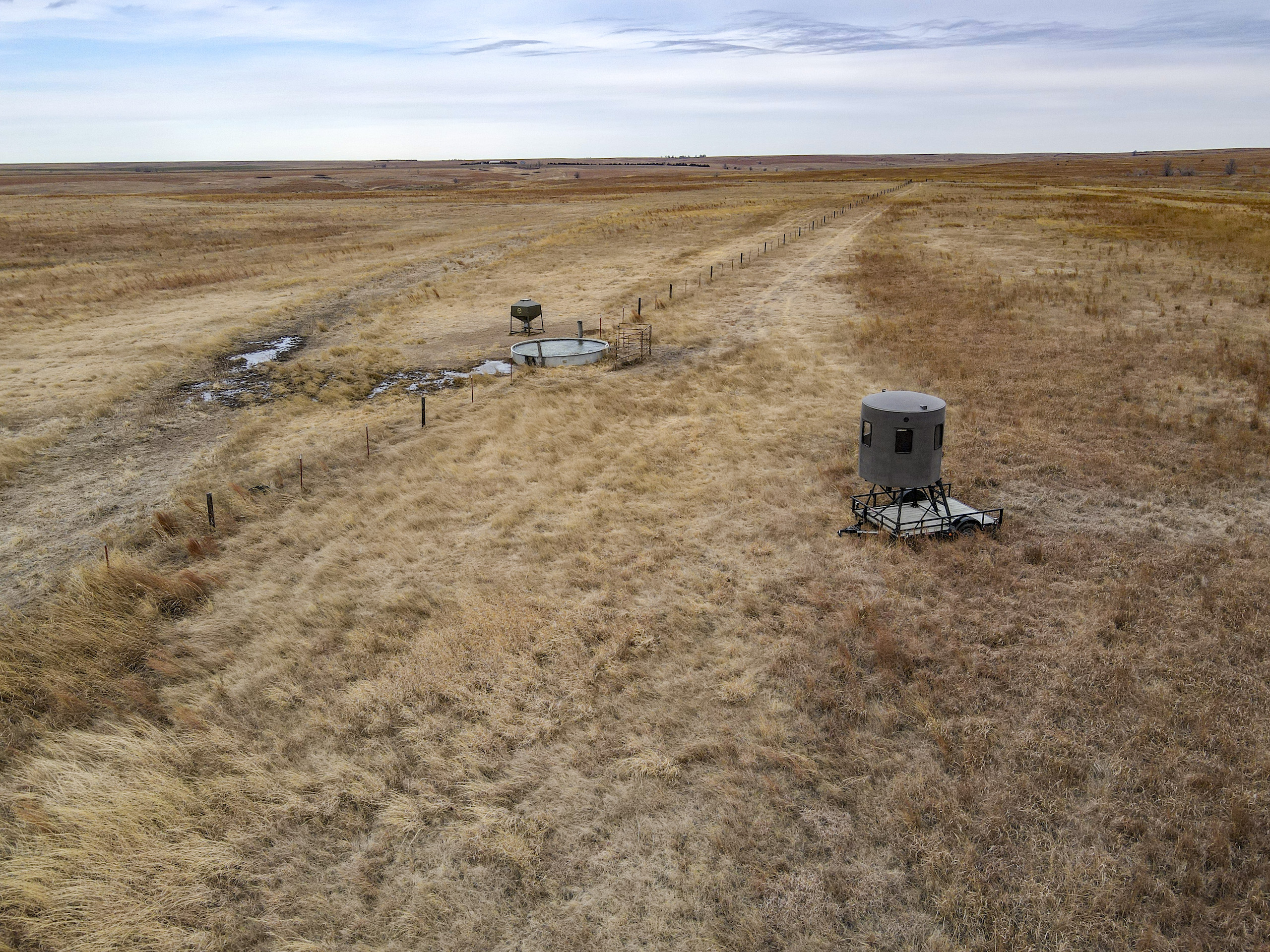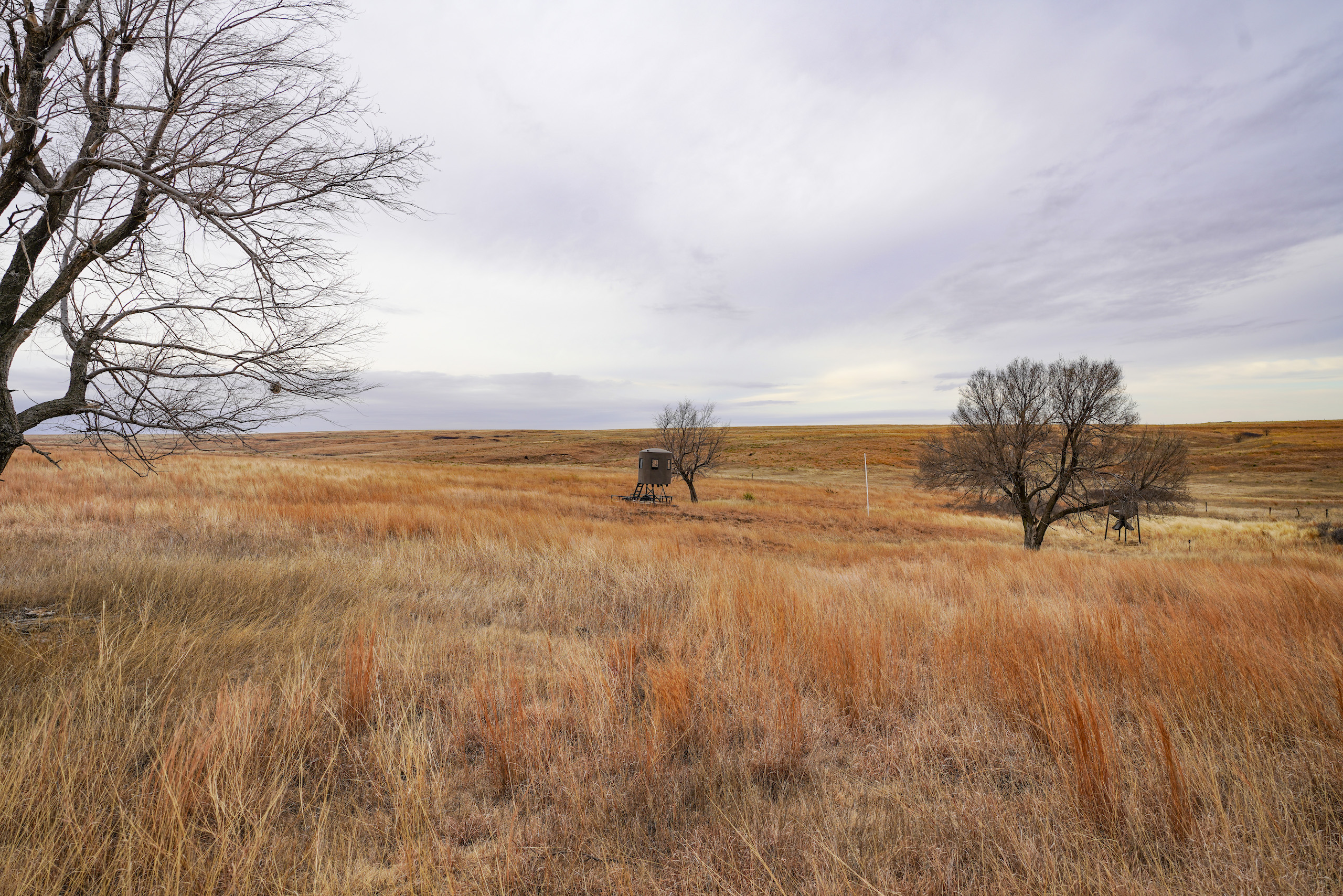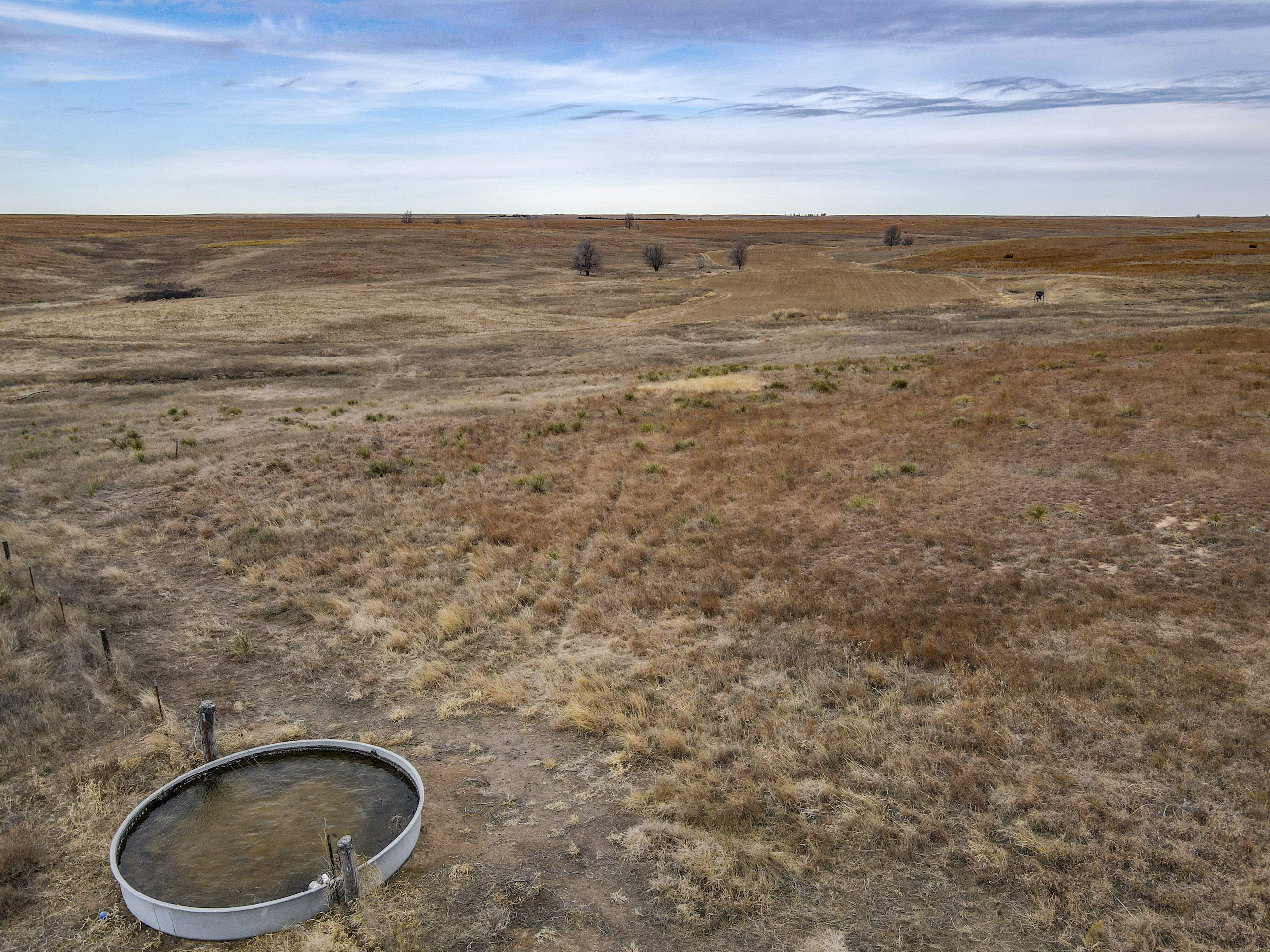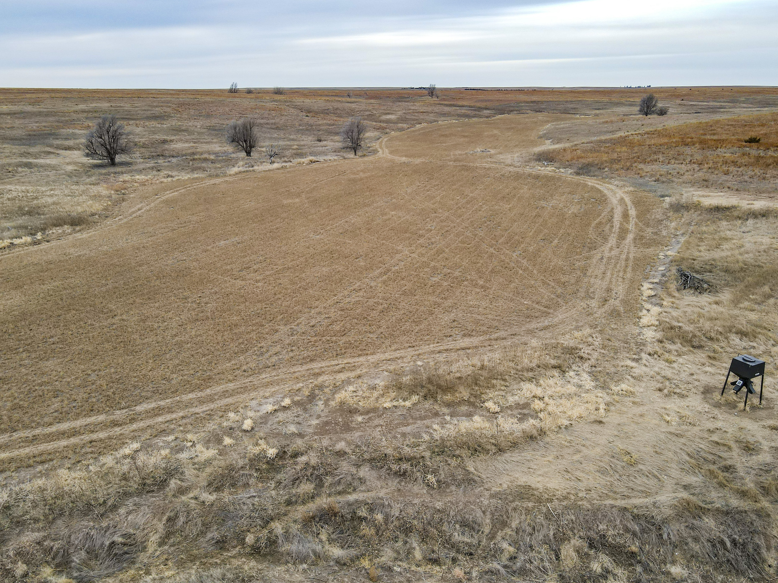 The big ranch country and wide-open spaces that lie in southern Kiowa County and northern Comanche county are many times considered just that, wide-open ranches. The people that are in the know realize that those passed over places and oceans of grassy pastures are the least pressured areas that still maintain just as much of a deer population as many other types of habitats. The benefit of that is the most important tool in big buck management…AGE! The deer in this area get old, “die of old age” old. When you combine that with neighboring ranches being under very strict management for maturity and you have an automatic and proven big deer property. There have been small several alfalfa fields implemented to draw deer and keep them throughout the summer months. This ranch also has numerous water tanks that are supplied by a well water line so there is a year-round freshwater supply for not only livestock if so desired, but also a wildlife supplement. Current owners have purposely taken very few bucks over the last several years and have put in place several Banks hunting blinds along with large feeders creating numerous hunt options for different winds and weather. DO NOT let the aerial fool you, check out the deer pictures and call us to go in-depth about what this property can produce as a big deer factory.