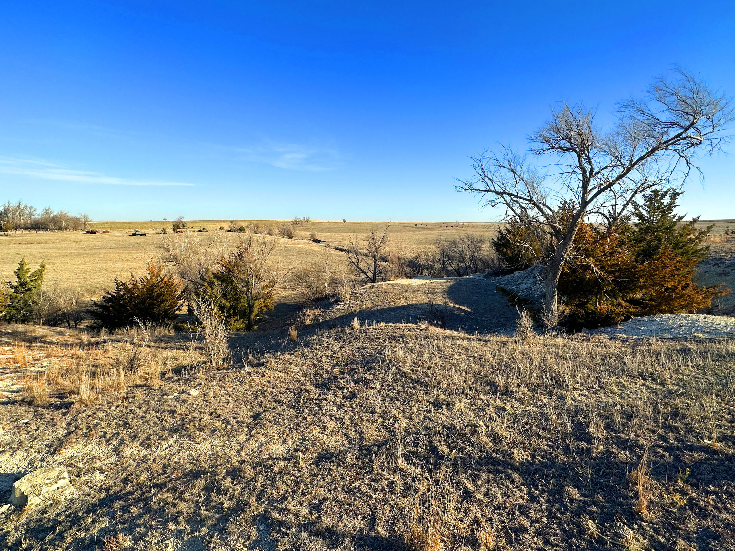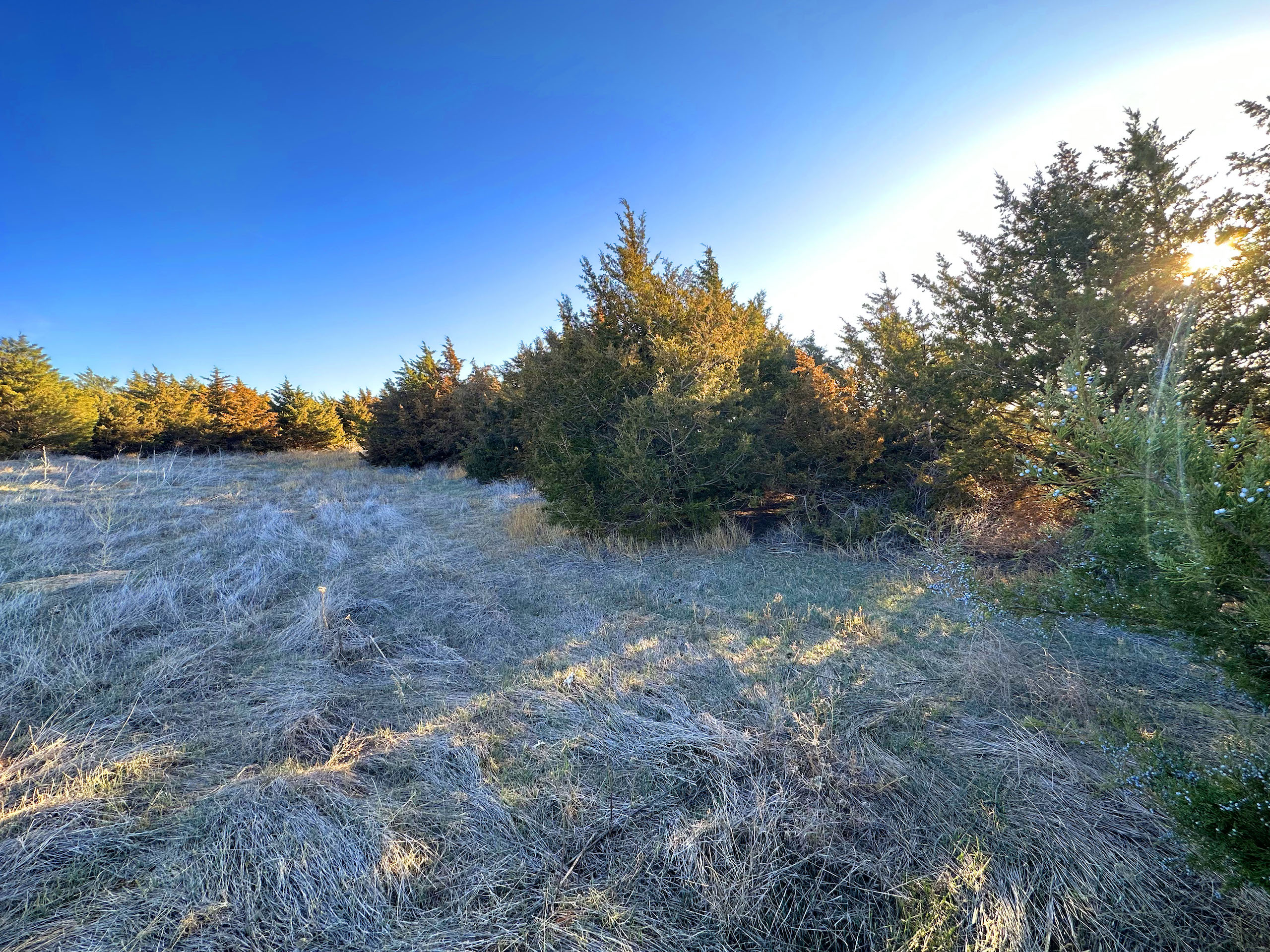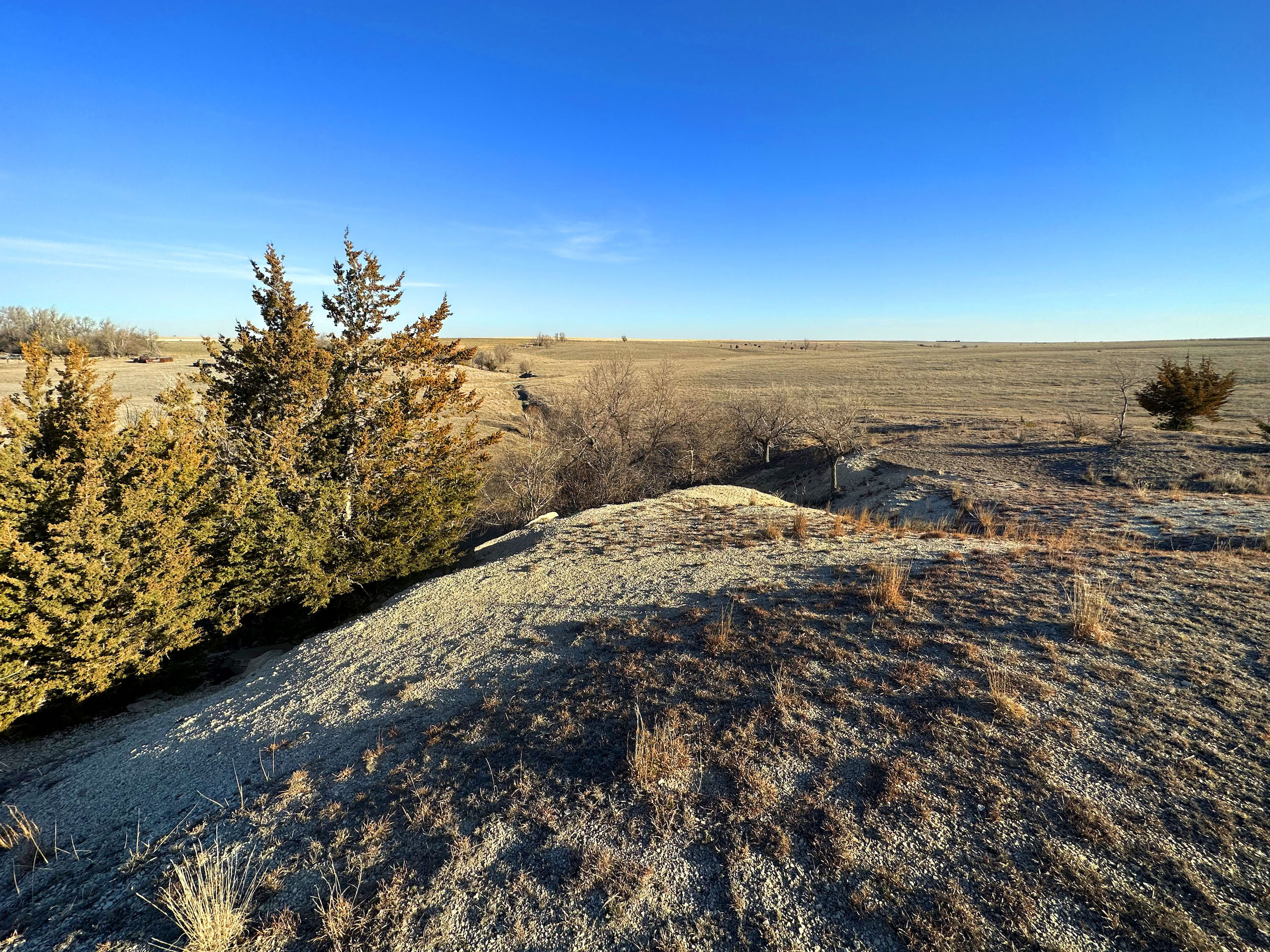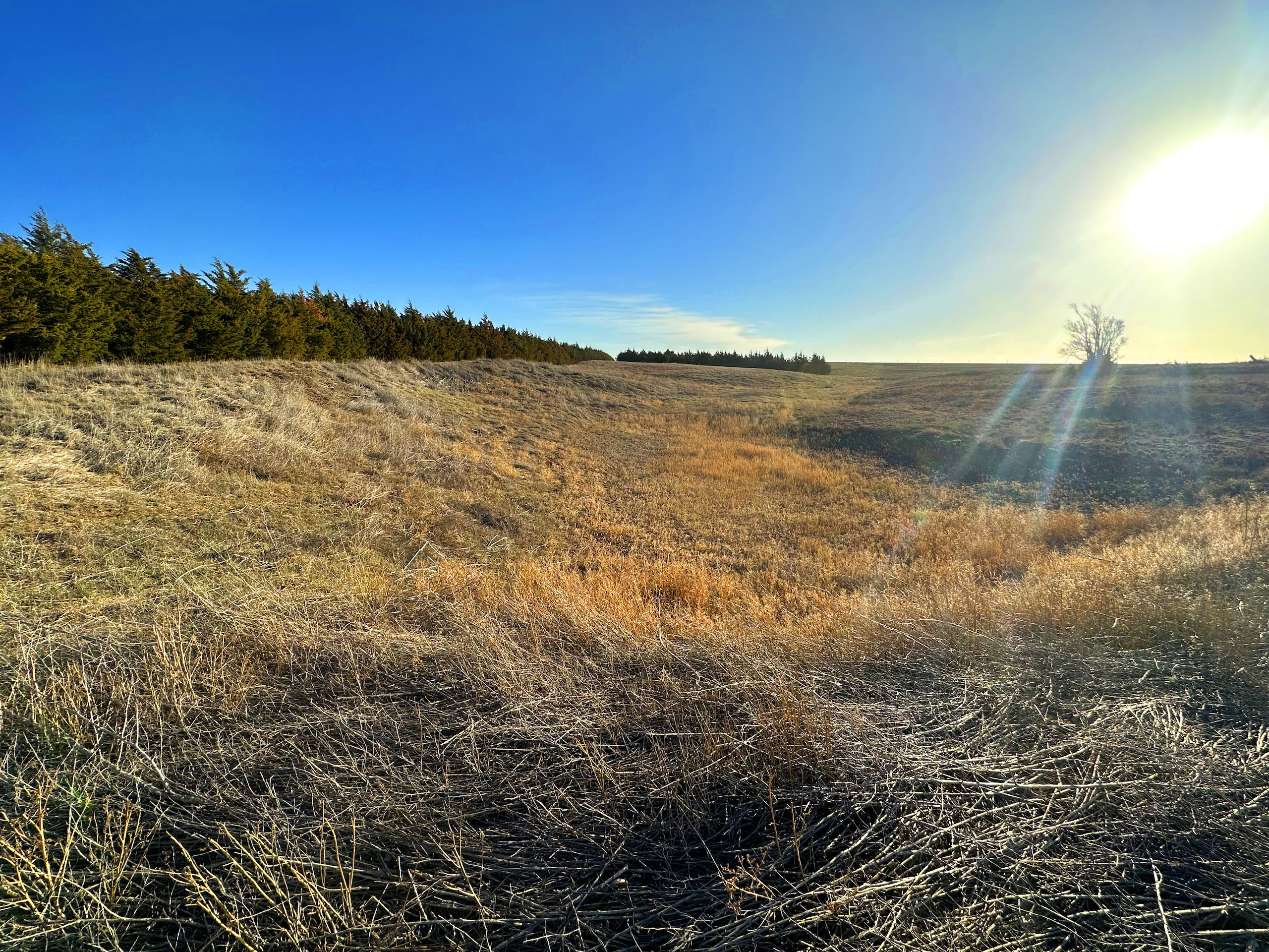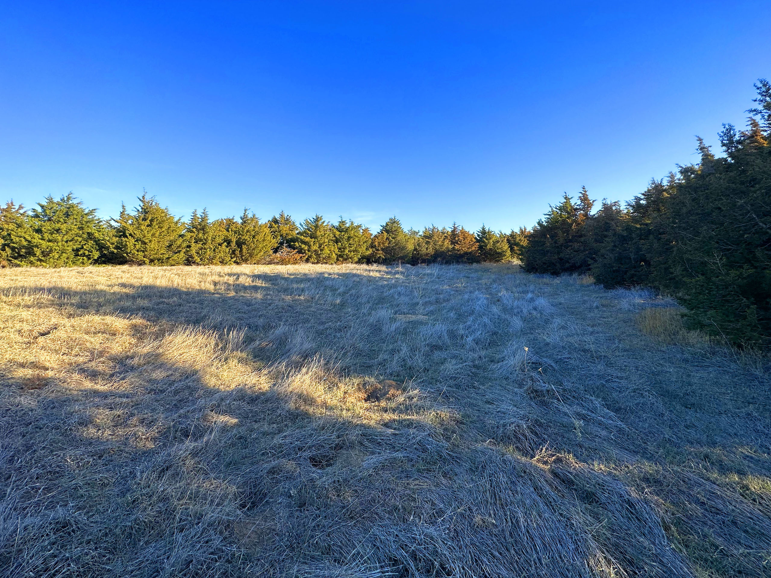 This quarter section in Ness County, KS, checks many boxes for both the avid hunter and the farm operator looking to add some more quality acres. In an area plush with wildlife and excellent crop production, this farm features a good dose of upland and big game habitat while also featuring nearly 92 acres of cropland consisting of Class II and III silt loam soils. The southeast corner of the property features over a ¼ mile of double-rowed cedar windbreaks, an old pond site, and tall grass and native forbs that are beneficial for holding pheasants, quail, and deer. Long cedar windbreaks like this are frequently used by whitetail and mule deer in this area as shelter from the cold winter winds. The nearly 52 acres of grassland at the NW corner is highlighted by a rugged rock ledge overlooking a seasonal stream bed with a few trees providing shade and cover for deer in the area. Even some gobbling tom turkeys were heard nearby upon our first visit.