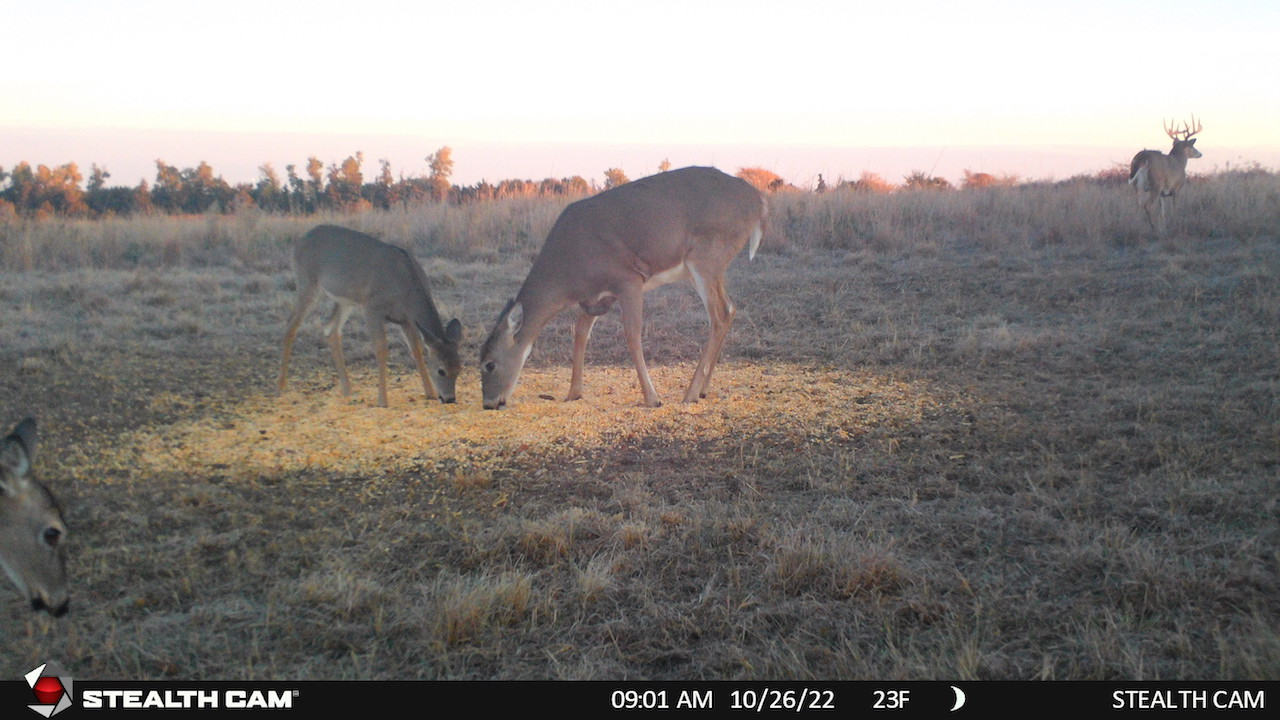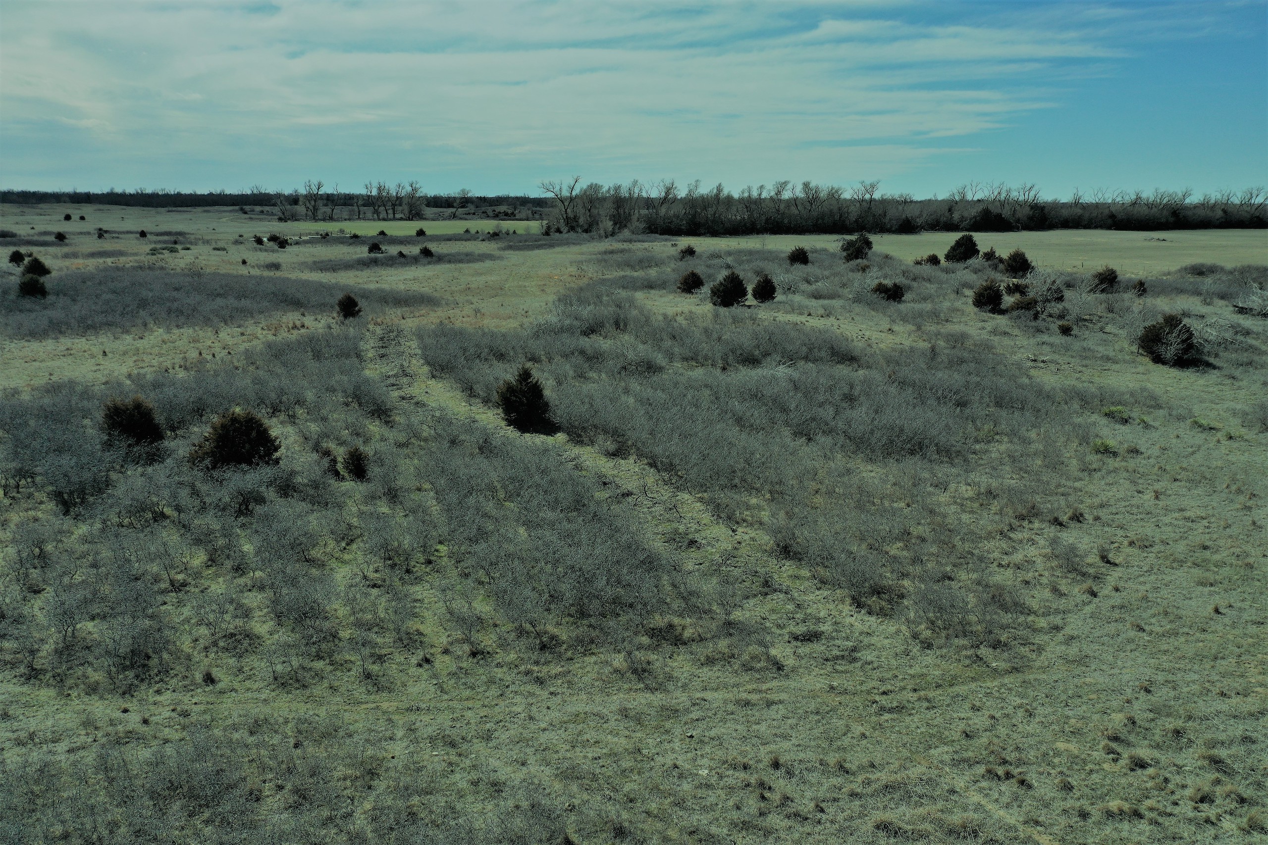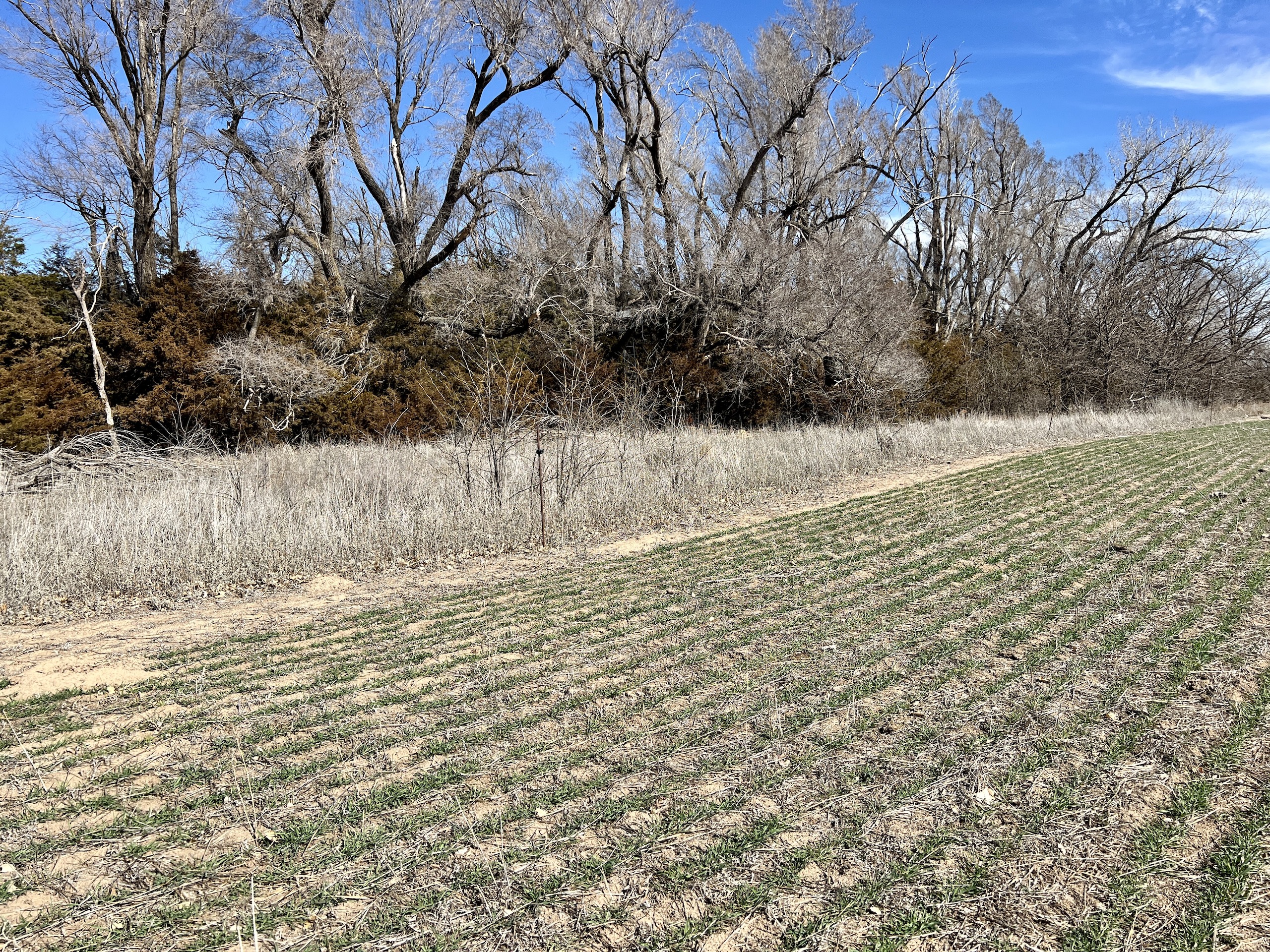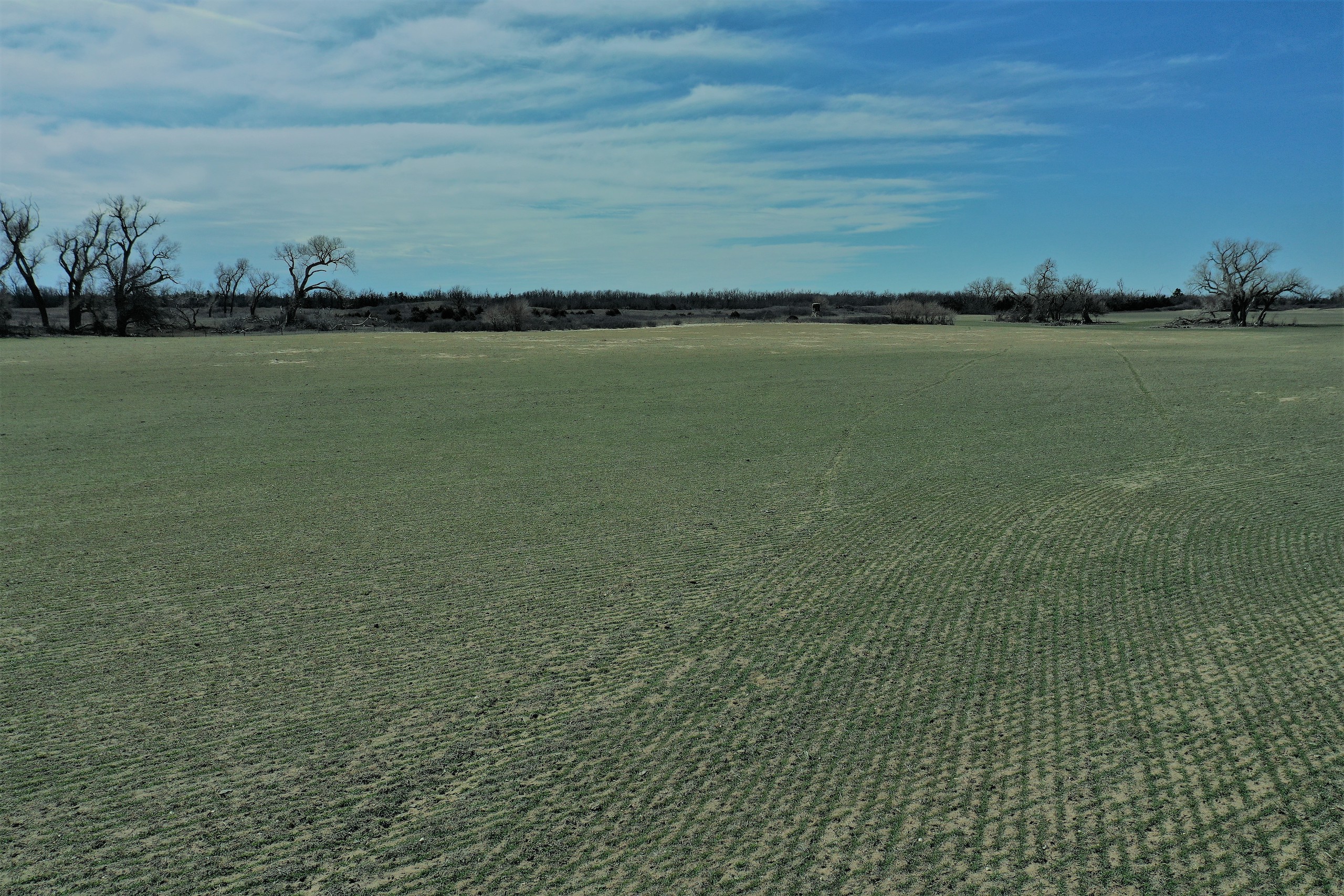 The property has 2 Banks Blinds, one overlooking the bedding area and one overlooking the farm ground. The 62 Acres of farm ground are currently planted to wheat. The seller currently has a great lease arrangement with a farmer to plant wheat for the deer, in-turn he’ll graze calves once deer season is over. This agreement can likely continue with the new owner. The wheatfield is covered up in deer tracks! The pasture is predominately rolling hills with heavy native grass and plum thickets providing great bedding. It has some scattered trees and tree rows that are full of rubs and scrapes.