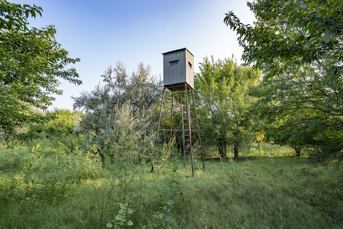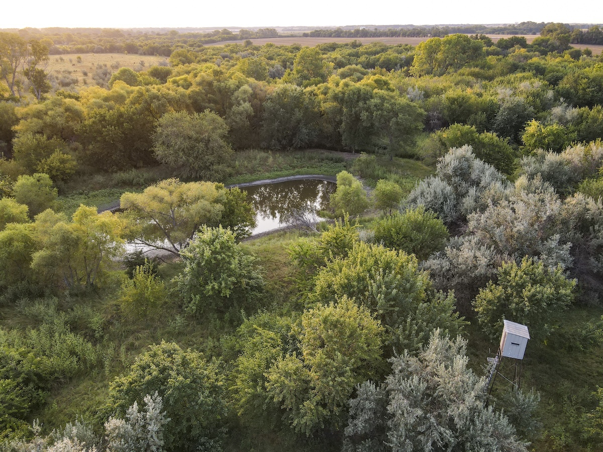 - Two tower blinds in place; one on the west side along a field edge, and another on the east side overlooking the pond