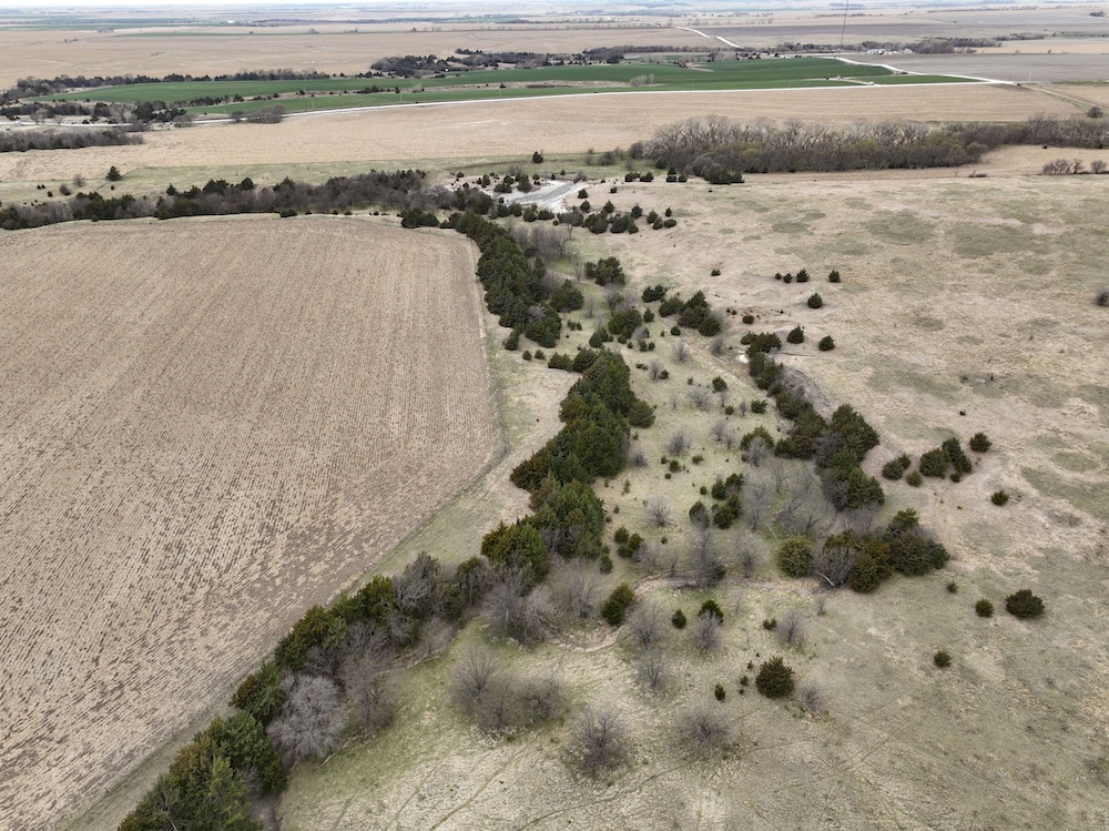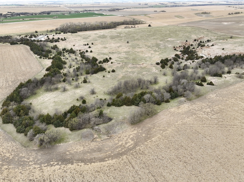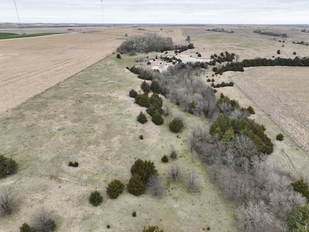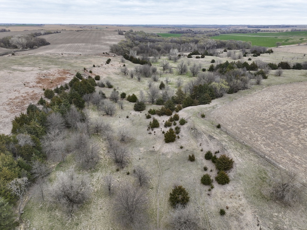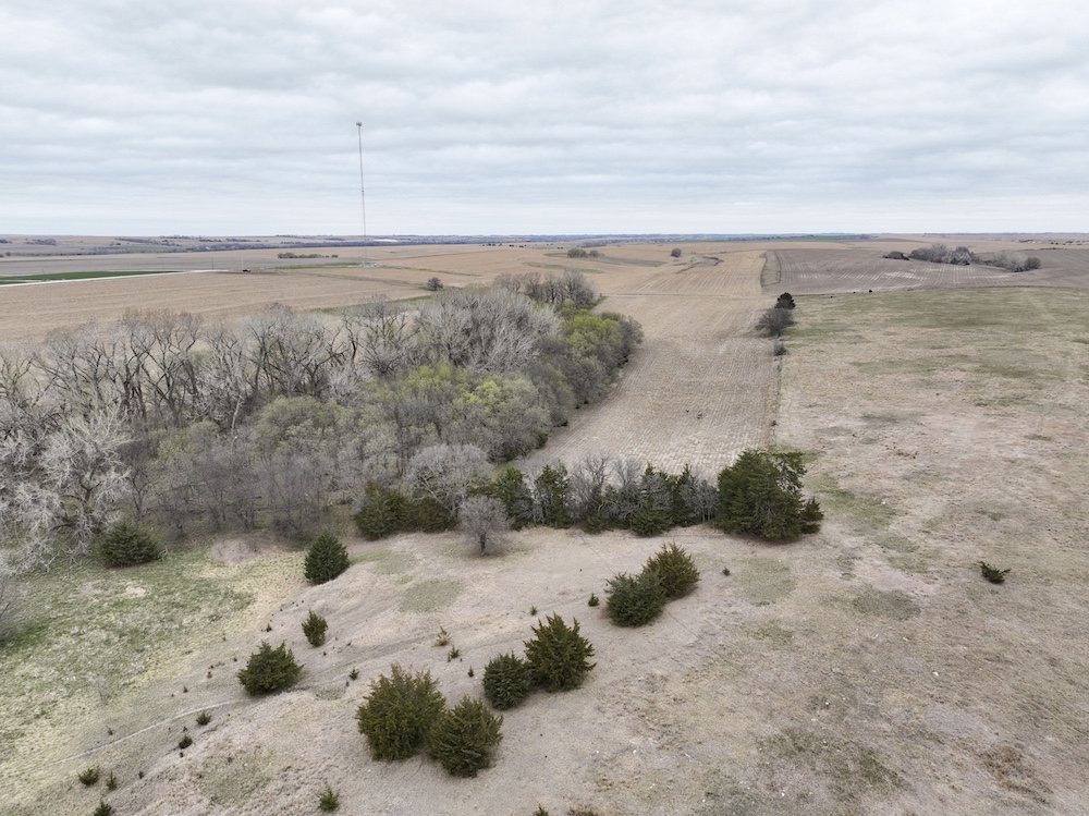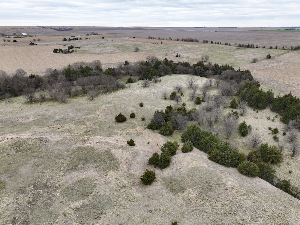 Complementing the tillable acres is a well-maintained balance of grassland pasture that is fenced and suitable for grazing. The pasture features rolling topography with notable elevation changes, creating both functional grazing land and strategic vantage points for hunting. The presence of cedar trees and natural cover enhances the property's appeal, providing excellent bedding areas and travel corridors for wildlife.