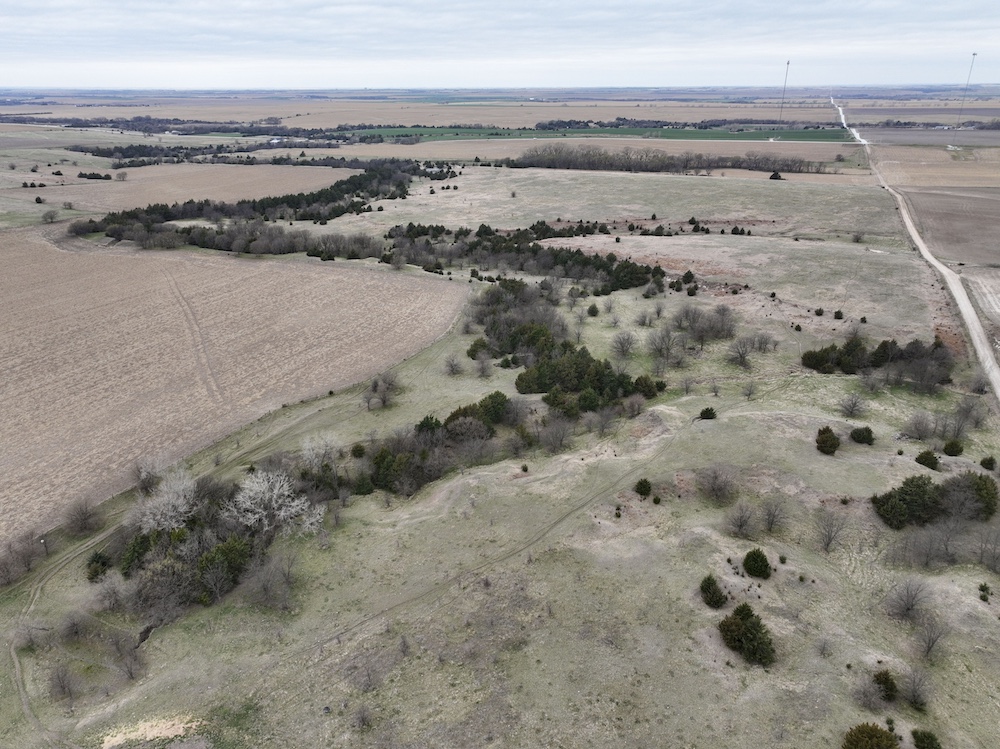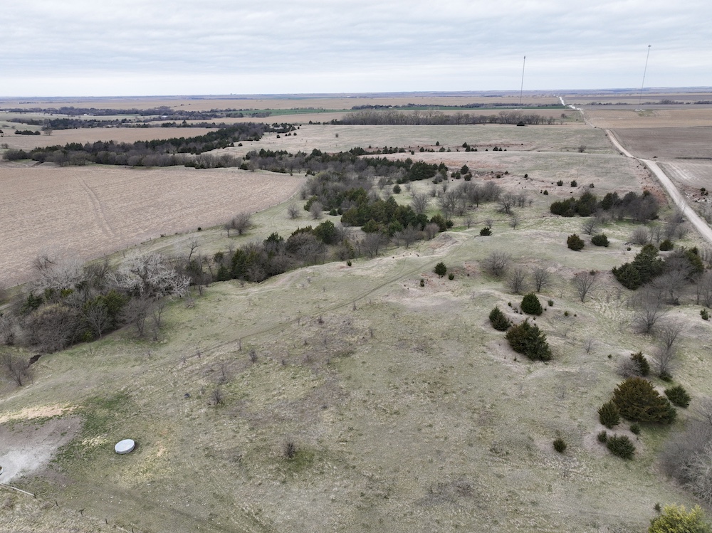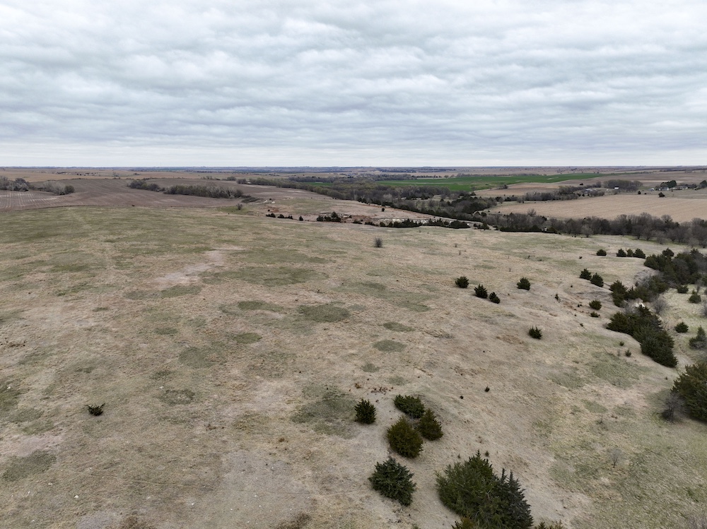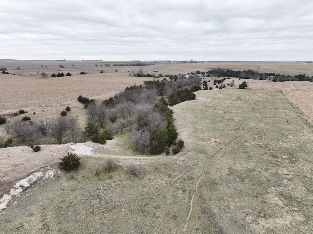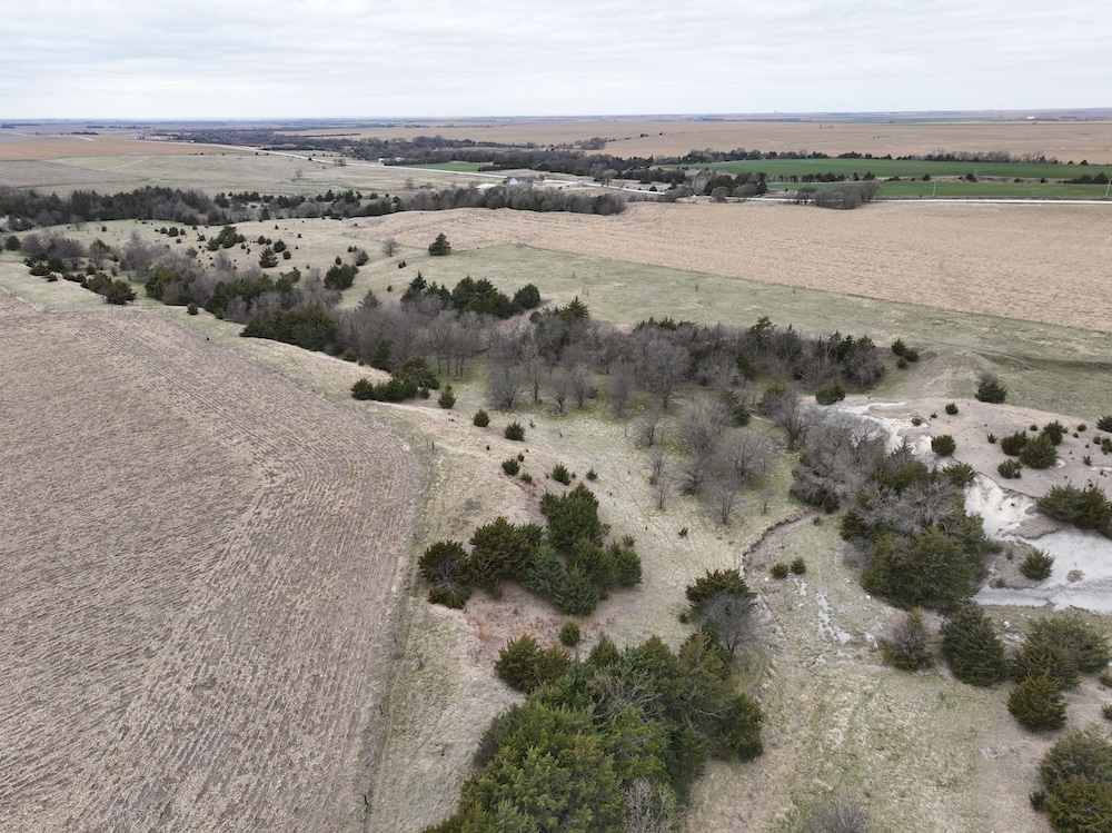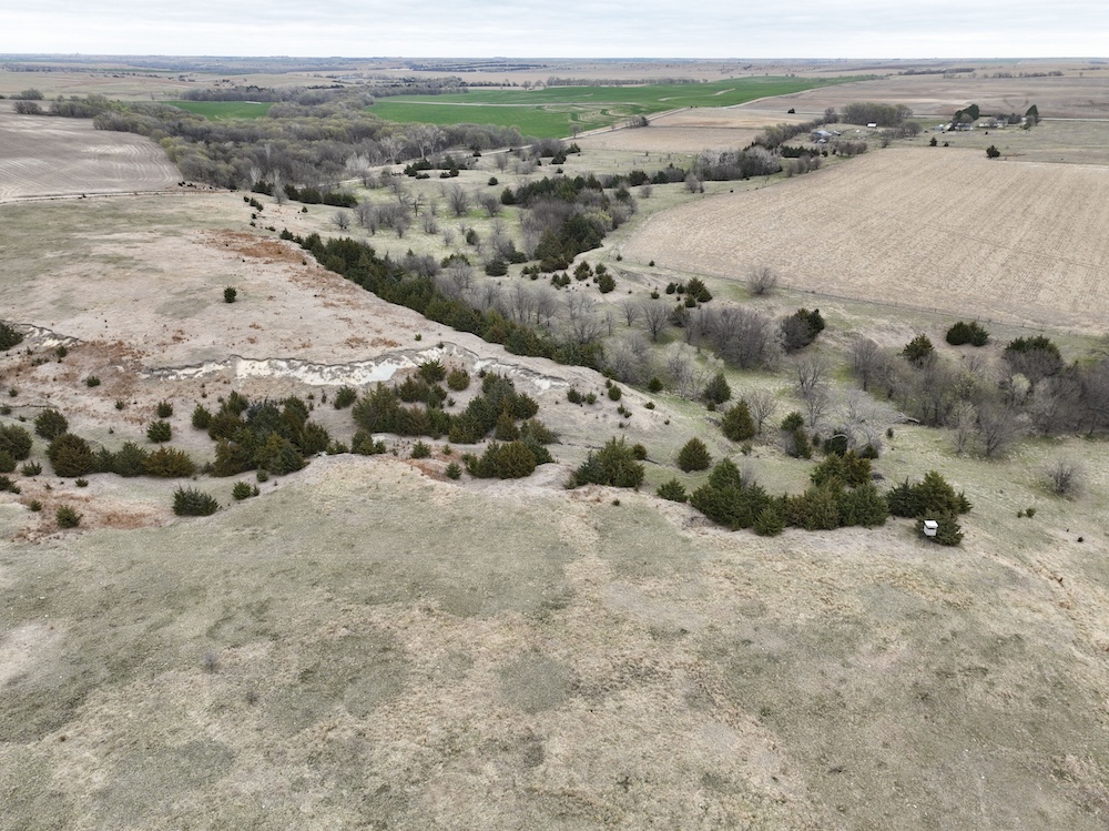 Complementing the tillable acres is a well-maintained balance of grassland pasture that is fenced and suitable for grazing. The pasture features rolling topography with notable elevation changes, creating both functional grazing land and strategic vantage points for hunting. The presence of cedar trees and natural cover enhances the property's appeal, providing excellent bedding areas and travel corridors for wildlife.