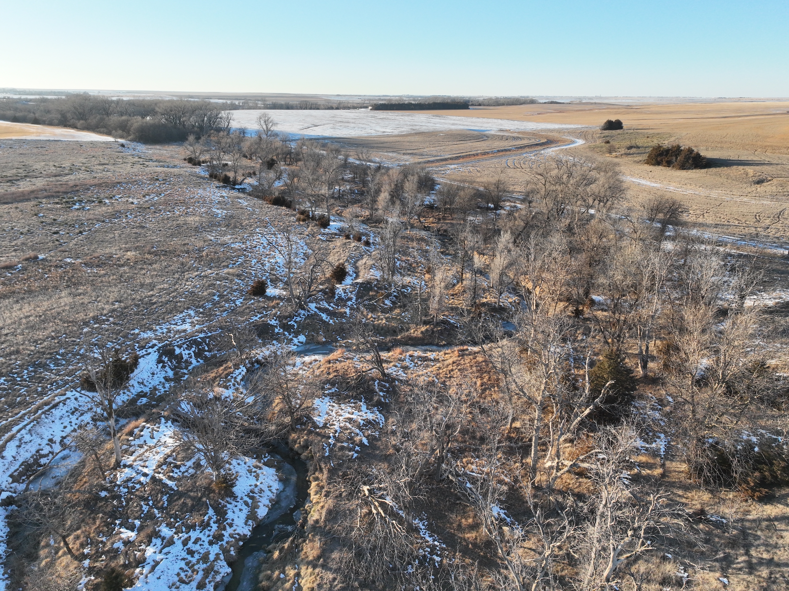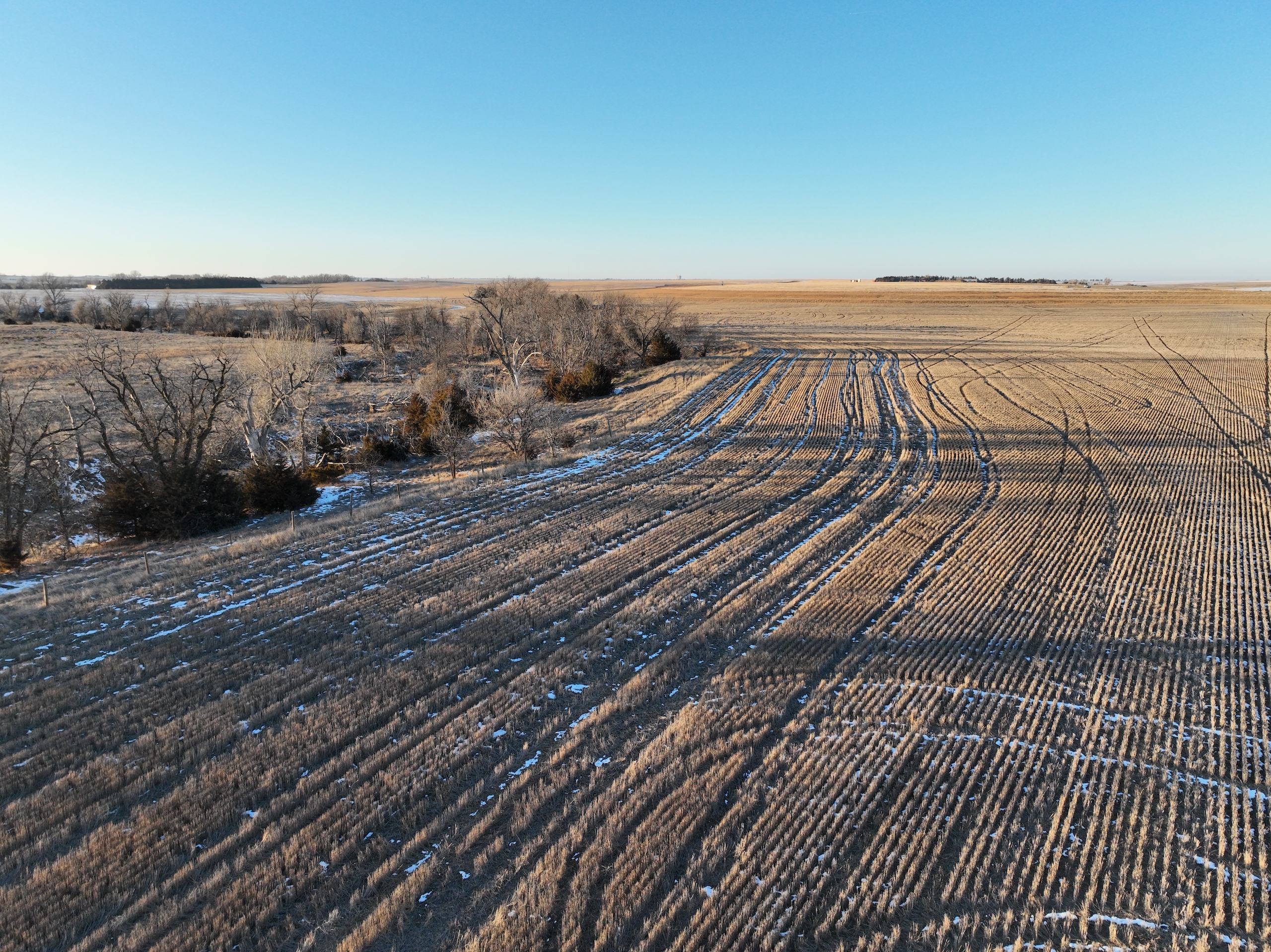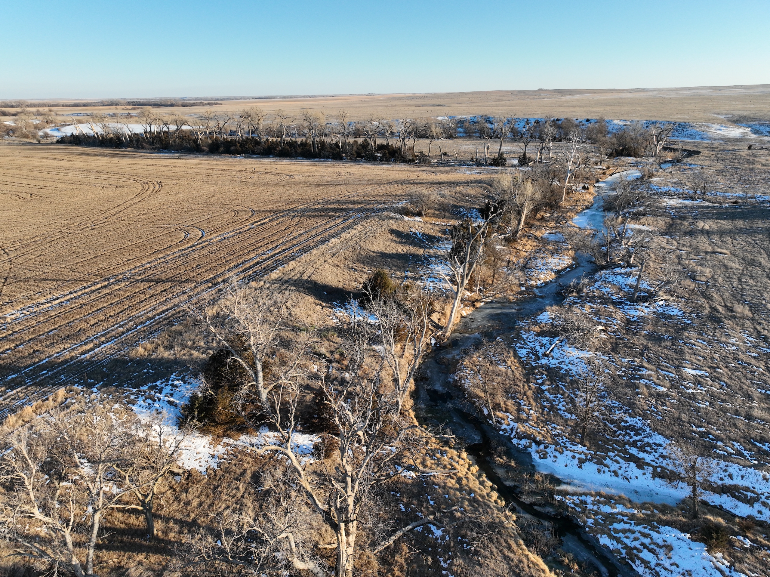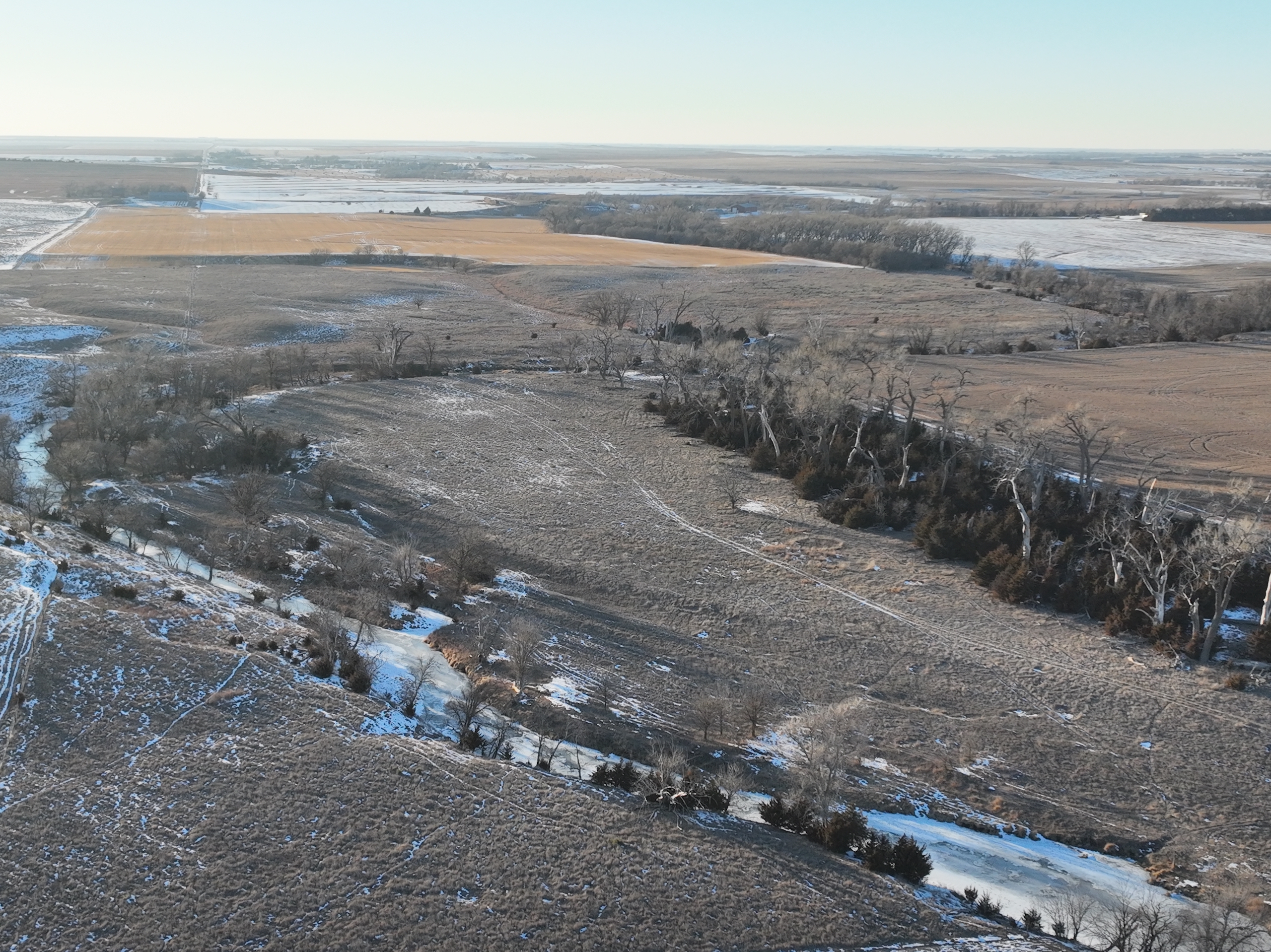 This half section in Trego County, KS, has a little bit of everything, including productive cropland, excellent fenced pasture with a water well, creek bottom hunting, and a producing oil well. Whether a farm operator, investor, or hunter, this property will have enough quality to spark your interest. With over 135 acres of cropland, this property commonly raises high-yielding milo and wheat crops from its mostly Class II silt loam and clay loam soils. 25.39 acres were enrolled in the CRP program in recent years, providing additional income from the property, as well as great wildlife habitat. 150+ acres of fenced grassland provides great pasture for livestock, and a solar water well is onsite, offering a consistent water source for the stock.