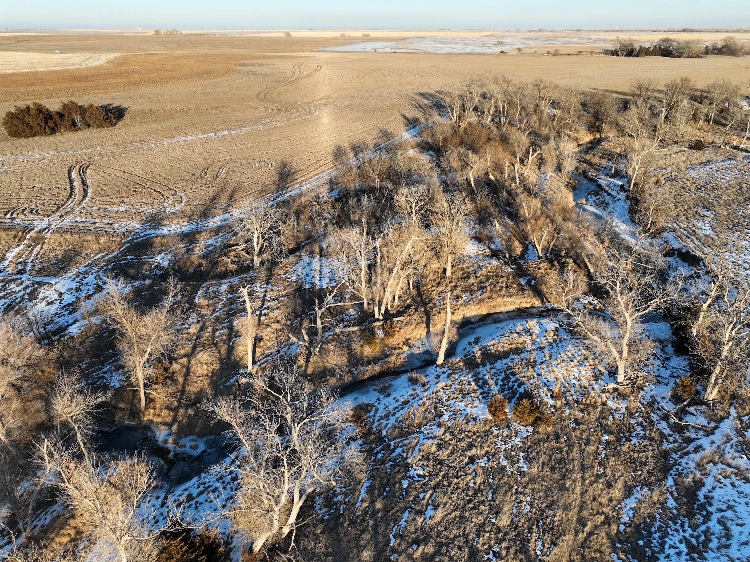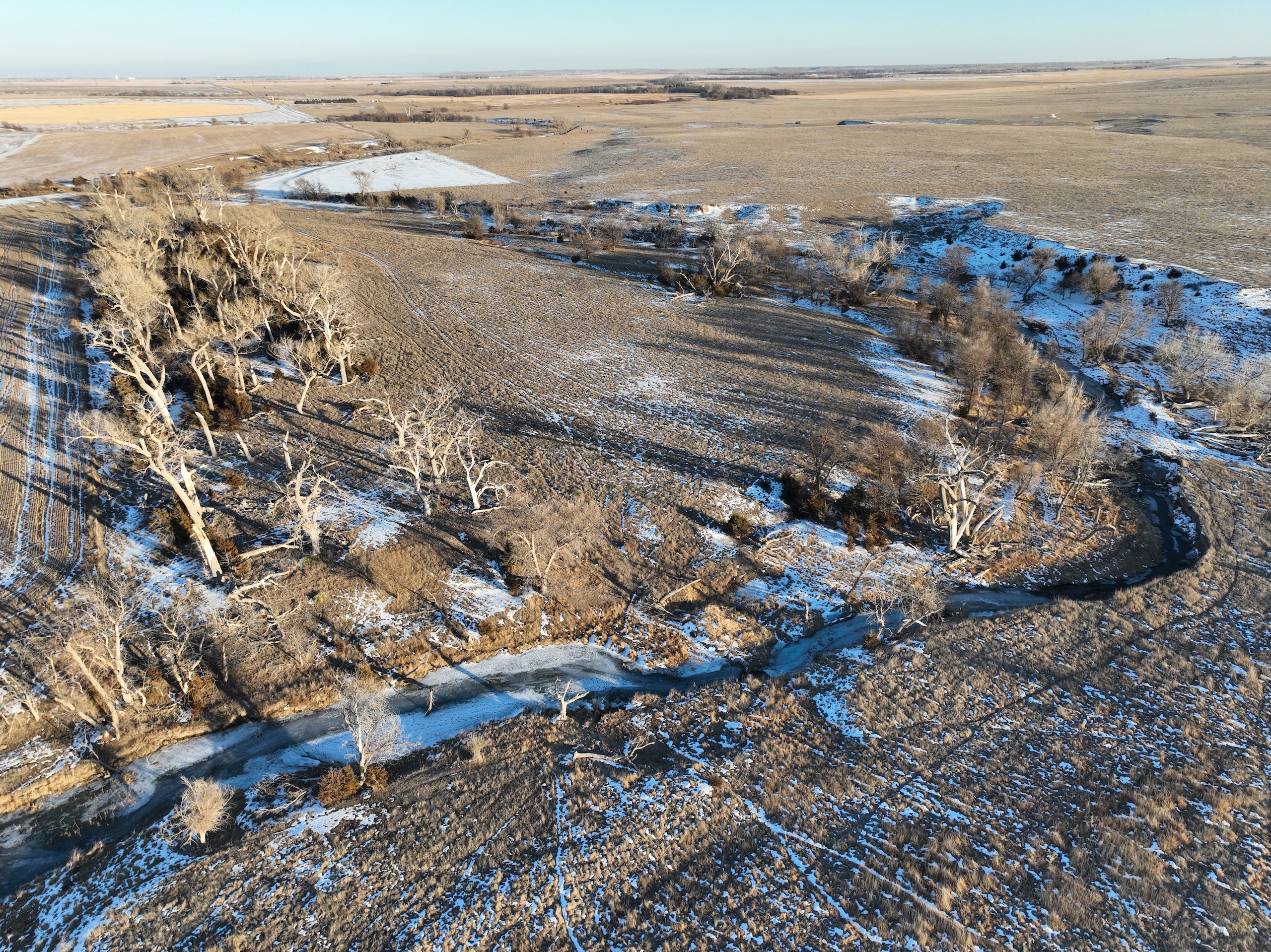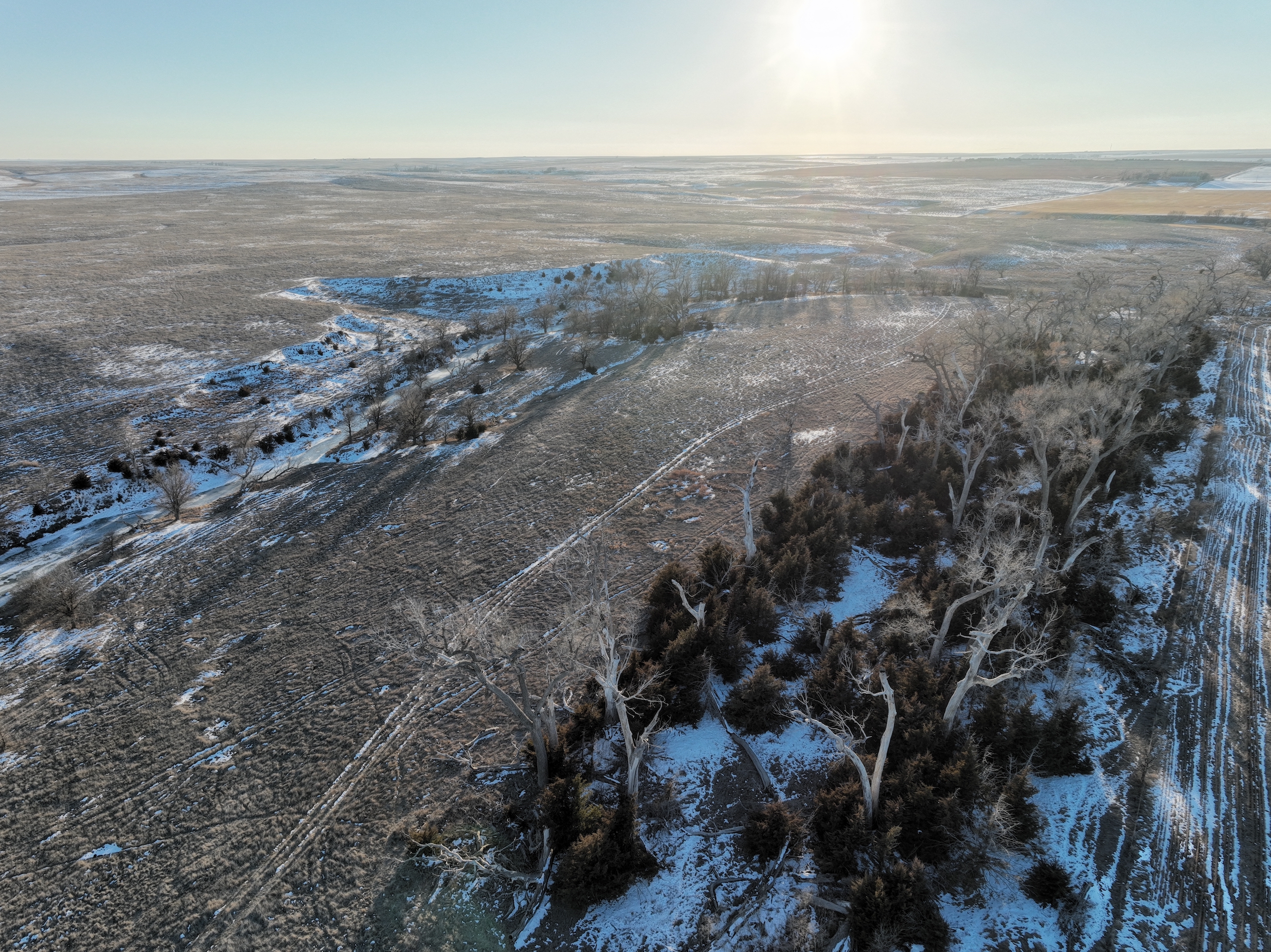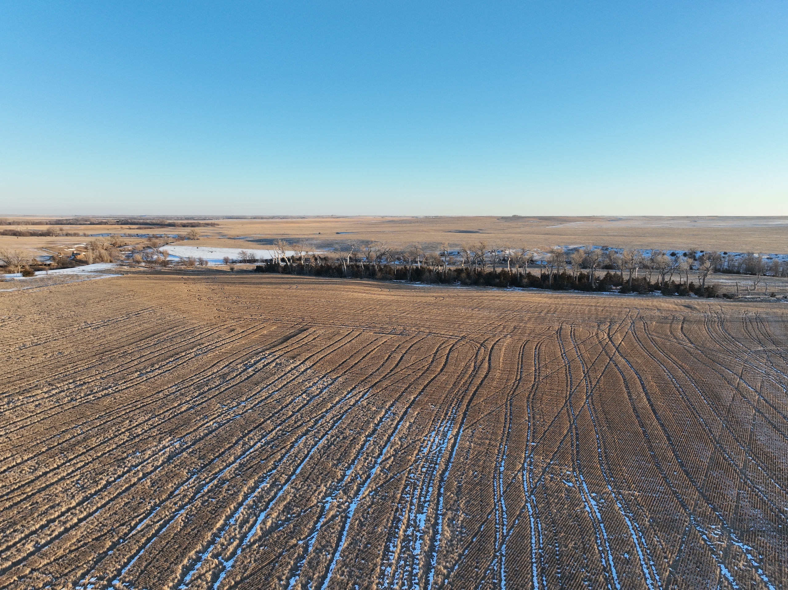 This half section in Trego County, KS, has a little bit of everything, including productive cropland, excellent fenced pasture with a water well, creek bottom hunting, and a producing oil well. Whether a farm operator, investor, or hunter, this property will have enough quality to spark your interest. With over 135 acres of cropland, this property commonly raises high-yielding milo and wheat crops from its mostly Class II silt loam and clay loam soils. 25.39 acres were enrolled in the CRP program in recent years, providing additional income from the property, as well as great wildlife habitat. 150+ acres of fenced grassland provides great pasture for livestock, and a solar water well is onsite, offering a consistent water source for the stock.