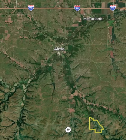 - Located about 6 miles southeast of Alma on Hessdale Road. 33 +/- miles from Manhattan & 40 +/- miles from Topeka
