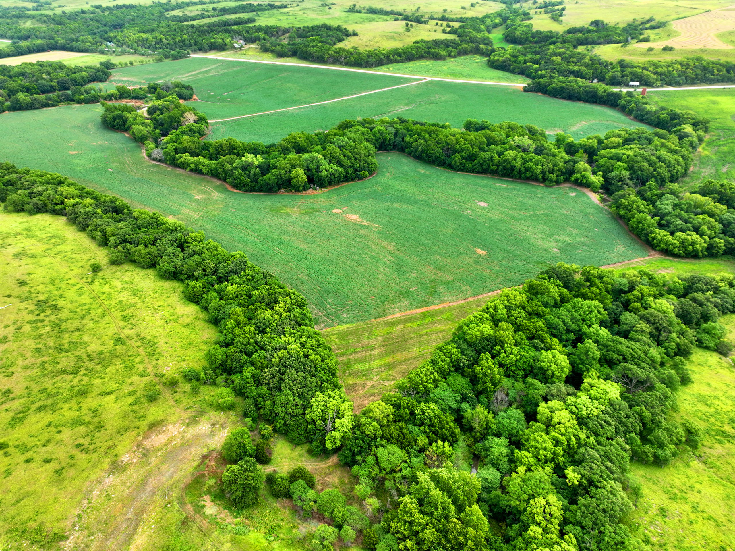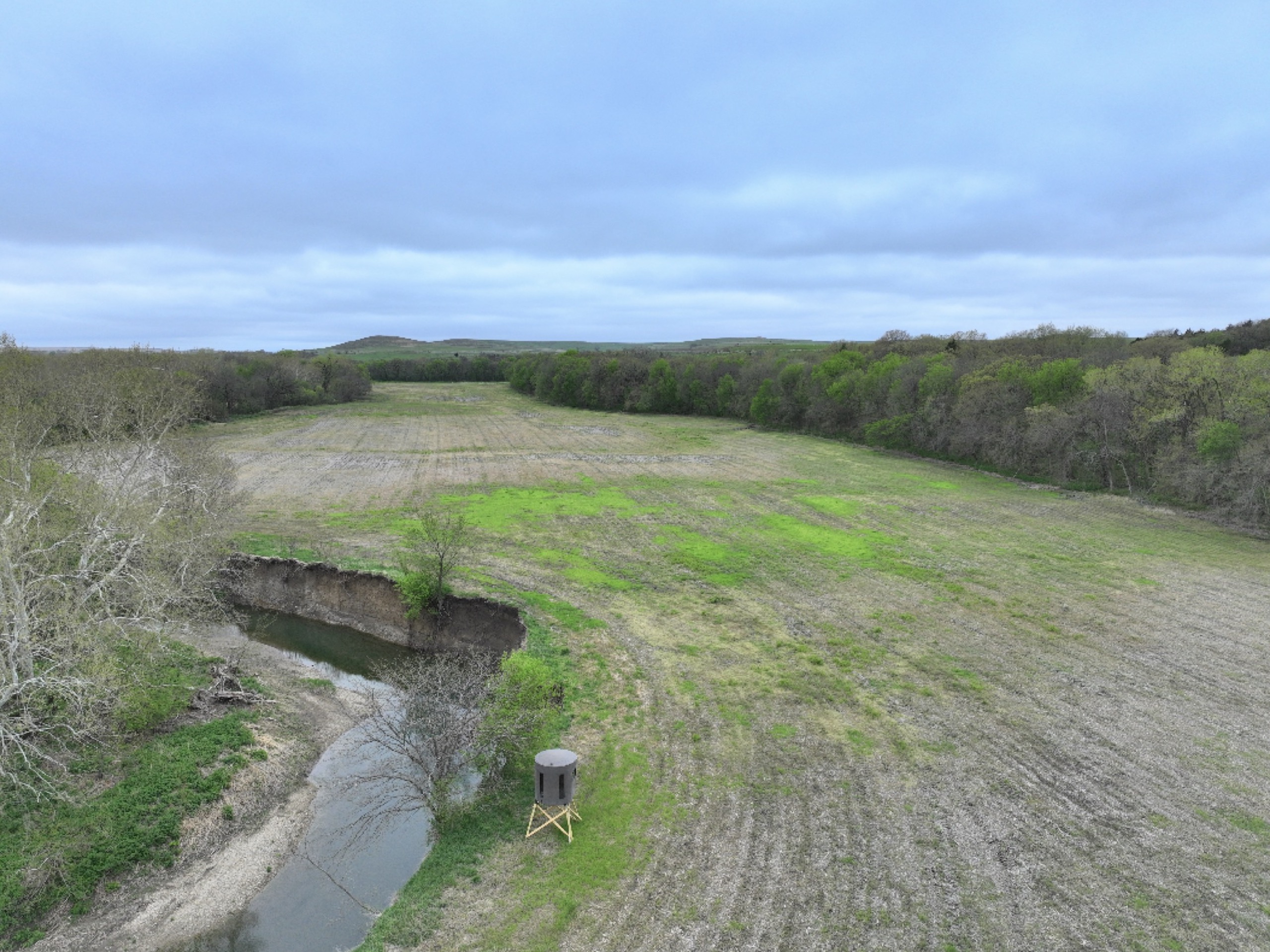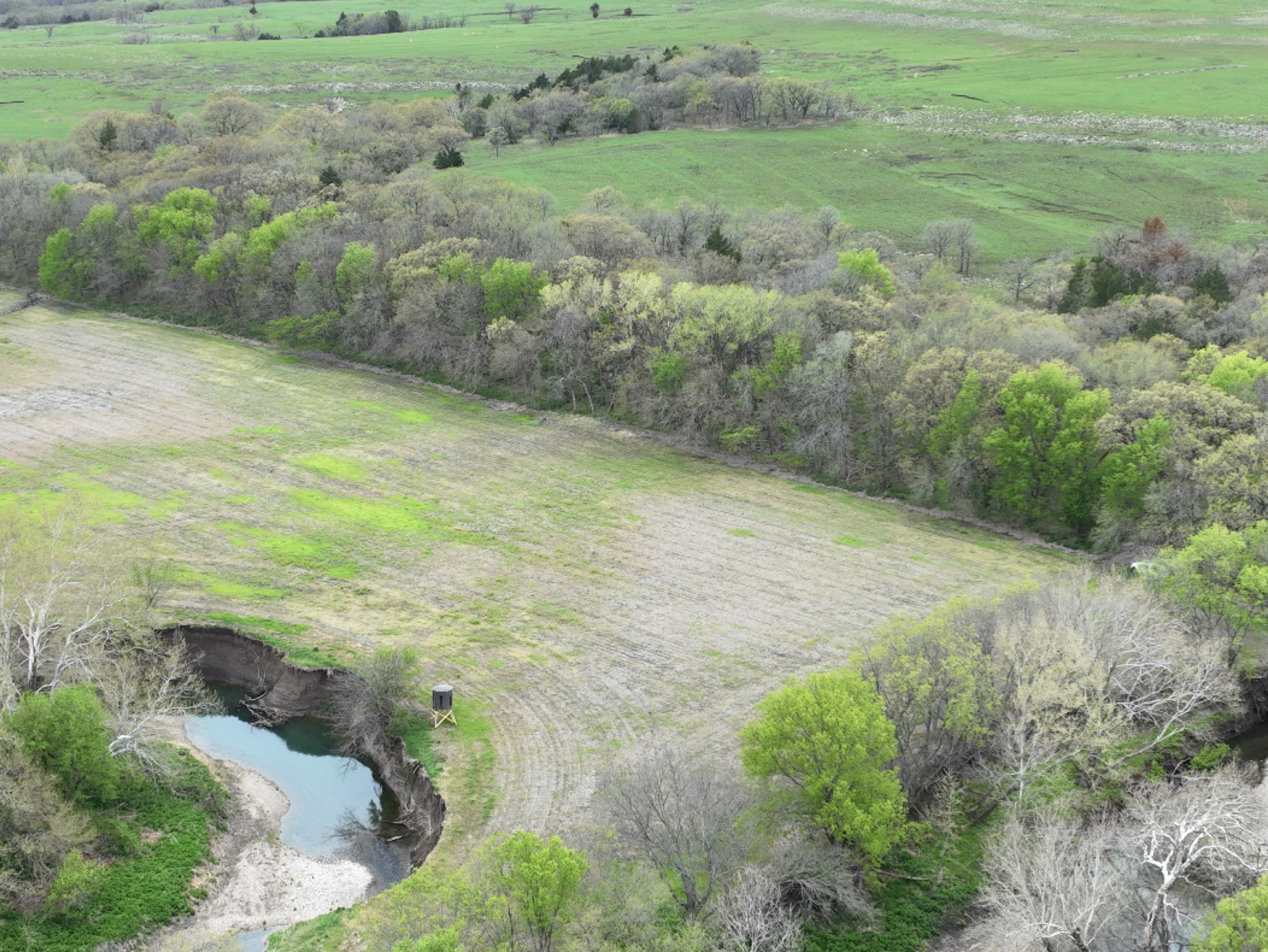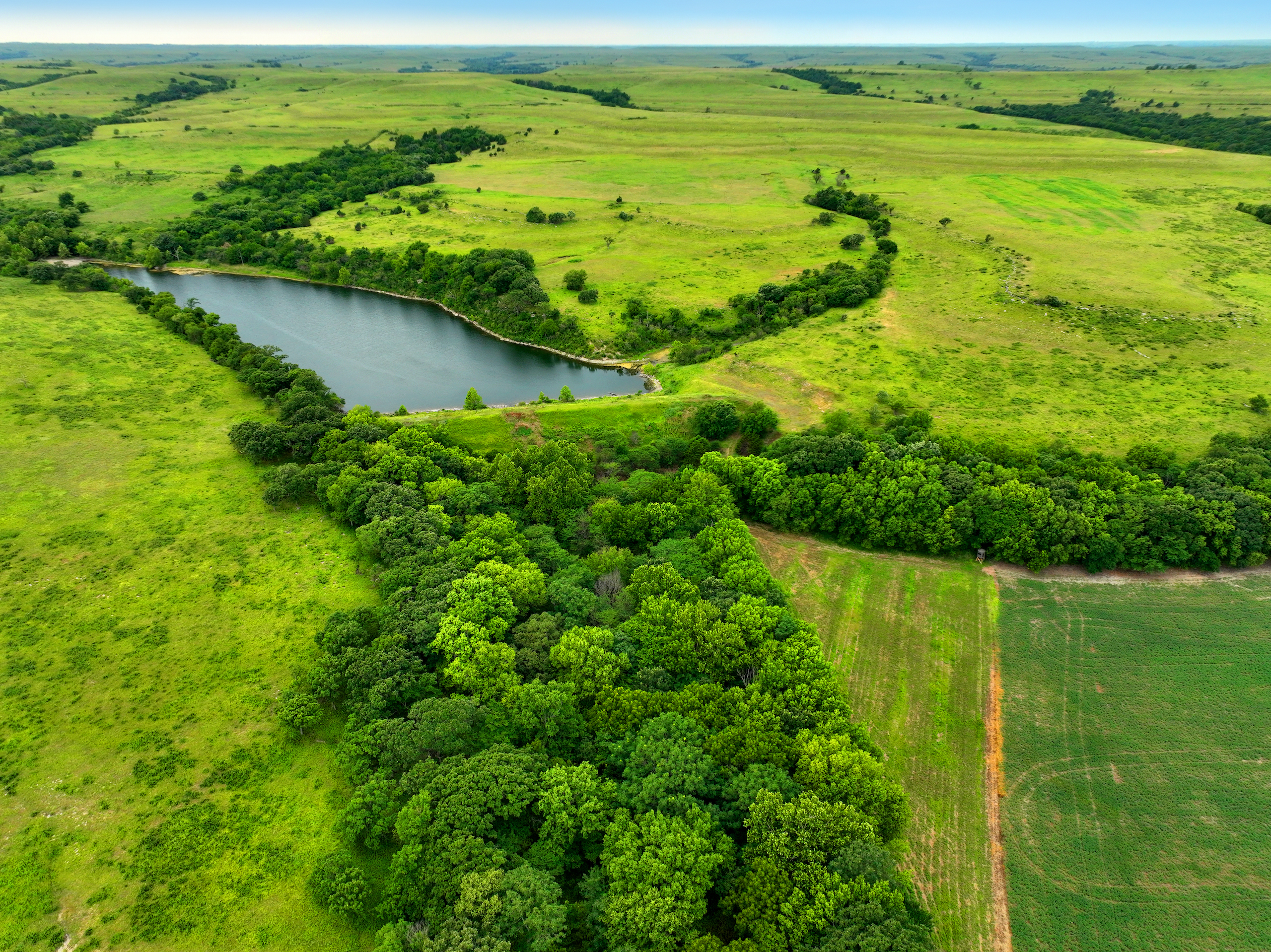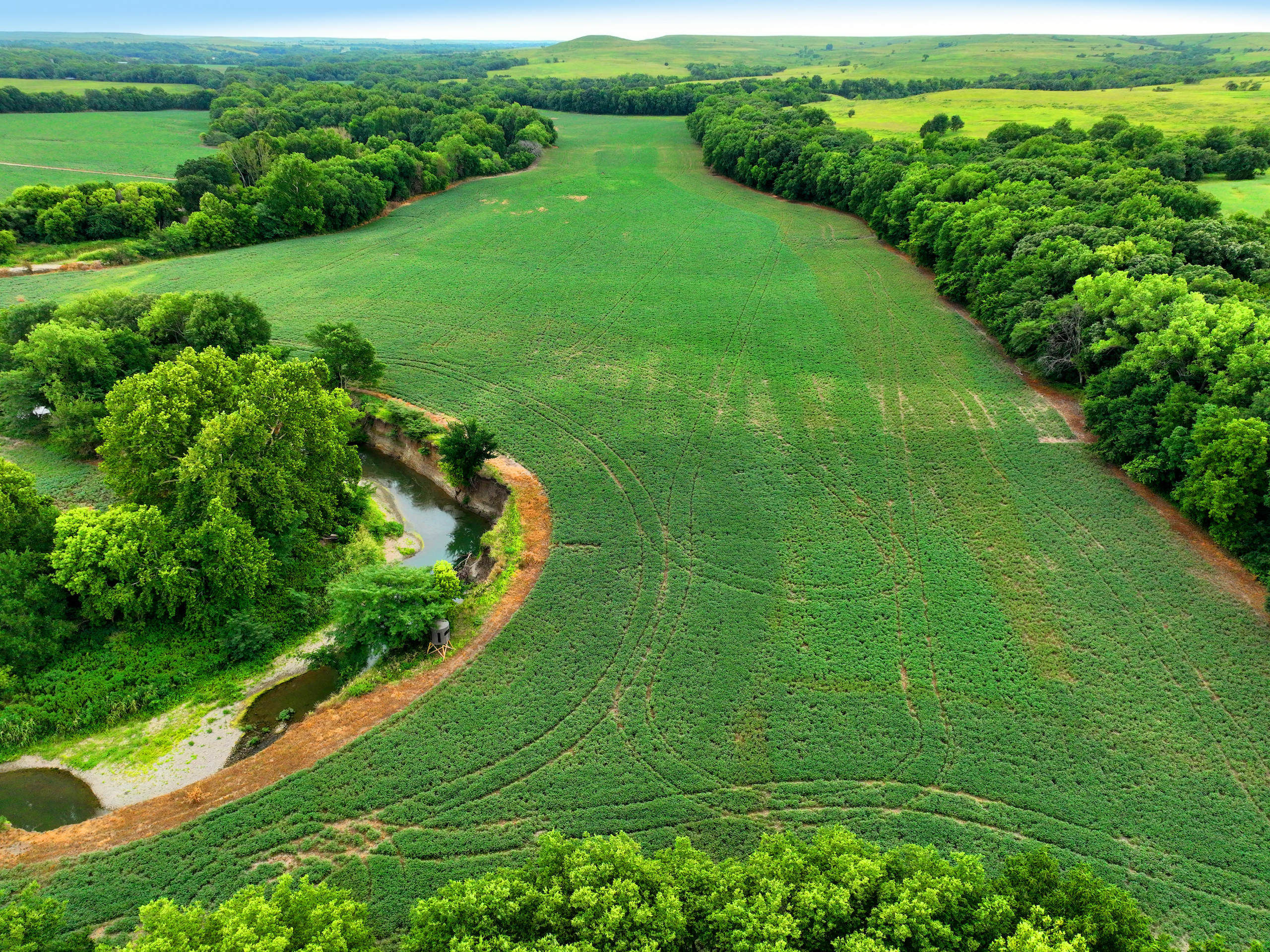 There are not too many farms on the open market that will be able to compete with this one when it comes to recreation. This farm is located approximately 6 miles south of Alma, Kansas, on Hessdale Road in Wabaunsee County. If you’re an avid sportsman looking for a turn-key property, I’m not sure what more you could ask for. The east branch of mill creek winds through the entire property creating approximately one mile of creek frontage. Four separate crop fields surrounded with timber are situated throughout the farm; 2 of the crop fields are hidden plots located between the creek and the flint hills timber/pasture. This creates unreal setups when it comes to whitetails and turkeys. Three new Banks Blinds have been strategically placed in these isolated plots making for some of the best Kansas hunting you’ll find in the eastern portion of the state. Tree stands are also scattered throughout the timber draws and creek banks if you're more of a stand guy. Located on the southwest portion of this tract is a stunning 9-acre lake with rock banks and crystal-clear water. This lake is loaded with fish; bass and catfish are the dominant species. Approximately 160-acres of cropland exist, usually planted to corn or soybeans. Currently, 40 acres of corn is planted while the balance is planted to soybeans. A cash rental agreement between the landowner and the tenant is in place on the cropland; no grazing lease exists. While turkey numbers throughout Kansas are down, this property seems to have an abundance of turkeys. Several toms are calling this place home, roosting in the mature oak trees and strutting in the isolated crop fields. Whitetails are a staple; there is definitely a chance to harvest a trophy whitetail year after year on this farm. There are two separate clover food plots located in different portions of the farm. This farm literally has it all: timber, creek, lake, cropland, food plots, and blinds. Call us today!