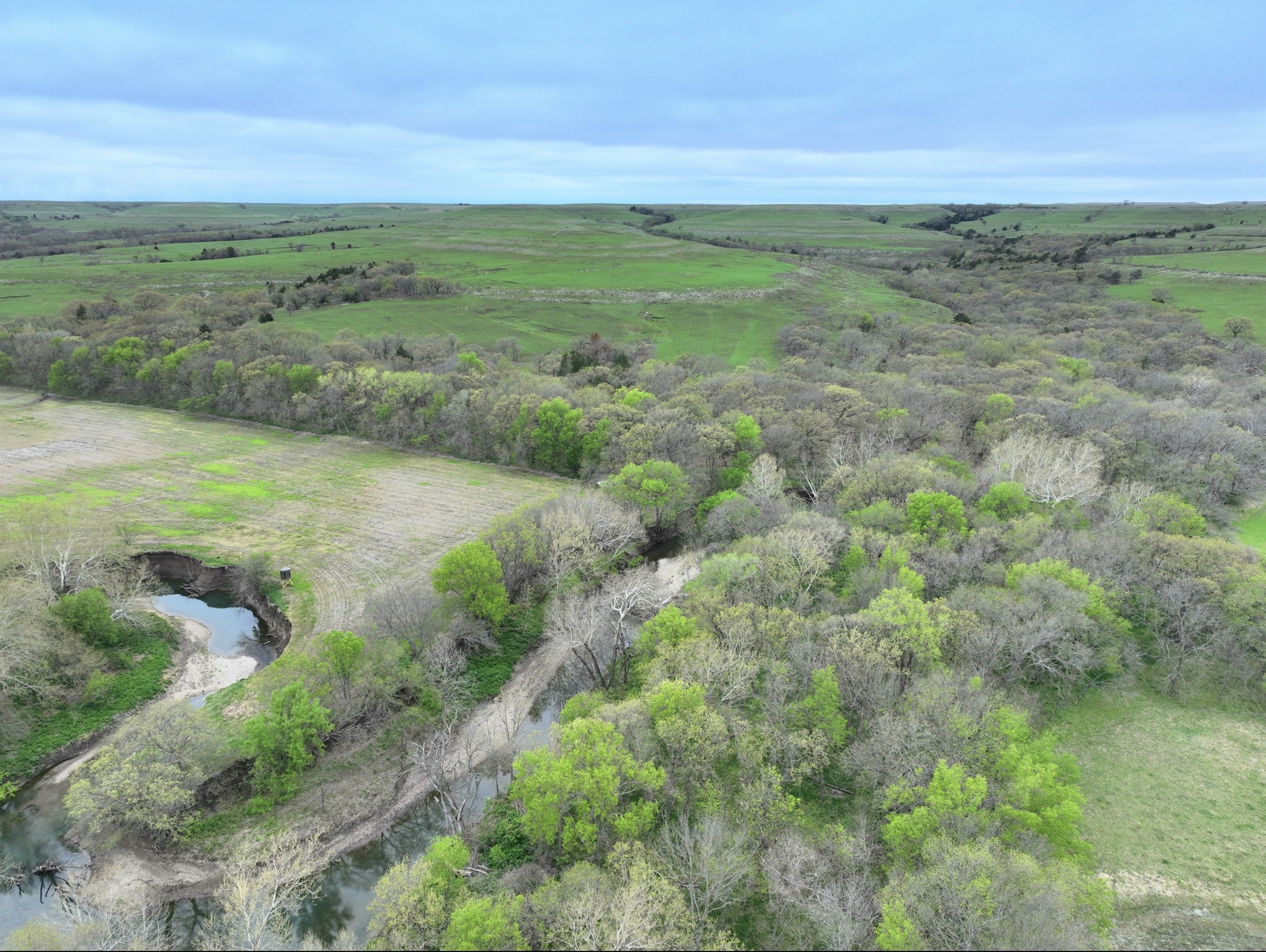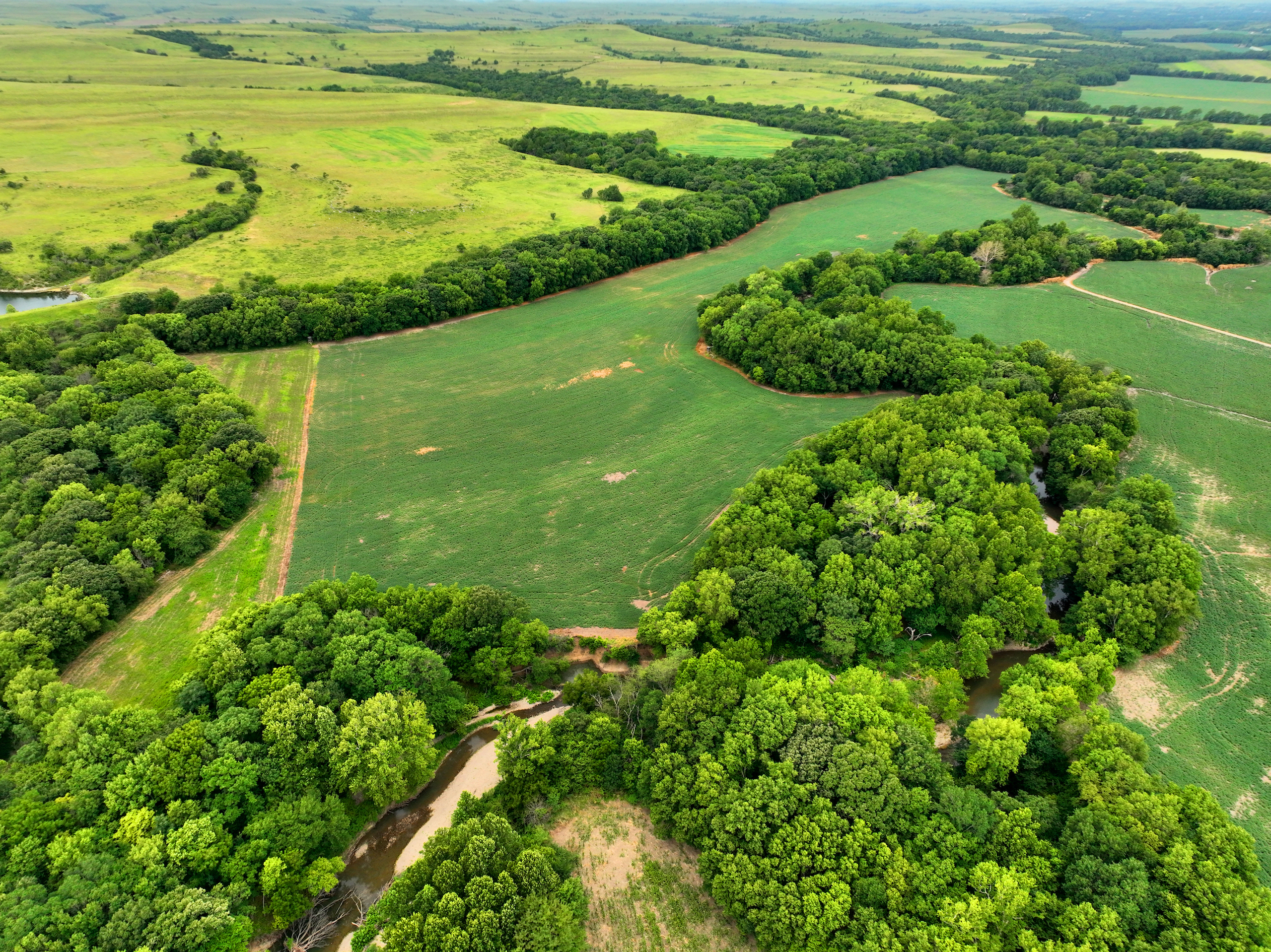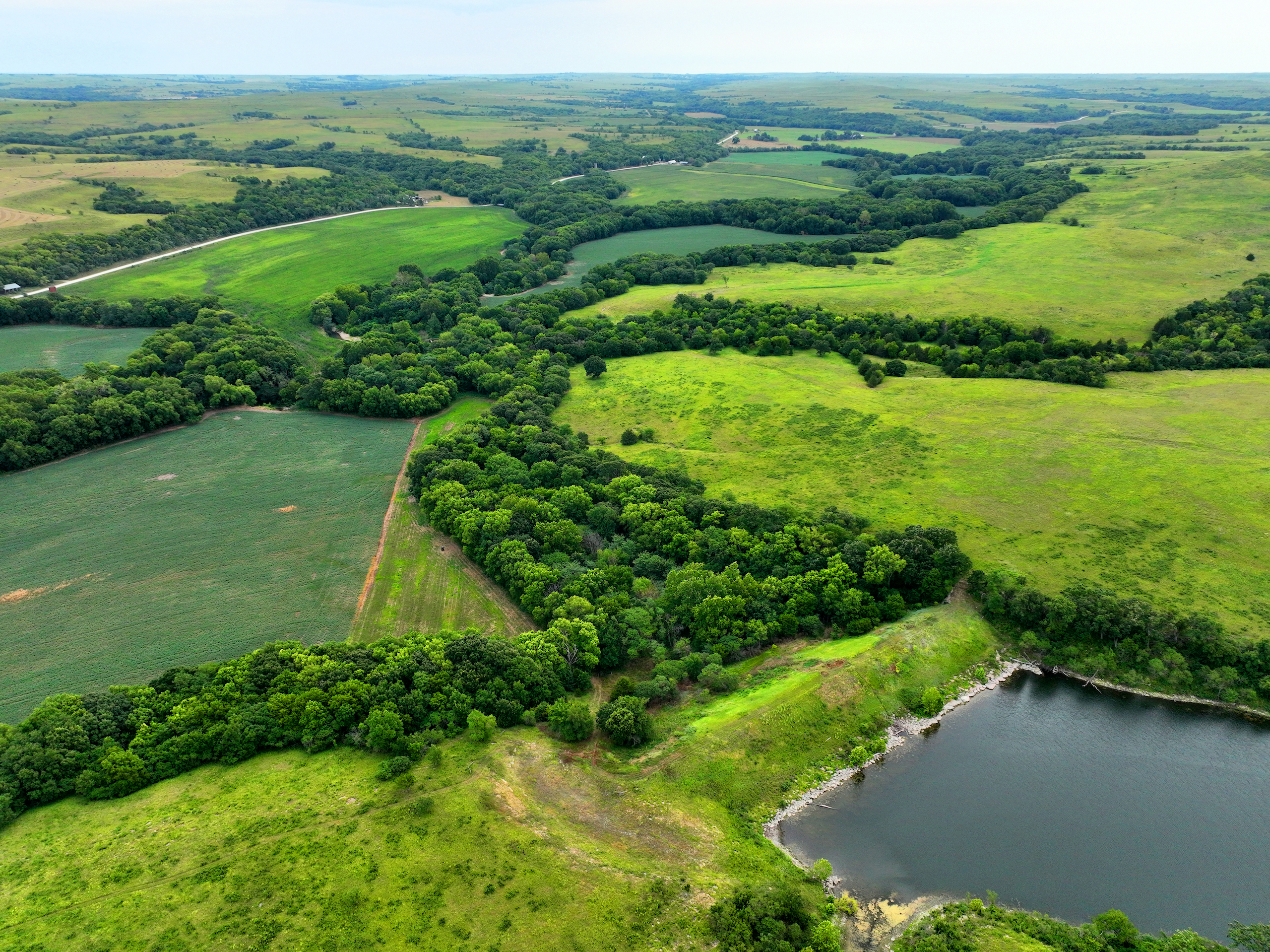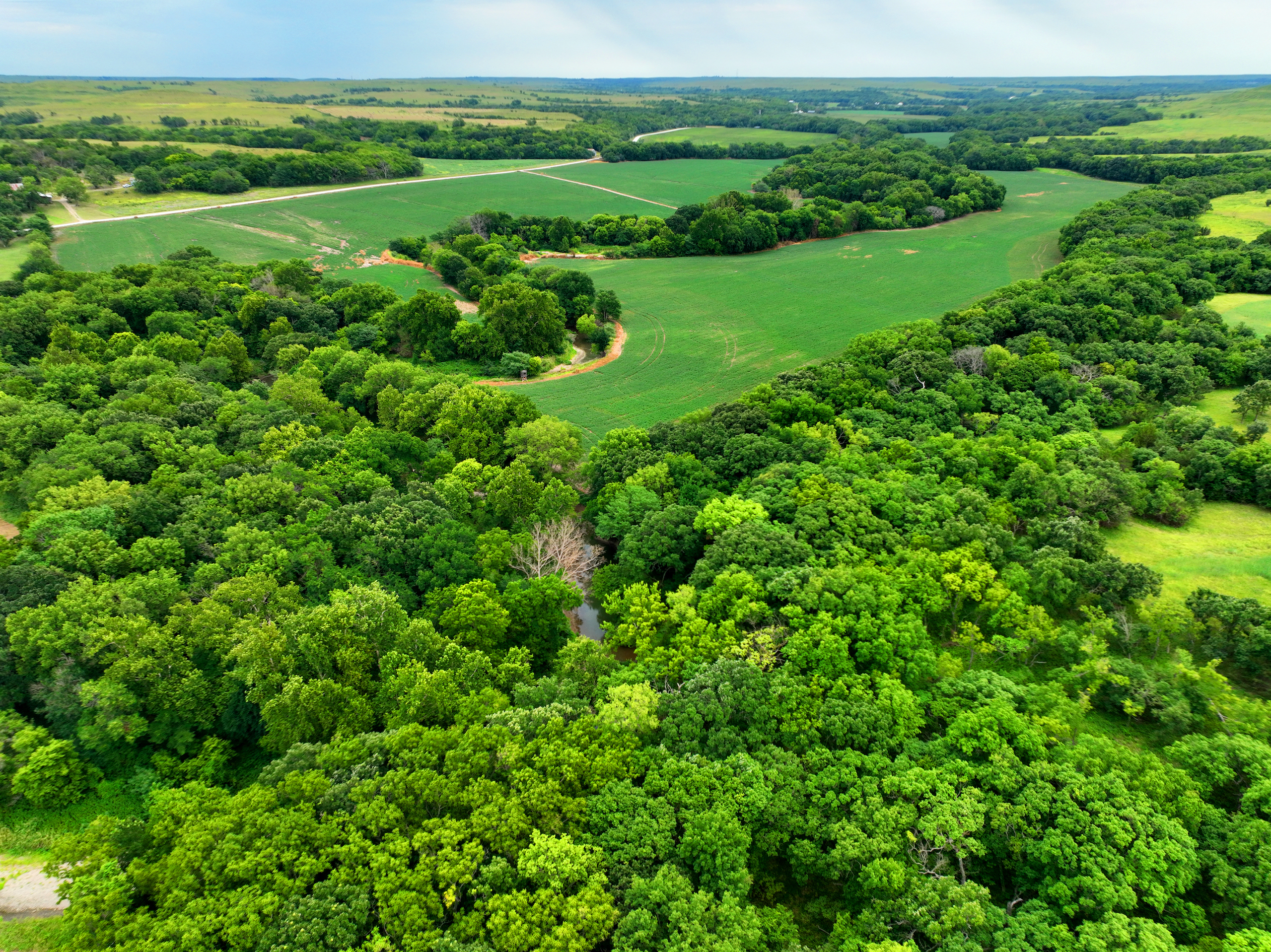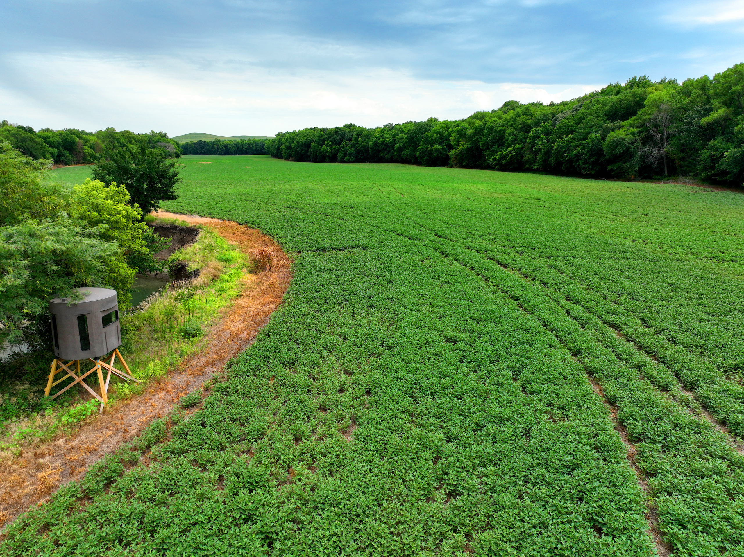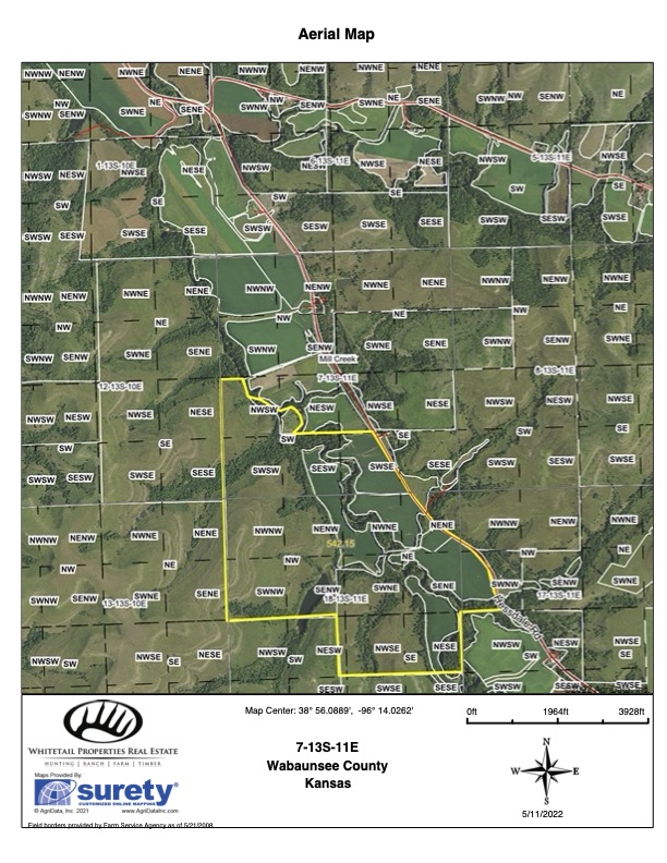 There are not too many farms on the open market that will be able to compete with this one when it comes to recreation. This farm is located approximately 6 miles south of Alma, Kansas, on Hessdale Road in Wabaunsee County. If you’re an avid sportsman looking for a turn-key property, I’m not sure what more you could ask for. The east branch of mill creek winds through the entire property creating approximately one mile of creek frontage. Four separate crop fields surrounded with timber are situated throughout the farm; 2 of the crop fields are hidden plots located between the creek and the flint hills timber/pasture. This creates unreal setups when it comes to whitetails and turkeys. Three new Banks Blinds have been strategically placed in these isolated plots making for some of the best Kansas hunting you’ll find in the eastern portion of the state. Tree stands are also scattered throughout the timber draws and creek banks if you're more of a stand guy. Located on the southwest portion of this tract is a stunning 9-acre lake with rock banks and crystal-clear water. This lake is loaded with fish; bass and catfish are the dominant species. Approximately 160-acres of cropland exist, usually planted to corn or soybeans. Currently, 40 acres of corn is planted while the balance is planted to soybeans. A cash rental agreement between the landowner and the tenant is in place on the cropland; no grazing lease exists. While turkey numbers throughout Kansas are down, this property seems to have an abundance of turkeys. Several toms are calling this place home, roosting in the mature oak trees and strutting in the isolated crop fields. Whitetails are a staple; there is definitely a chance to harvest a trophy whitetail year after year on this farm. There are two separate clover food plots located in different portions of the farm. This farm literally has it all: timber, creek, lake, cropland, food plots, and blinds. Call us today!