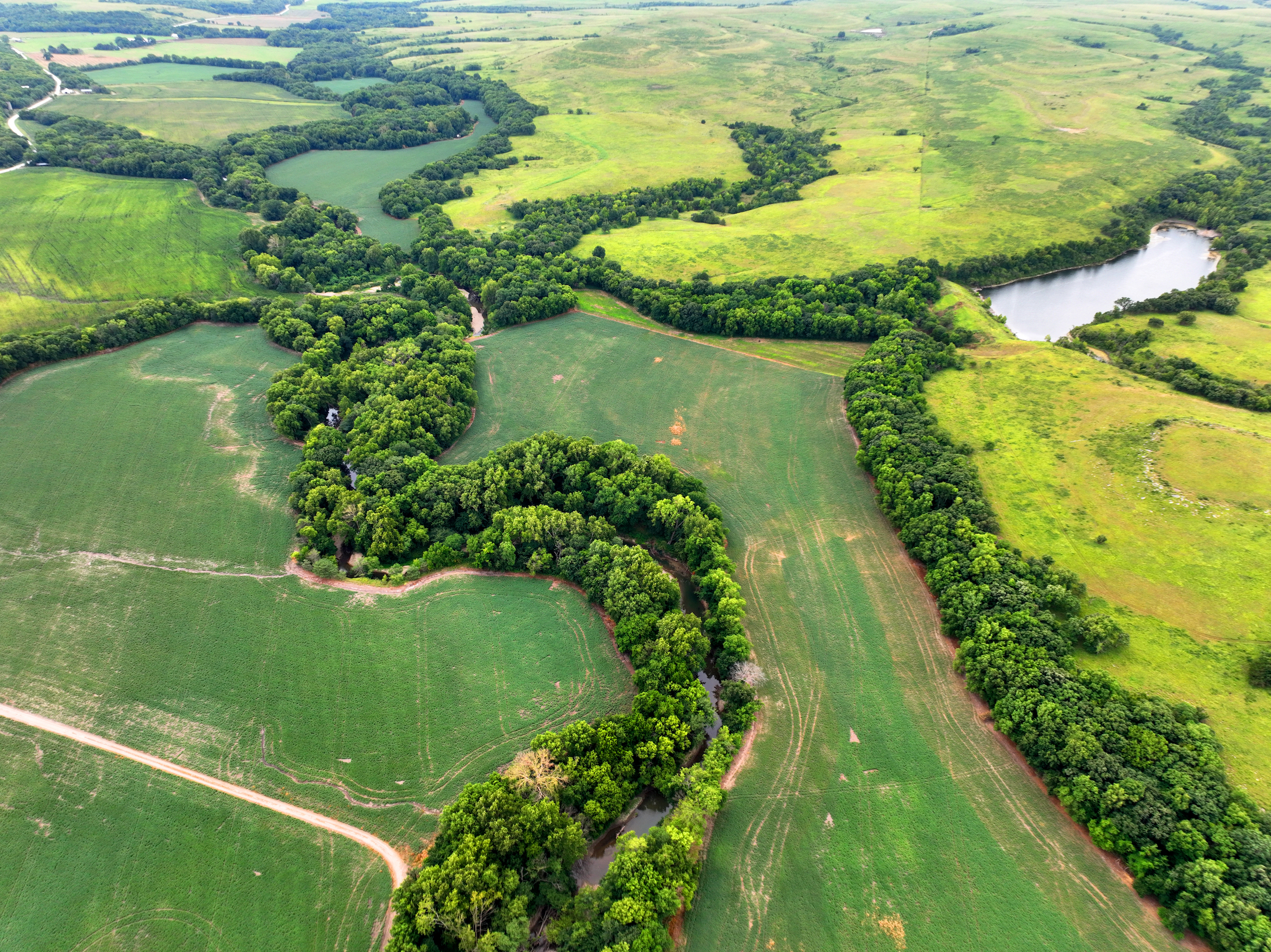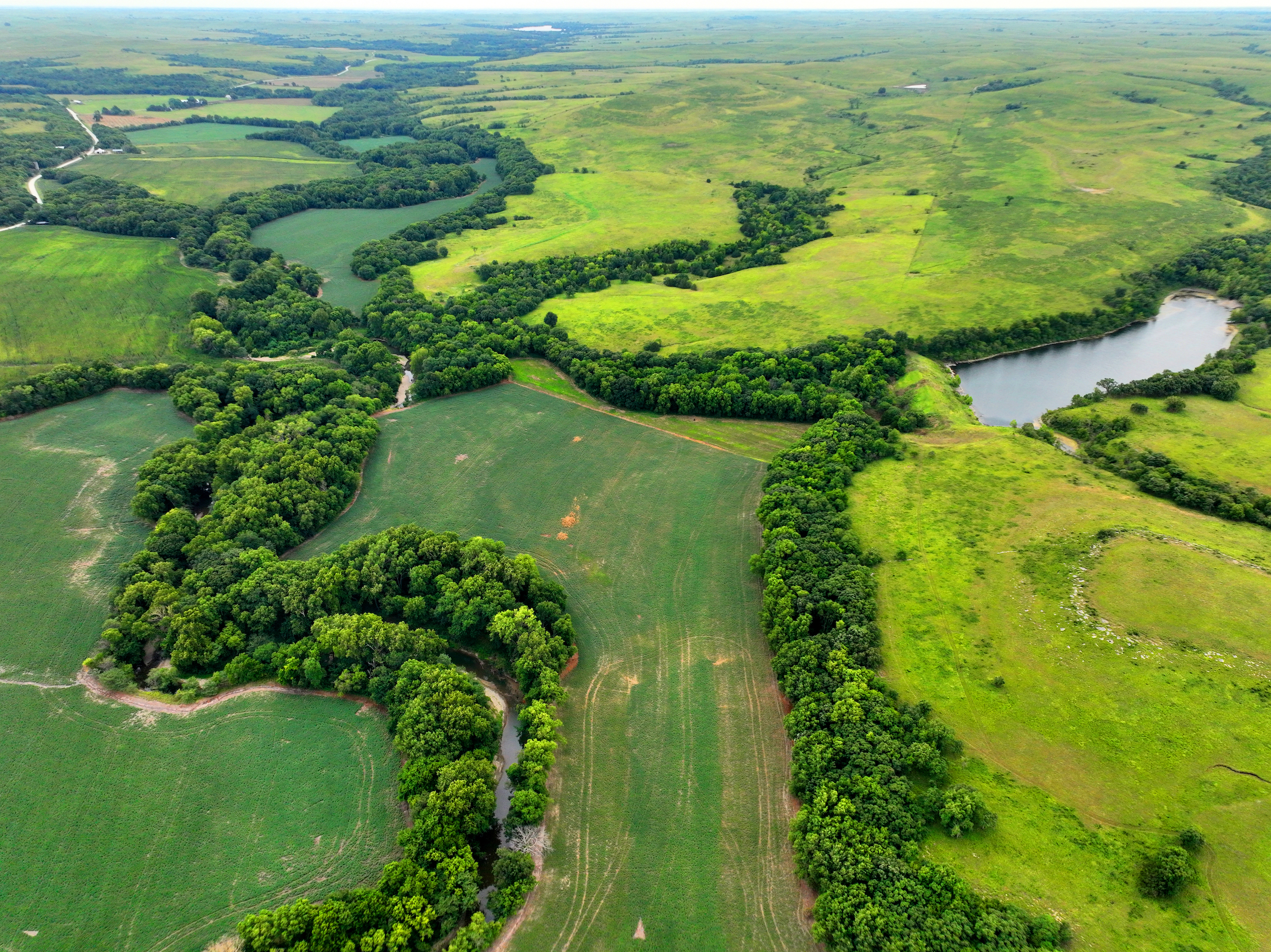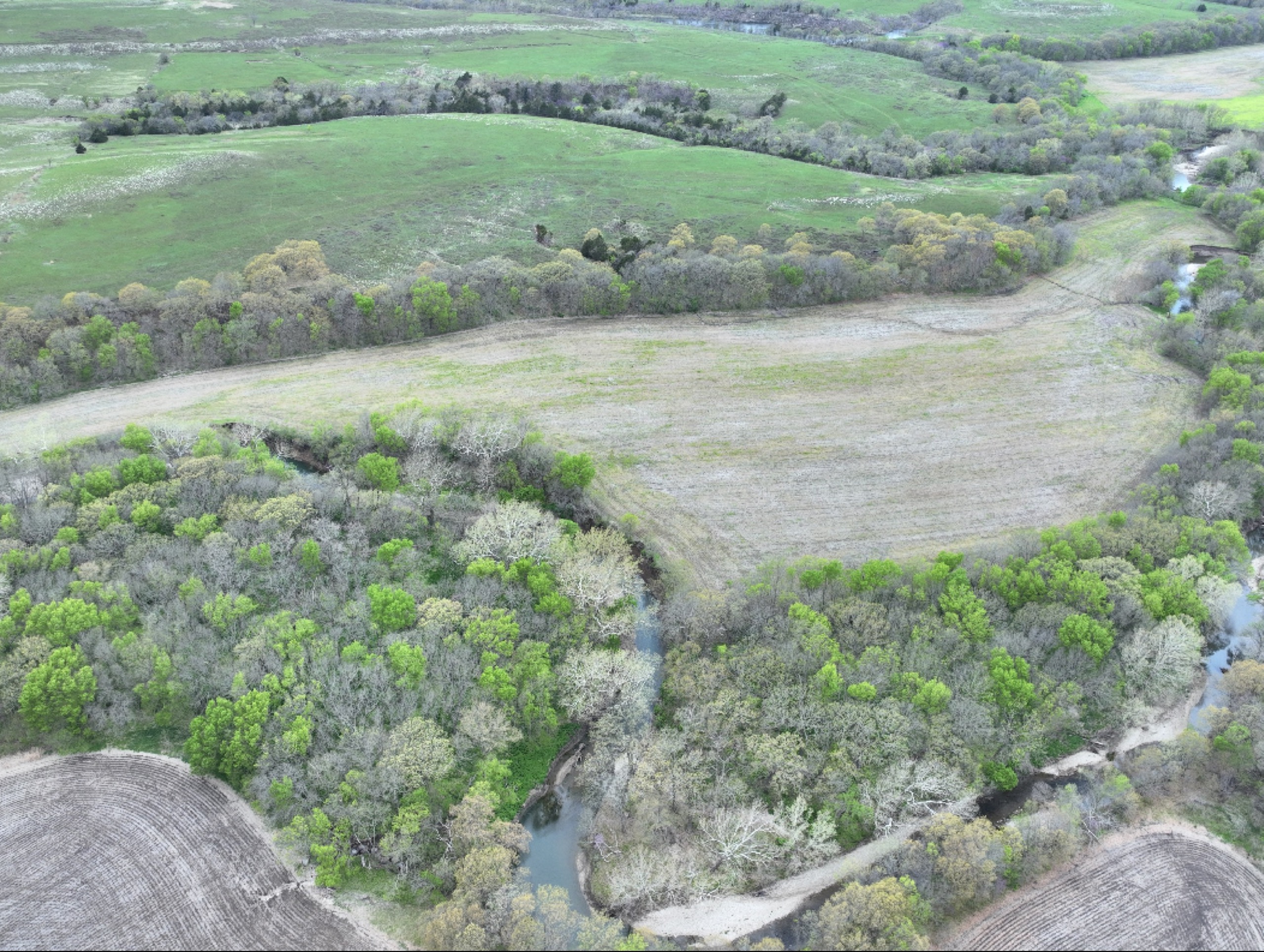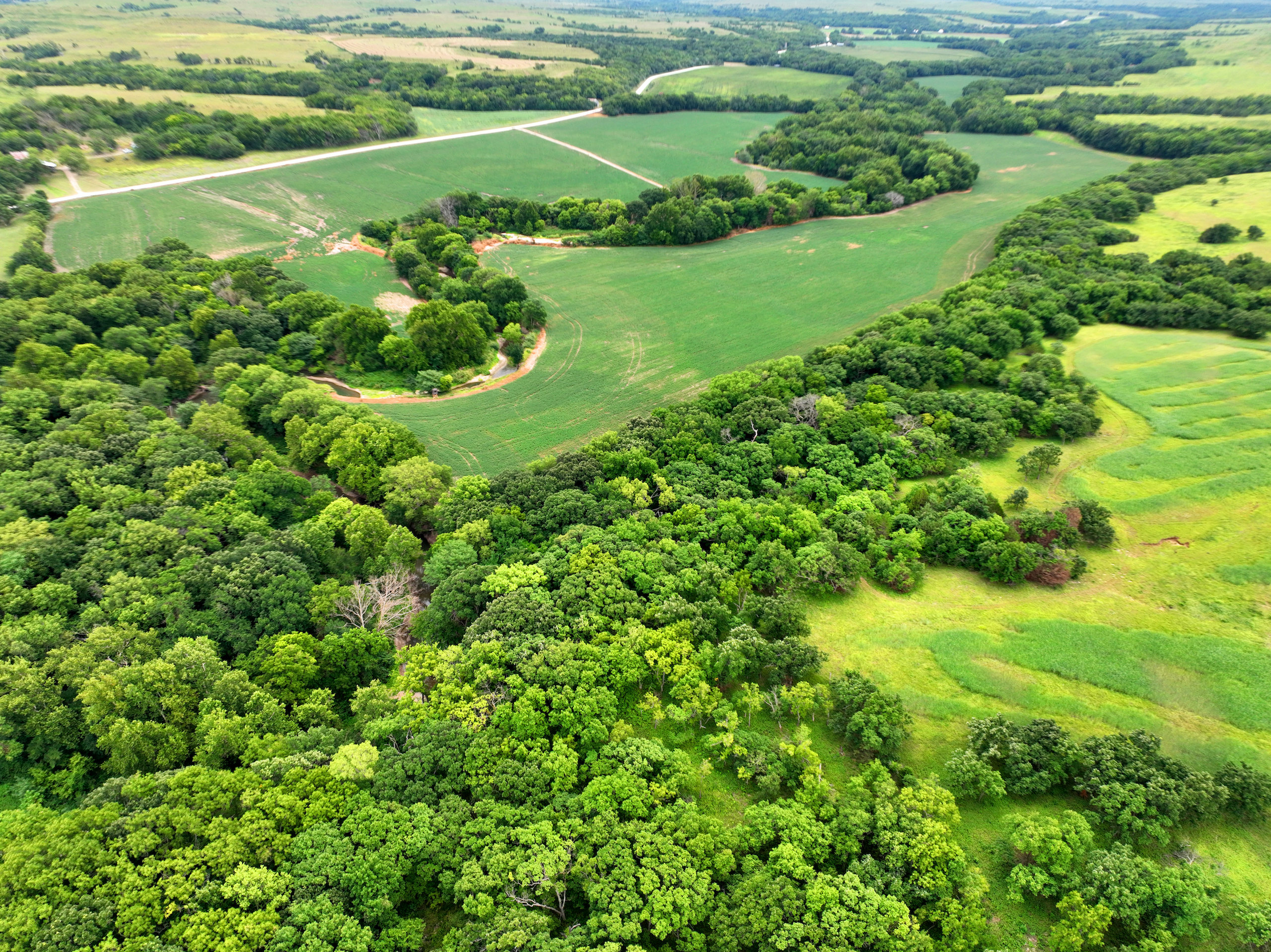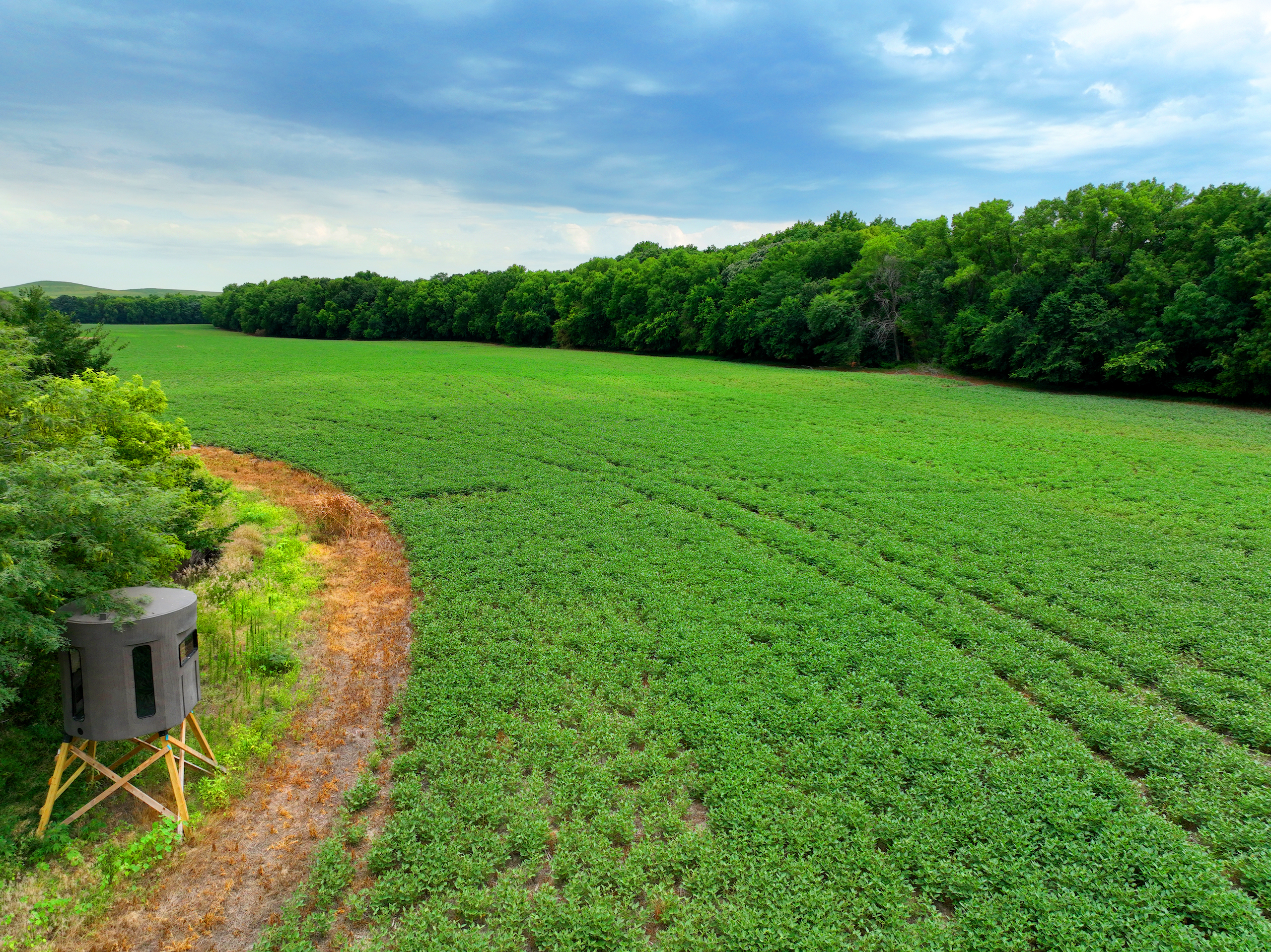 There are not too many farms on the open market that will be able to compete with this one when it comes to recreation. This farm is located approximately 6 miles south of Alma, Kansas, on Hessdale Road in Wabaunsee County. If you’re an avid sportsman looking for a turn-key property, I’m not sure what more you could ask for. The east branch of mill creek winds through the entire property creating approximately one mile of creek frontage. Four separate crop fields surrounded with timber are situated throughout the farm; 2 of the crop fields are hidden plots located between the creek and the flint hills timber/pasture. This creates unreal setups when it comes to whitetails and turkeys. Three new Banks Blinds have been strategically placed in these isolated plots making for some of the best Kansas hunting you’ll find in the eastern portion of the state. Tree stands are also scattered throughout the timber draws and creek banks if you're more of a stand guy. Located on the southwest portion of this tract is a stunning 9-acre lake with rock banks and crystal-clear water. This lake is loaded with fish; bass and catfish are the dominant species. Approximately 160-acres of cropland exist, usually planted to corn or soybeans. Currently, 40 acres of corn is planted while the balance is planted to soybeans. A cash rental agreement between the landowner and the tenant is in place on the cropland; no grazing lease exists. While turkey numbers throughout Kansas are down, this property seems to have an abundance of turkeys. Several toms are calling this place home, roosting in the mature oak trees and strutting in the isolated crop fields. Whitetails are a staple; there is definitely a chance to harvest a trophy whitetail year after year on this farm. There are two separate clover food plots located in different portions of the farm. This farm literally has it all: timber, creek, lake, cropland, food plots, and blinds. Call us today!
