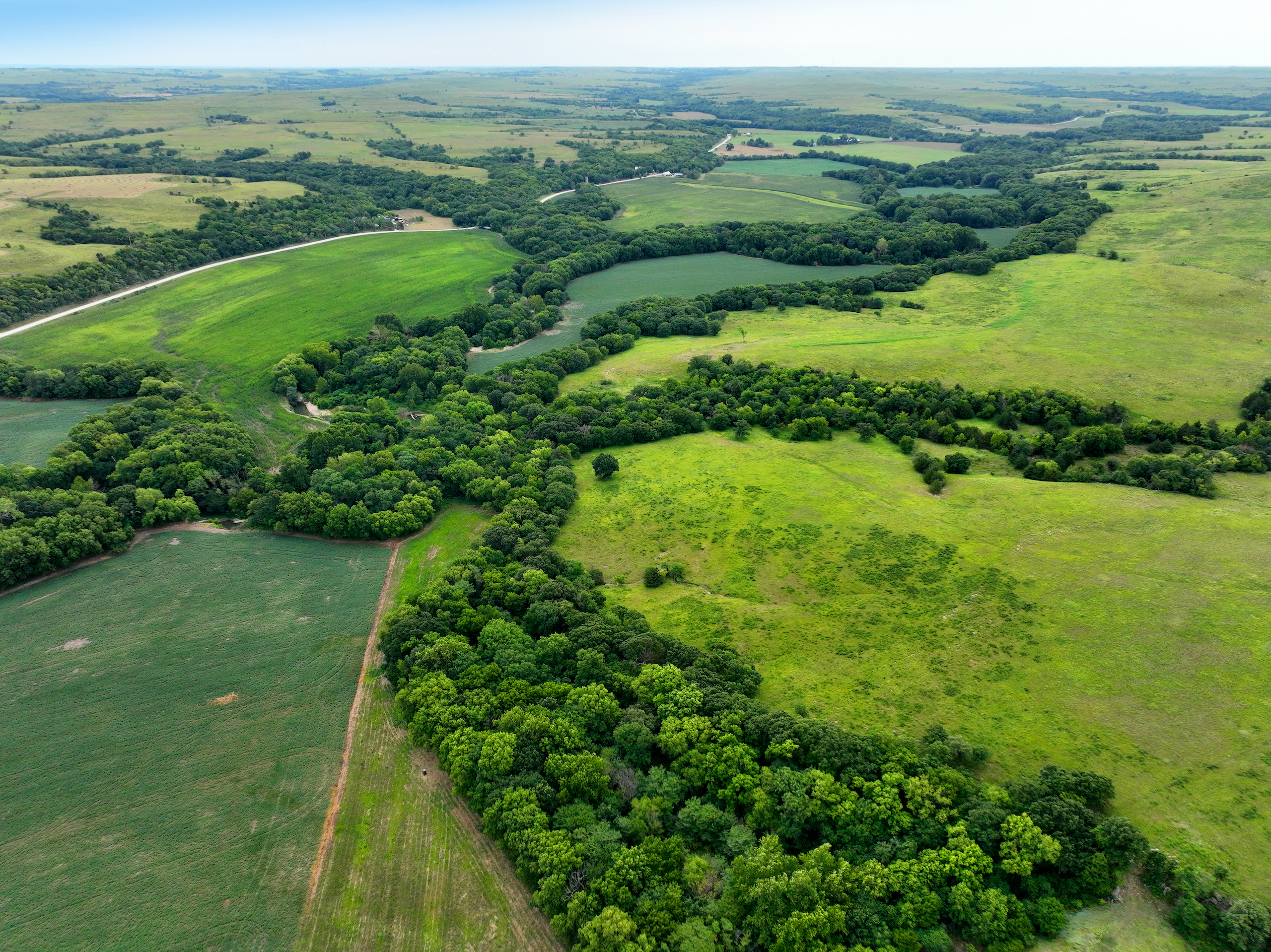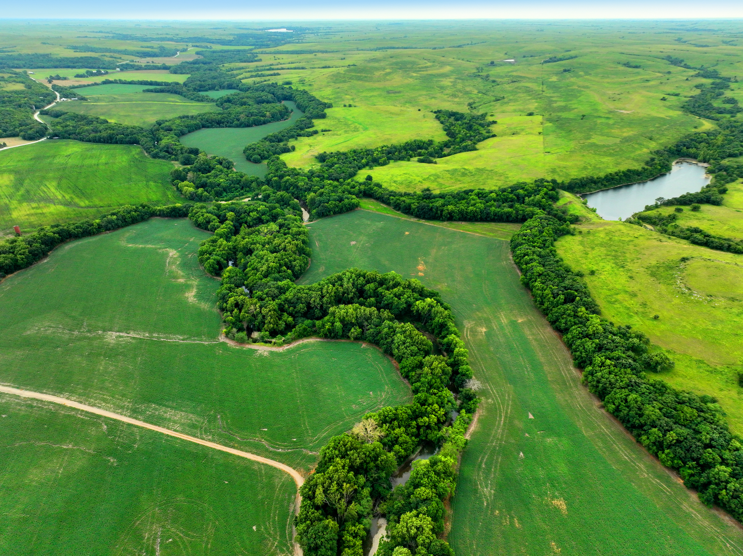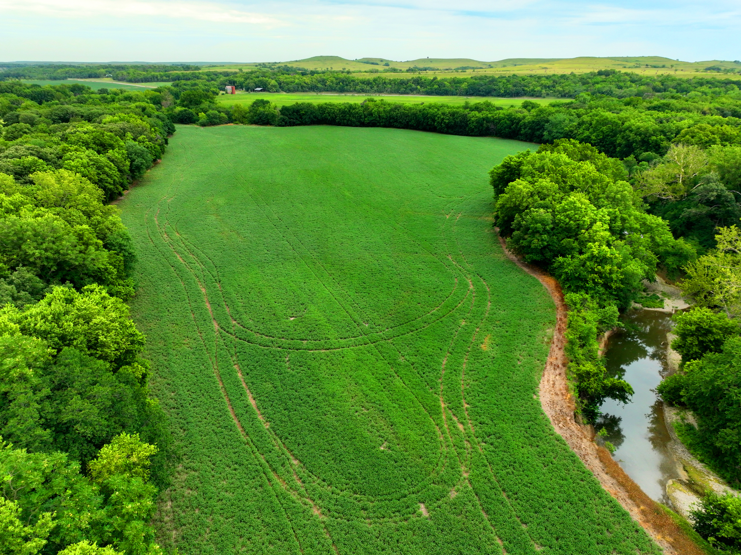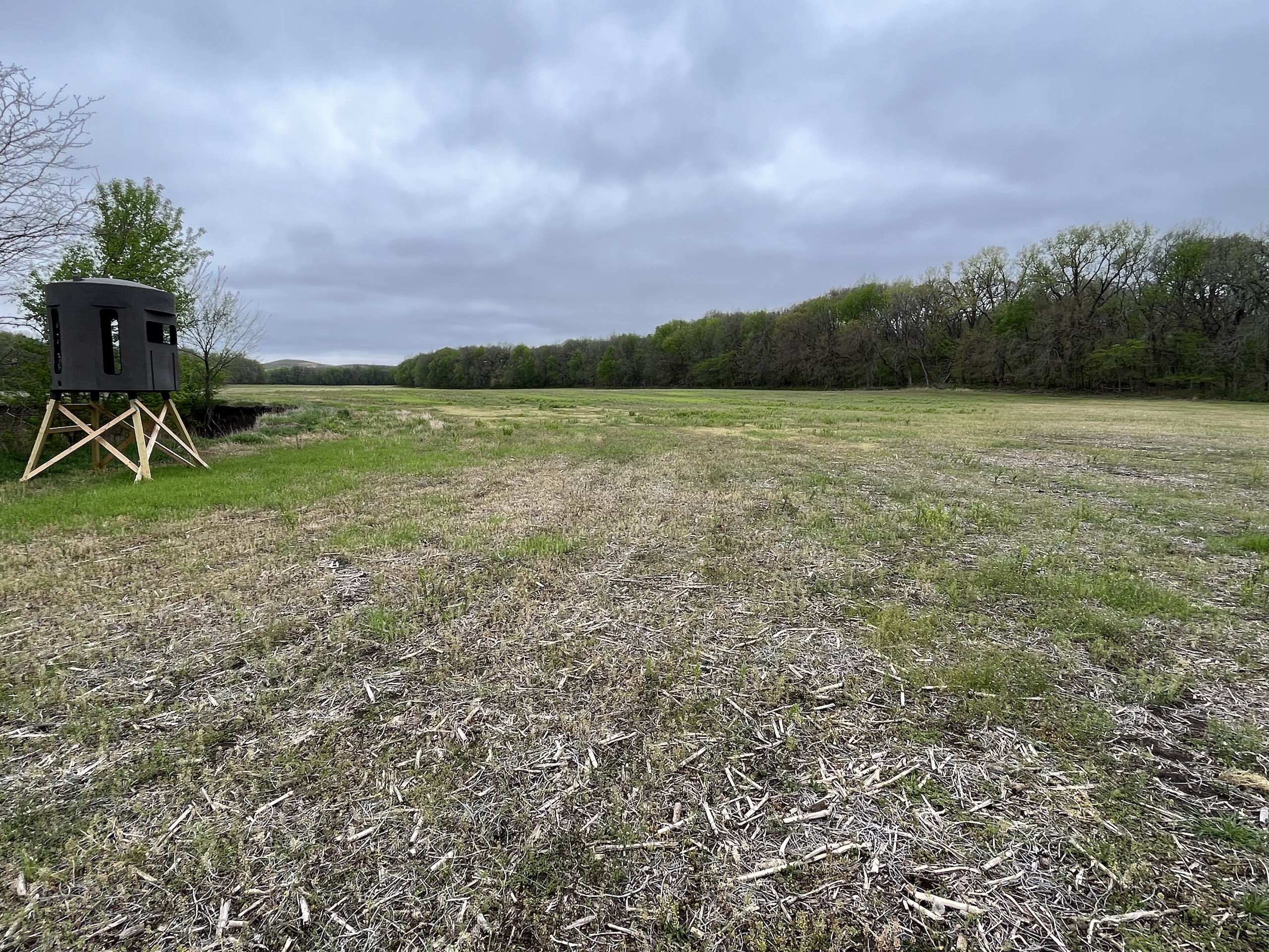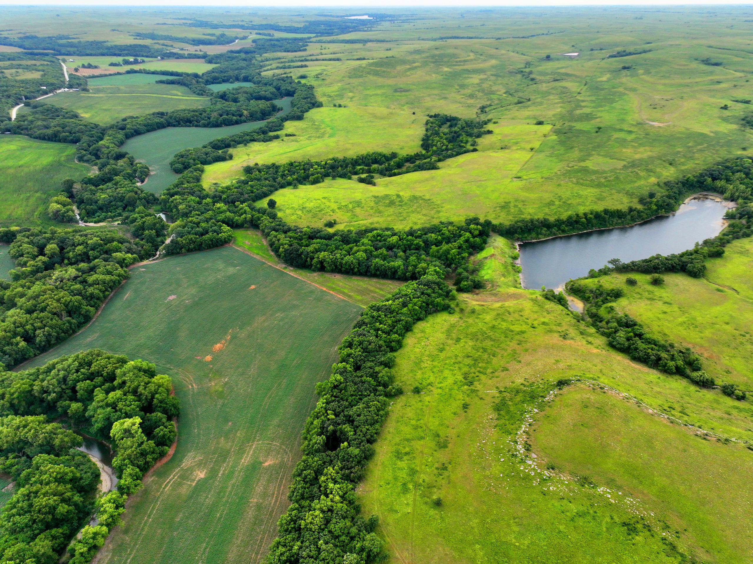 There are not too many farms on the open market that will be able to compete with this one when it comes to recreation. This farm is located approximately 6 miles south of Alma, Kansas, on Hessdale Road in Wabaunsee County. If you’re an avid sportsman looking for a turn-key property, I’m not sure what more you could ask for. The east branch of mill creek winds through the entire property creating approximately one mile of creek frontage. Four separate crop fields surrounded with timber are situated throughout the farm; 2 of the crop fields are hidden plots located between the creek and the flint hills timber/pasture. This creates unreal setups when it comes to whitetails and turkeys. Three new Banks Blinds have been strategically placed in these isolated plots making for some of the best Kansas hunting you’ll find in the eastern portion of the state. Tree stands are also scattered throughout the timber draws and creek banks if you're more of a stand guy. Located on the southwest portion of this tract is a stunning 9-acre lake with rock banks and crystal-clear water. This lake is loaded with fish; bass and catfish are the dominant species. Approximately 160-acres of cropland exist, usually planted to corn or soybeans. Currently, 40 acres of corn is planted while the balance is planted to soybeans. A cash rental agreement between the landowner and the tenant is in place on the cropland; no grazing lease exists. While turkey numbers throughout Kansas are down, this property seems to have an abundance of turkeys. Several toms are calling this place home, roosting in the mature oak trees and strutting in the isolated crop fields. Whitetails are a staple; there is definitely a chance to harvest a trophy whitetail year after year on this farm. There are two separate clover food plots located in different portions of the farm. This farm literally has it all: timber, creek, lake, cropland, food plots, and blinds. Call us today!