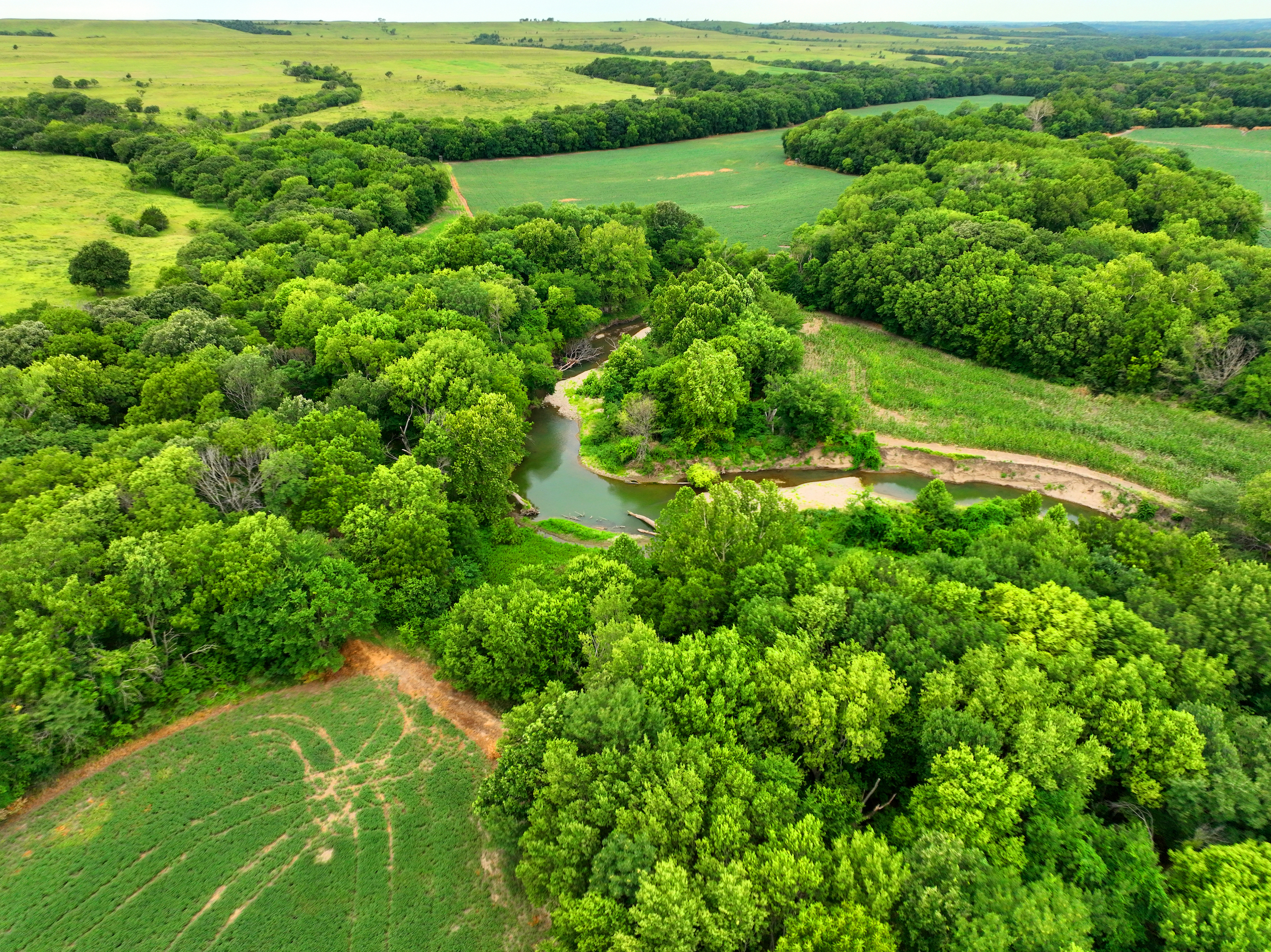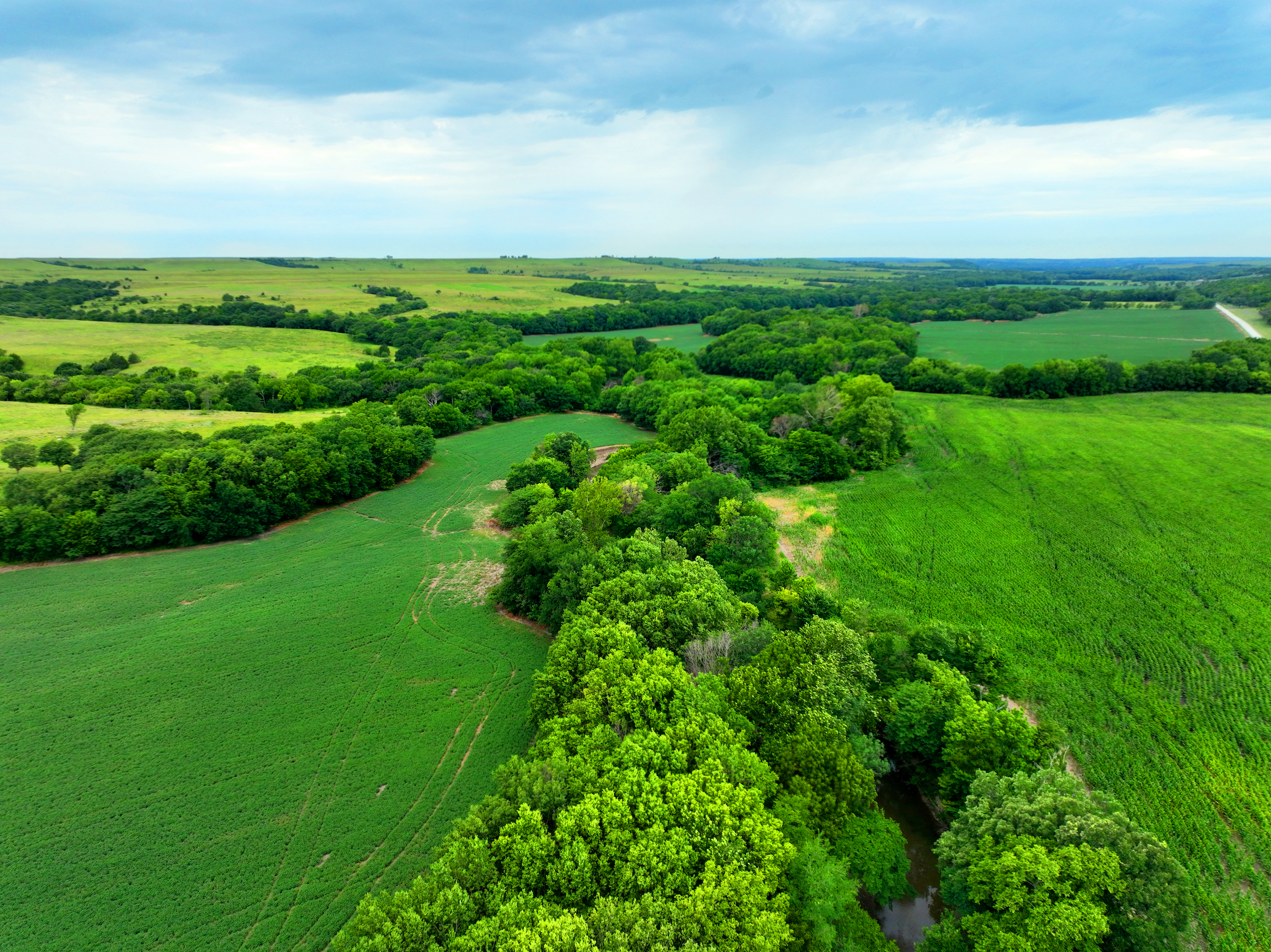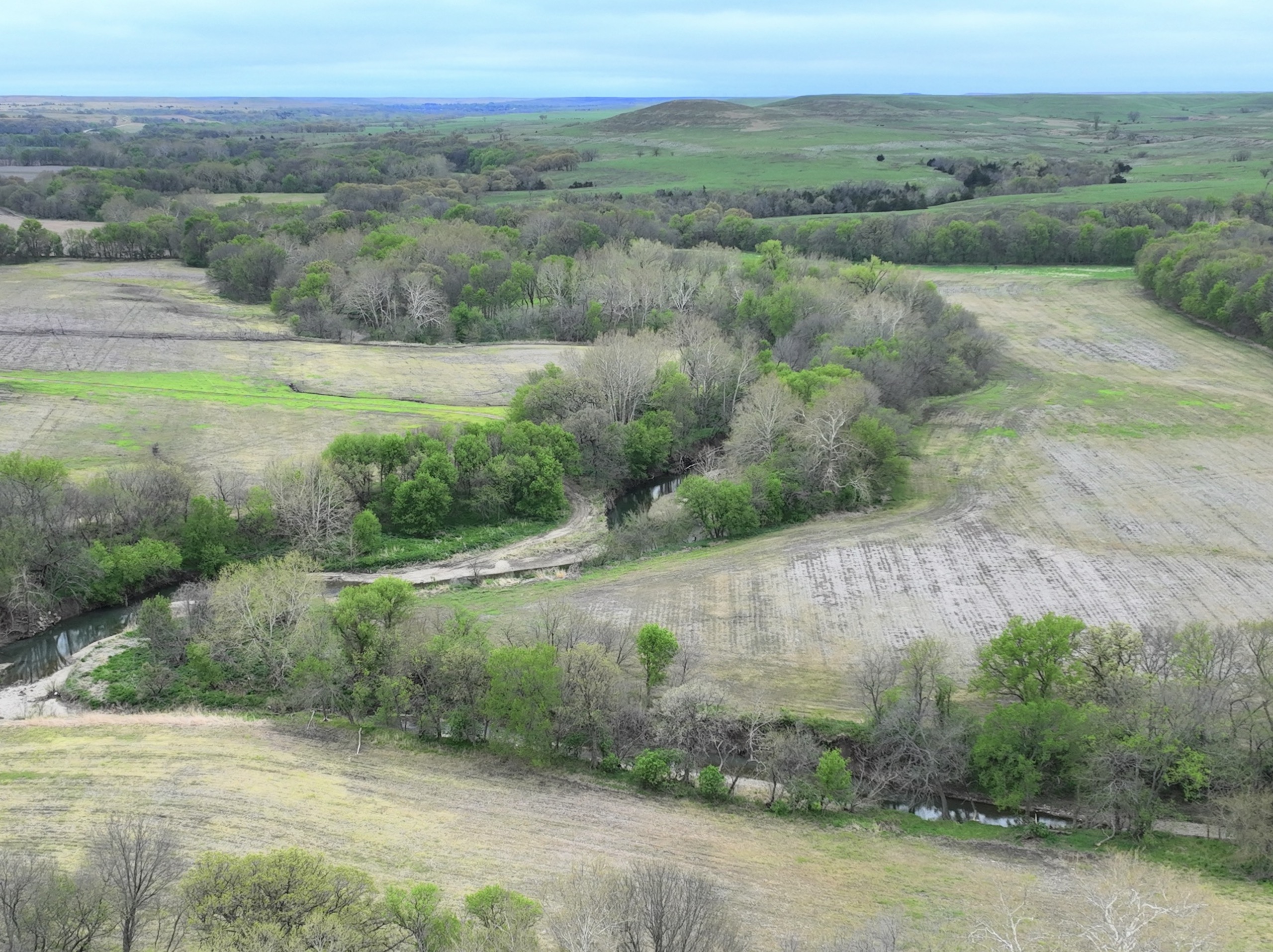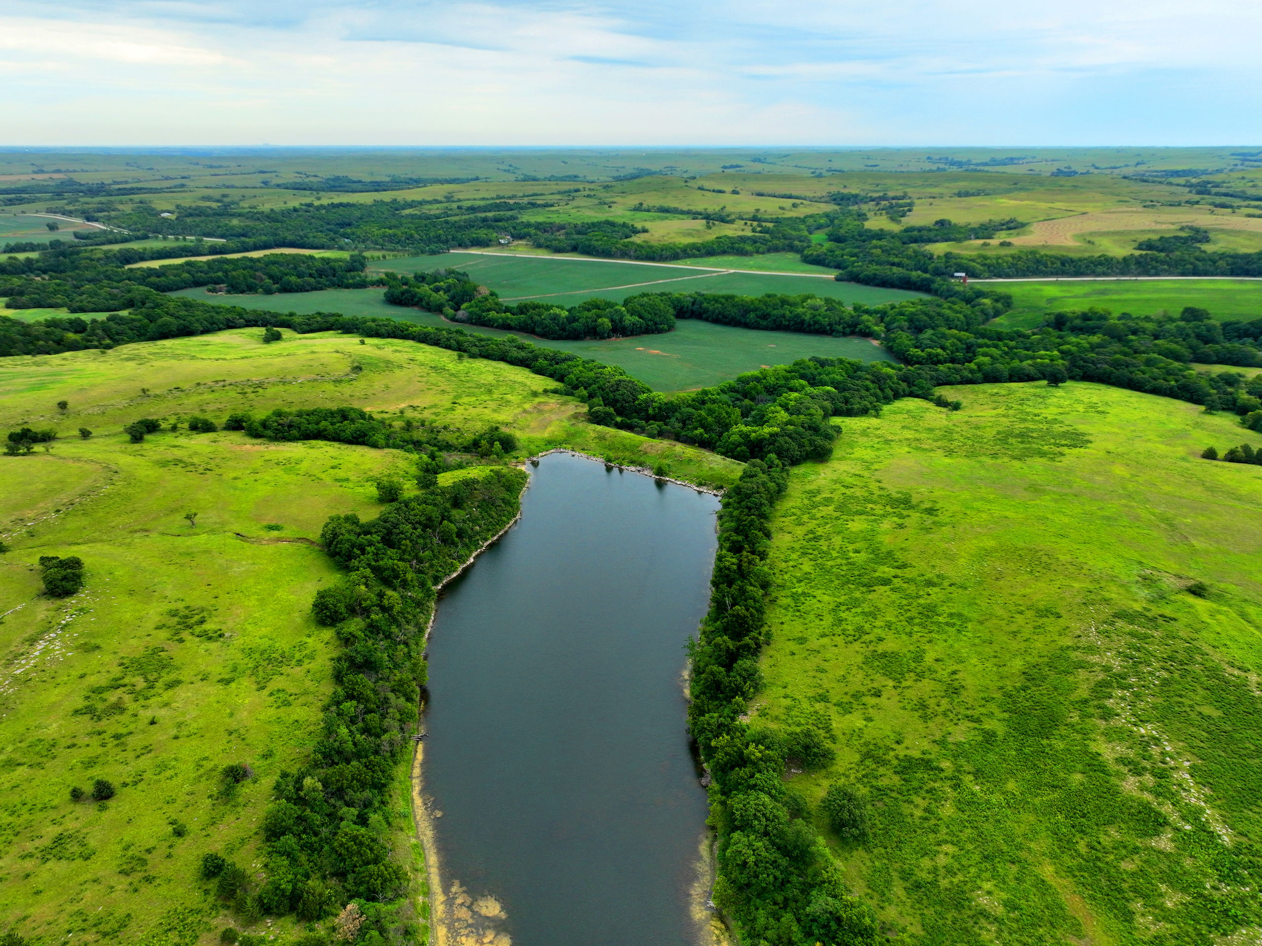 There are not too many farms on the open market that will be able to compete with this one when it comes to recreation. This farm is located approximately 6 miles south of Alma, Kansas, on Hessdale Road in Wabaunsee County. If you’re an avid sportsman looking for a turn-key property, I’m not sure what more you could ask for. The east branch of mill creek winds through the entire property creating approximately one mile of creek frontage. Four separate crop fields surrounded with timber are situated throughout the farm; 2 of the crop fields are hidden plots located between the creek and the flint hills timber/pasture. This creates unreal setups when it comes to whitetails and turkeys. Three new Banks Blinds have been strategically placed in these isolated plots making for some of the best Kansas hunting you’ll find in the eastern portion of the state. Tree stands are also scattered throughout the timber draws and creek banks if you're more of a stand guy. Located on the southwest portion of this tract is a stunning 9-acre lake with rock banks and crystal-clear water. This lake is loaded with fish; bass and catfish are the dominant species. Approximately 160-acres of cropland exist, usually planted to corn or soybeans. Currently, 40 acres of corn is planted while the balance is planted to soybeans. A cash rental agreement between the landowner and the tenant is in place on the cropland; no grazing lease exists. While turkey numbers throughout Kansas are down, this property seems to have an abundance of turkeys. Several toms are calling this place home, roosting in the mature oak trees and strutting in the isolated crop fields. Whitetails are a staple; there is definitely a chance to harvest a trophy whitetail year after year on this farm. There are two separate clover food plots located in different portions of the farm. This farm literally has it all: timber, creek, lake, cropland, food plots, and blinds. Call us today!