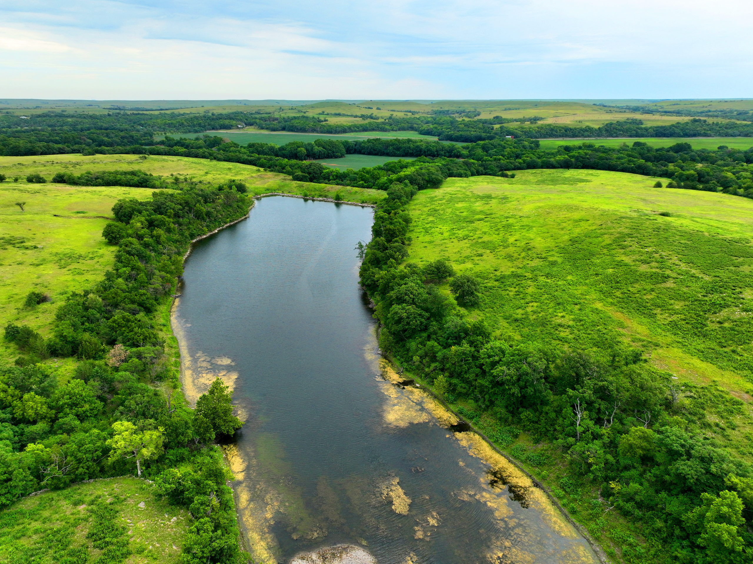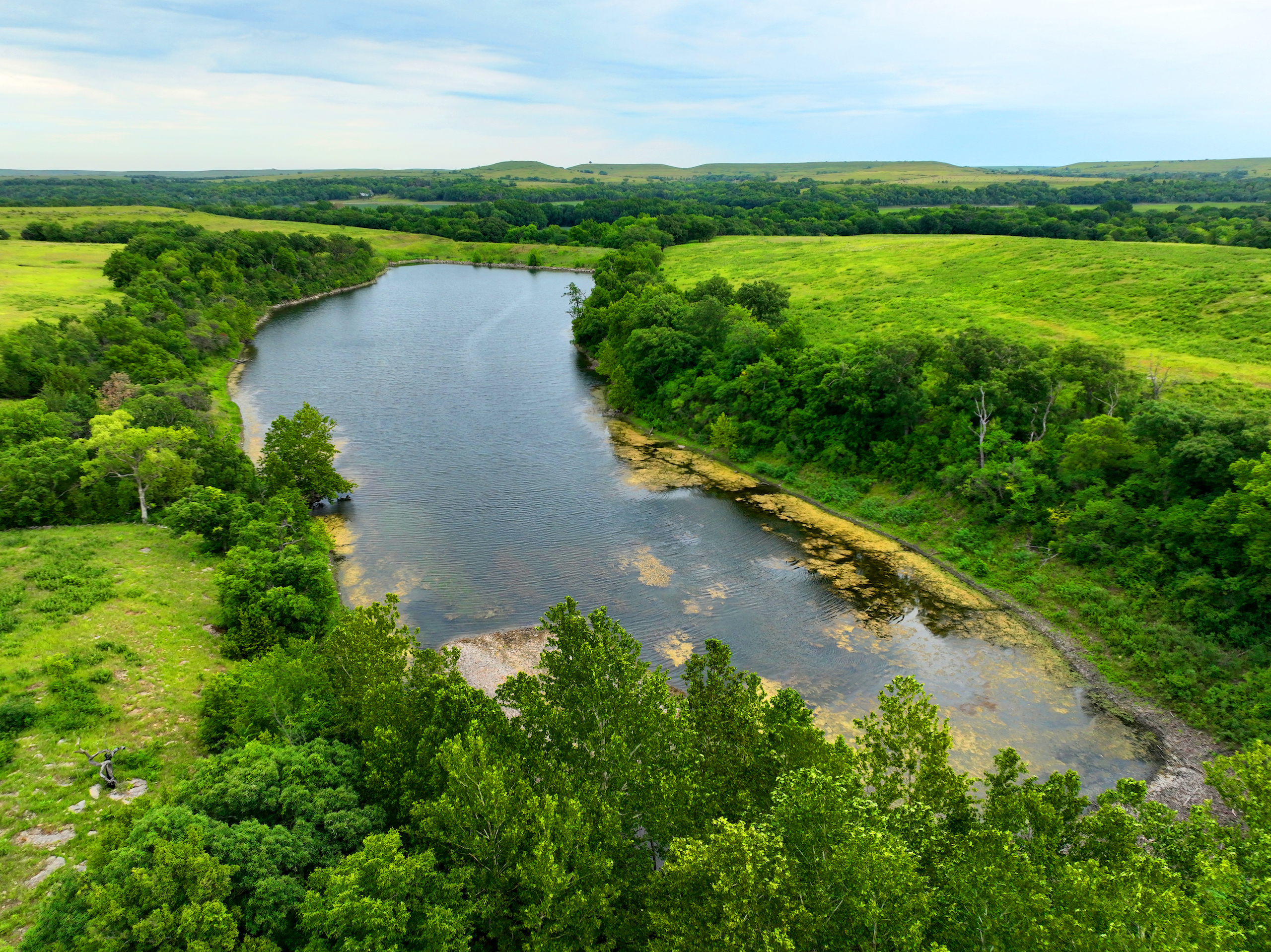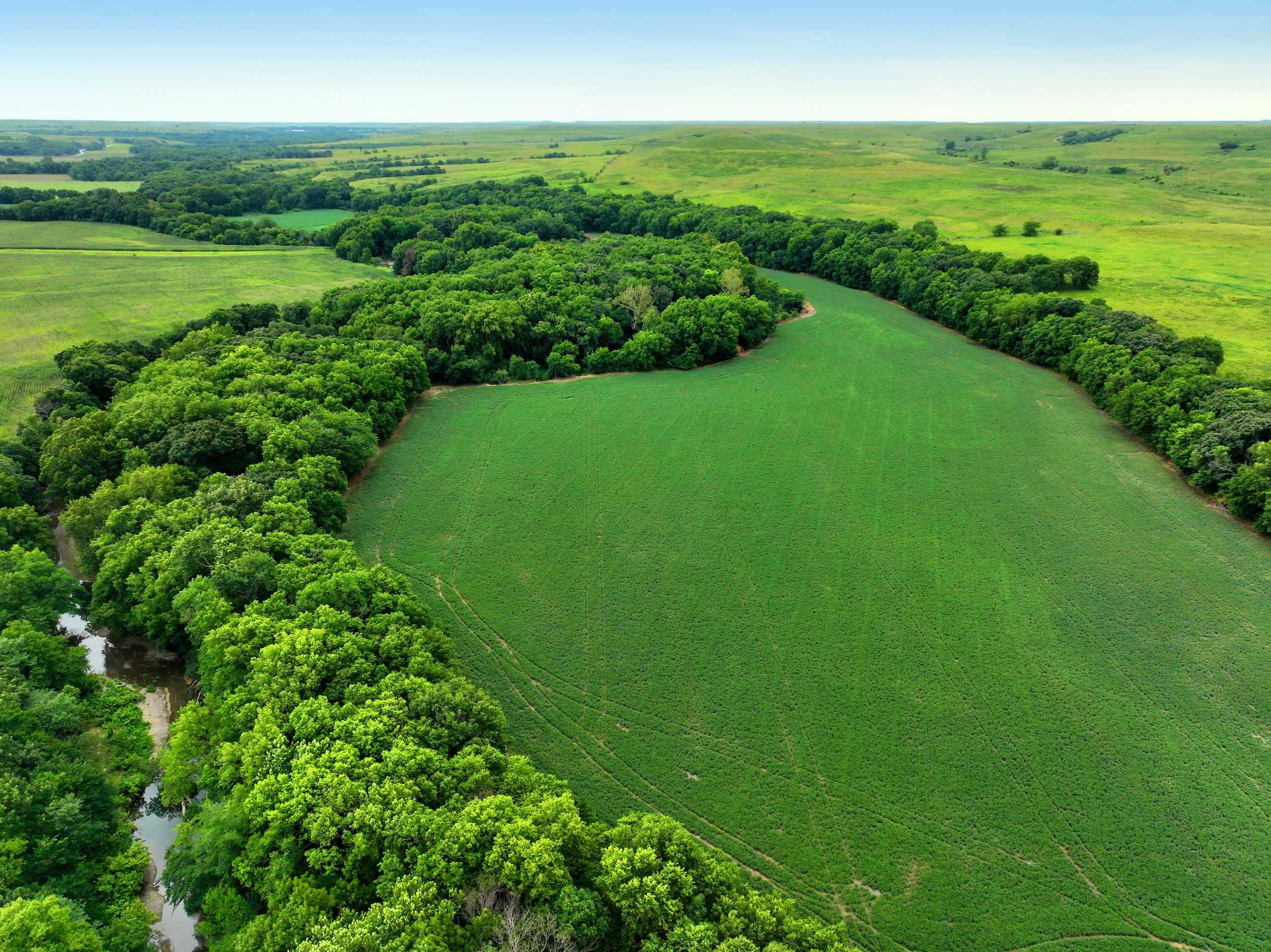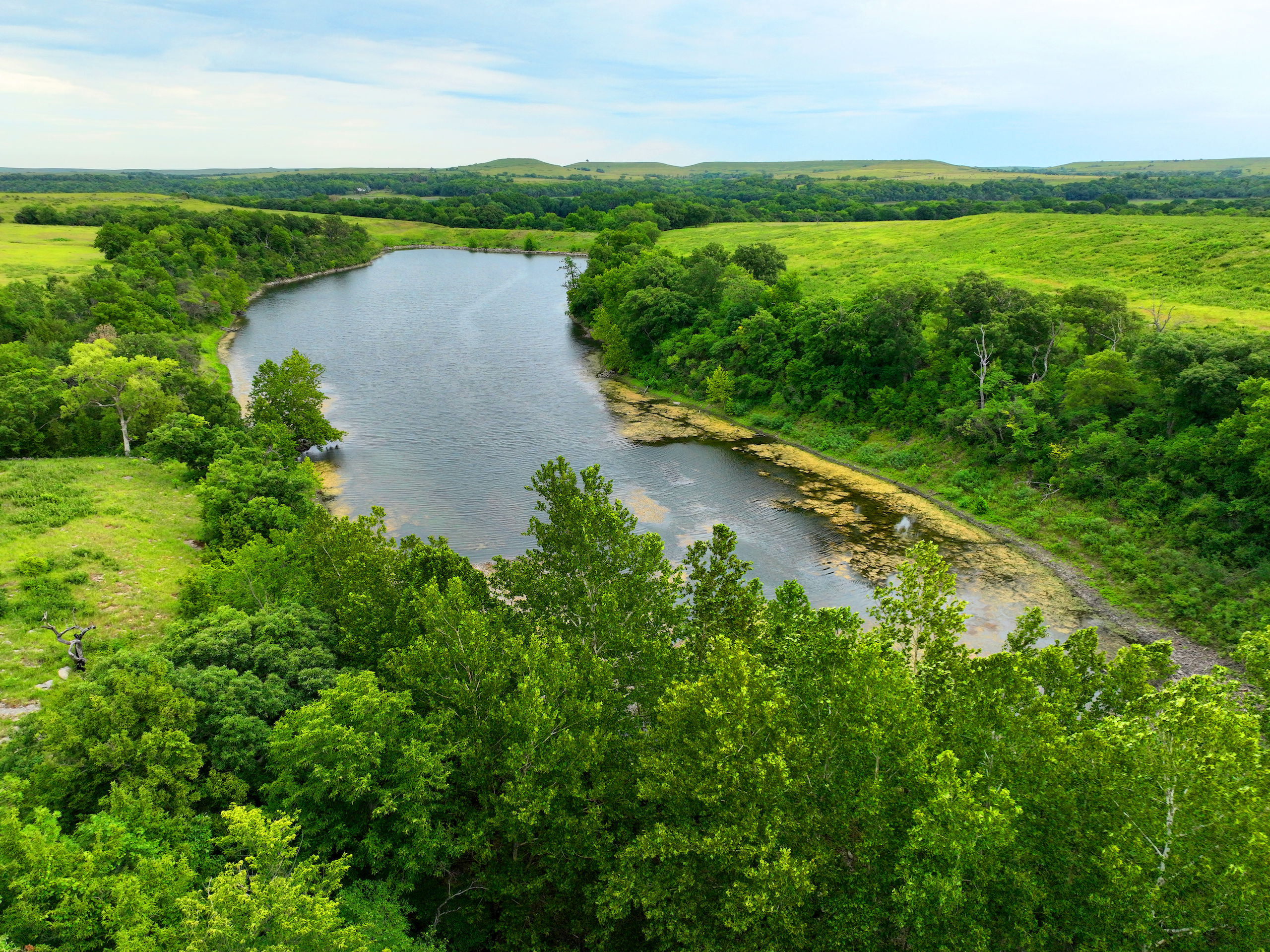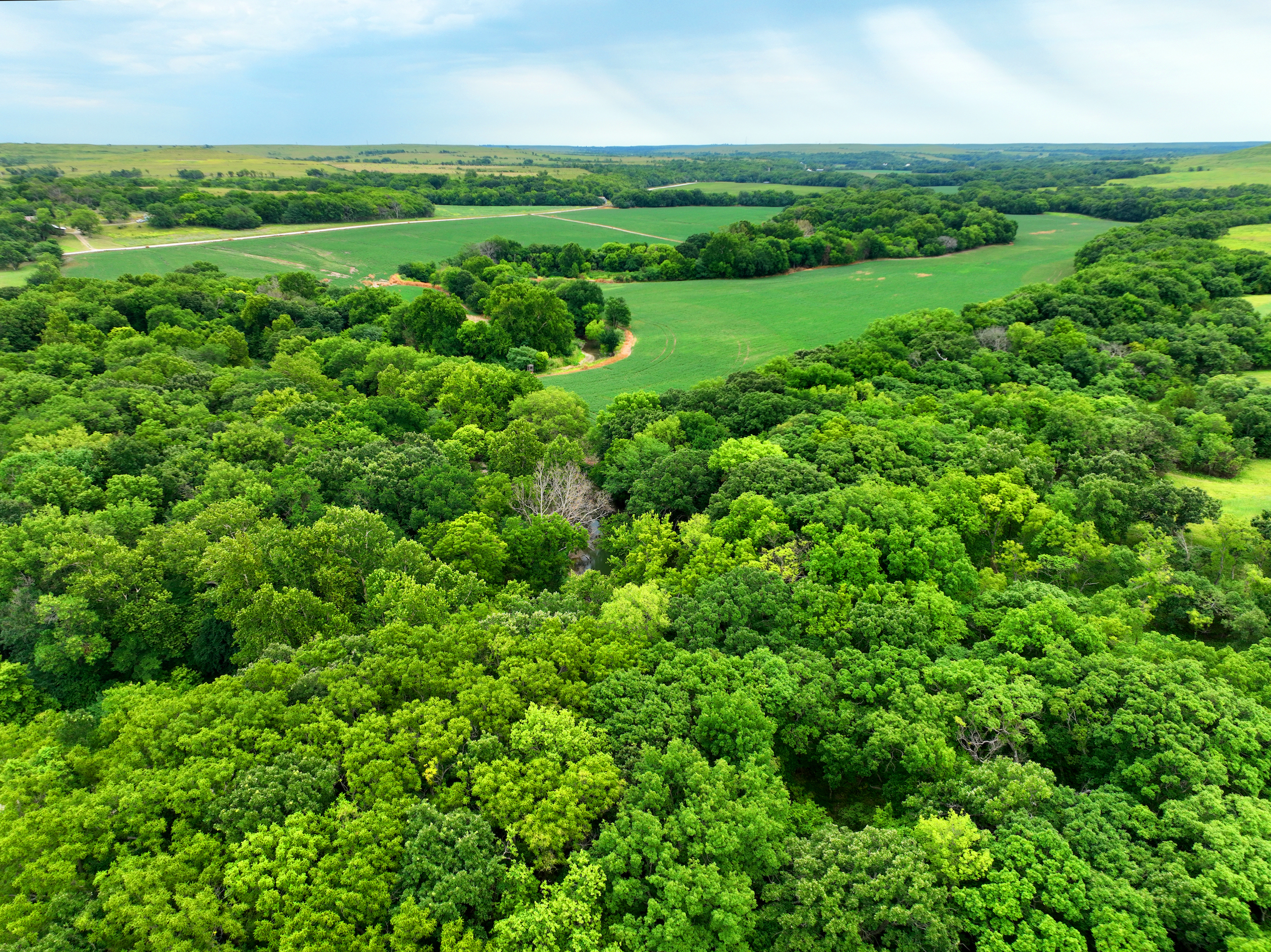 There are not too many farms on the open market that will be able to compete with this one when it comes to recreation. This farm is located approximately 6 miles south of Alma, Kansas, on Hessdale Road in Wabaunsee County. If you’re an avid sportsman looking for a turn-key property, I’m not sure what more you could ask for. The east branch of mill creek winds through the entire property creating approximately one mile of creek frontage. Four separate crop fields surrounded with timber are situated throughout the farm; 2 of the crop fields are hidden plots located between the creek and the flint hills timber/pasture. This creates unreal setups when it comes to whitetails and turkeys. Three new Banks Blinds have been strategically placed in these isolated plots making for some of the best Kansas hunting you’ll find in the eastern portion of the state. Tree stands are also scattered throughout the timber draws and creek banks if you're more of a stand guy. Located on the southwest portion of this tract is a stunning 9-acre lake with rock banks and crystal-clear water. This lake is loaded with fish; bass and catfish are the dominant species. Approximately 160-acres of cropland exist, usually planted to corn or soybeans. Currently, 40 acres of corn is planted while the balance is planted to soybeans. A cash rental agreement between the landowner and the tenant is in place on the cropland; no grazing lease exists. While turkey numbers throughout Kansas are down, this property seems to have an abundance of turkeys. Several toms are calling this place home, roosting in the mature oak trees and strutting in the isolated crop fields. Whitetails are a staple; there is definitely a chance to harvest a trophy whitetail year after year on this farm. There are two separate clover food plots located in different portions of the farm. This farm literally has it all: timber, creek, lake, cropland, food plots, and blinds. Call us today!