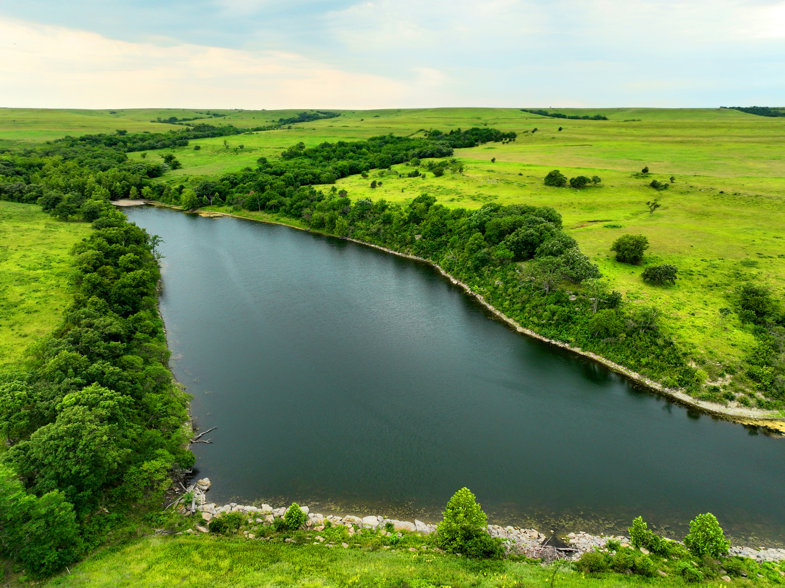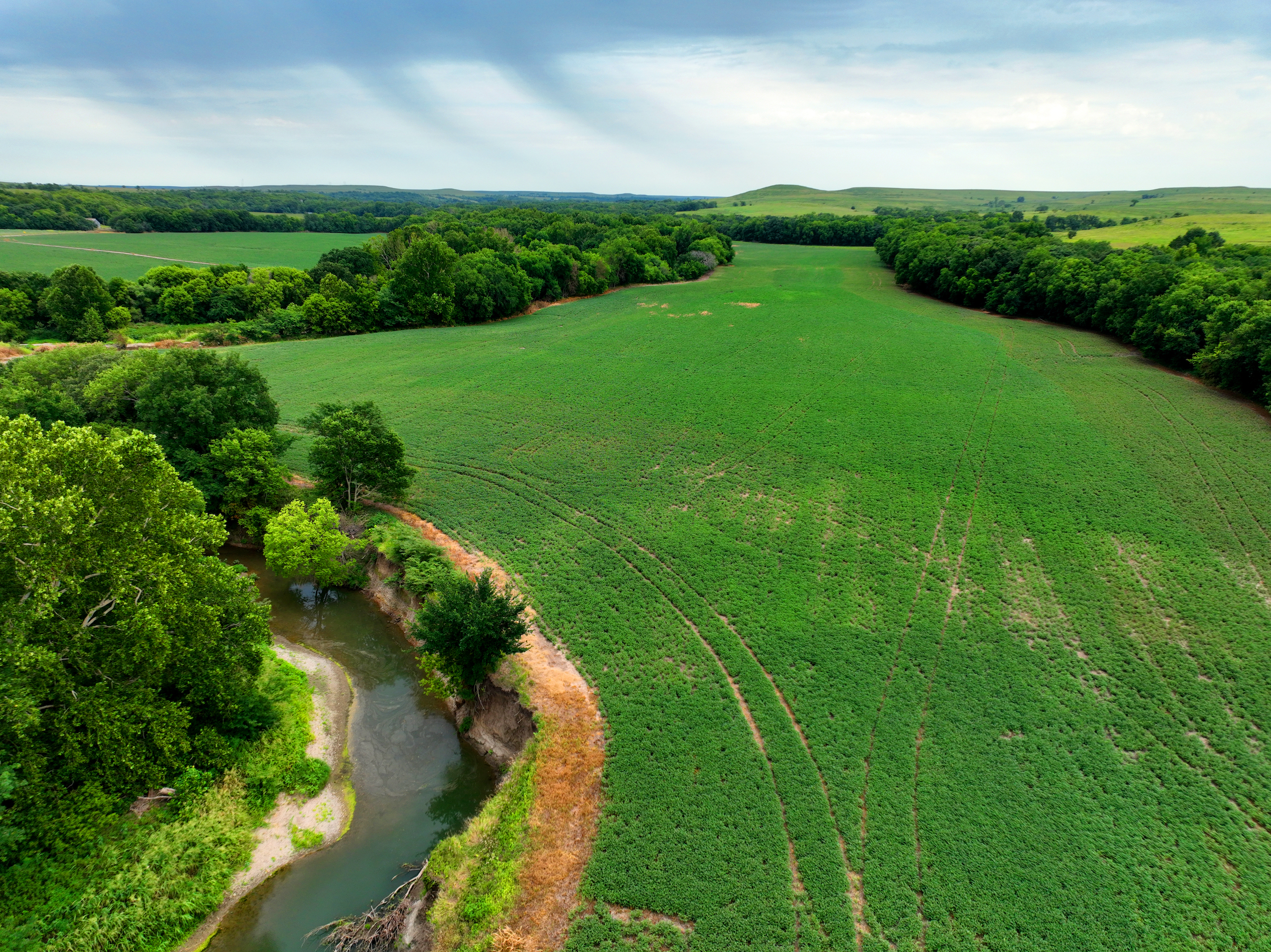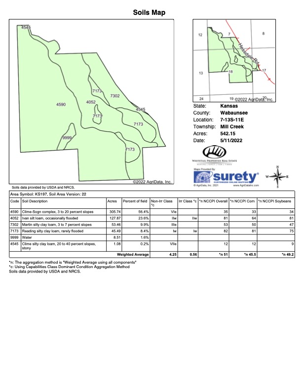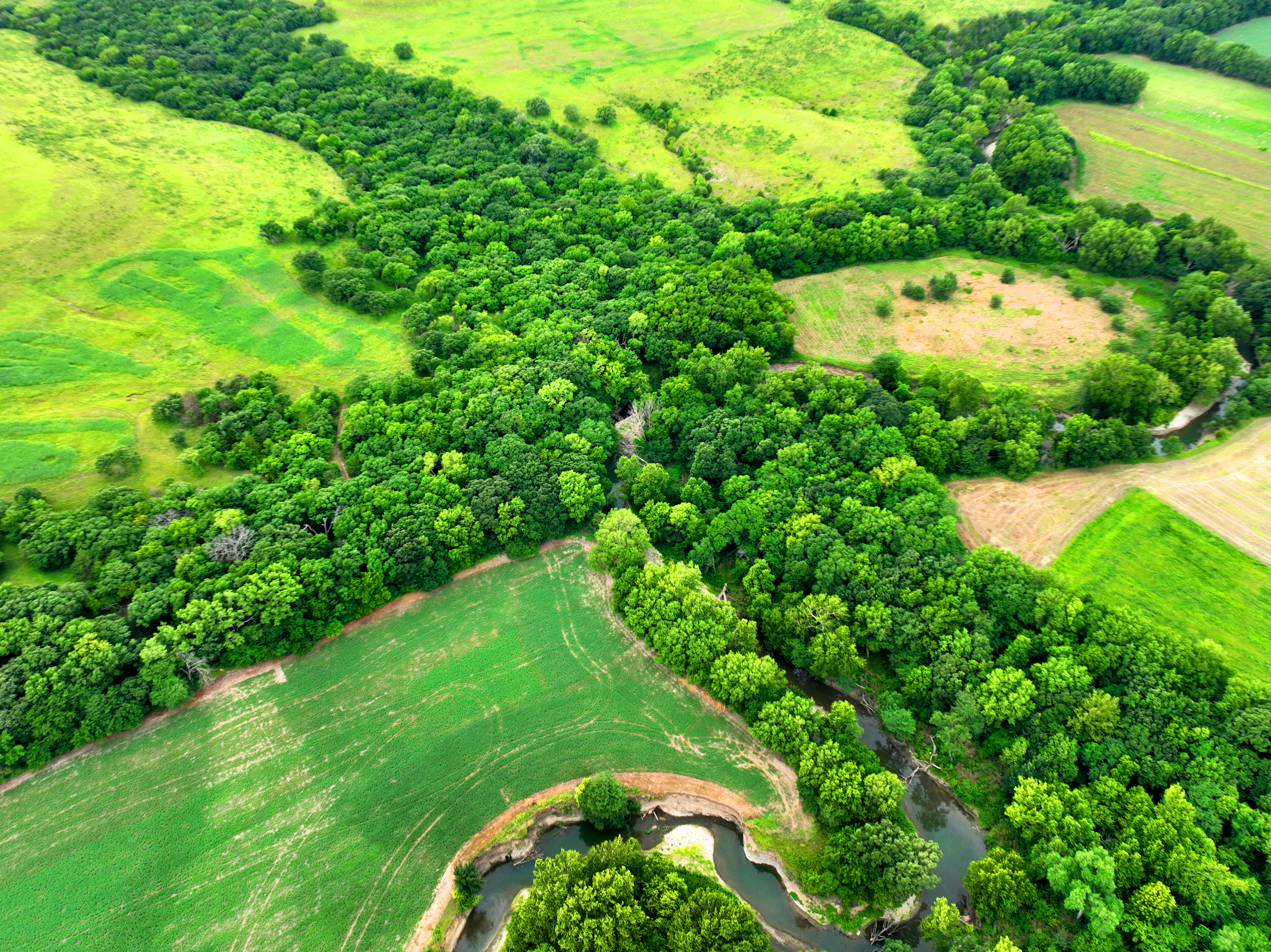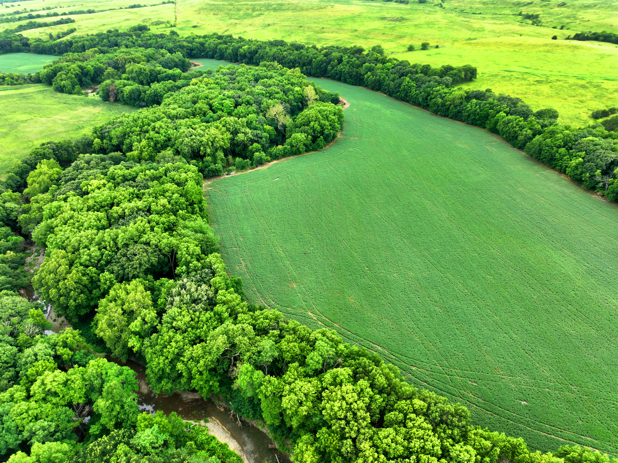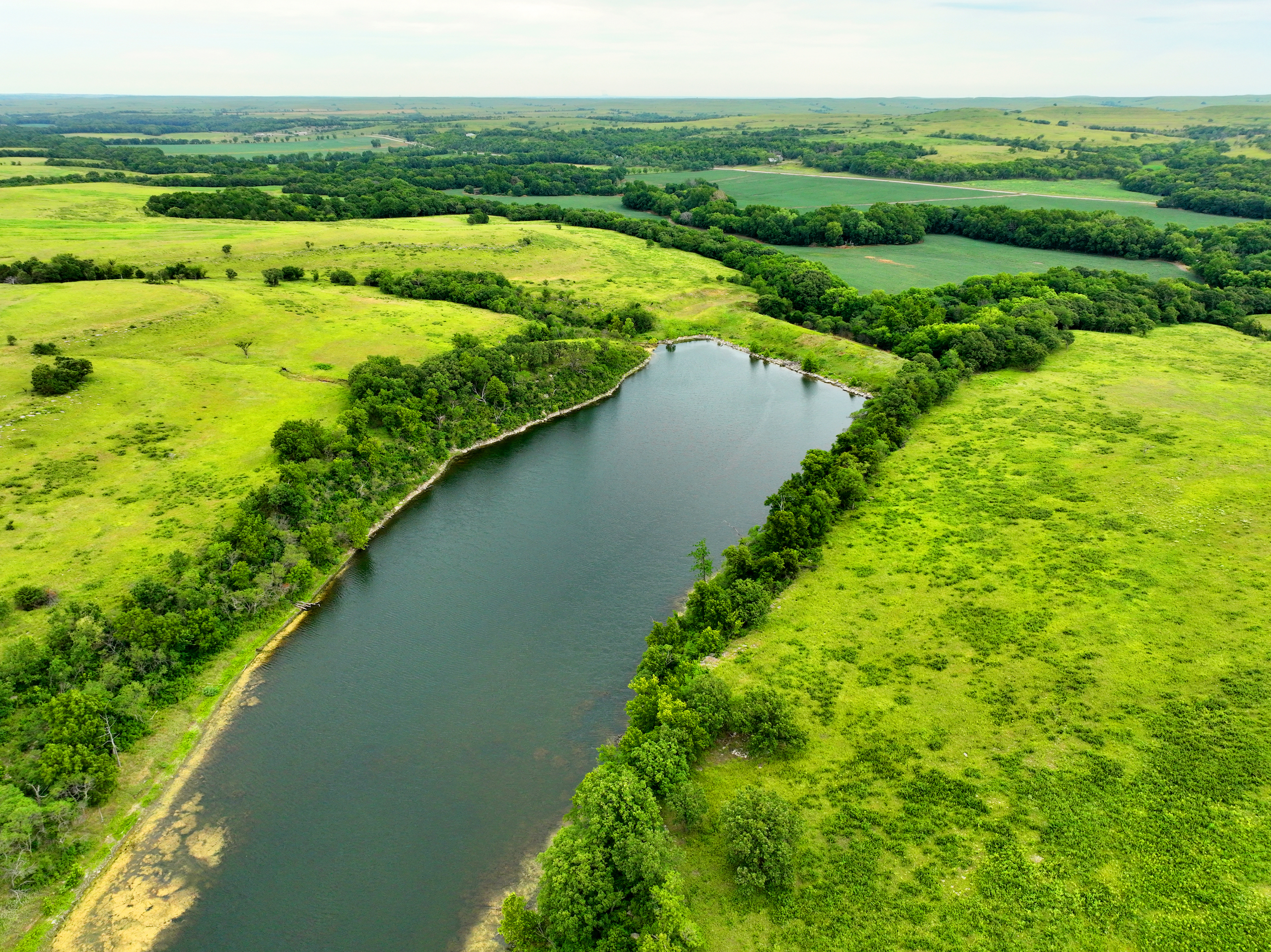 There are not too many farms on the open market that will be able to compete with this one when it comes to recreation. This farm is located approximately 6 miles south of Alma, Kansas, on Hessdale Road in Wabaunsee County. If you’re an avid sportsman looking for a turn-key property, I’m not sure what more you could ask for. The east branch of mill creek winds through the entire property creating approximately one mile of creek frontage. Four separate crop fields surrounded with timber are situated throughout the farm; 2 of the crop fields are hidden plots located between the creek and the flint hills timber/pasture. This creates unreal setups when it comes to whitetails and turkeys. Three new Banks Blinds have been strategically placed in these isolated plots making for some of the best Kansas hunting you’ll find in the eastern portion of the state. Tree stands are also scattered throughout the timber draws and creek banks if you're more of a stand guy. Located on the southwest portion of this tract is a stunning 9-acre lake with rock banks and crystal-clear water. This lake is loaded with fish; bass and catfish are the dominant species. Approximately 160-acres of cropland exist, usually planted to corn or soybeans. Currently, 40 acres of corn is planted while the balance is planted to soybeans. A cash rental agreement between the landowner and the tenant is in place on the cropland; no grazing lease exists. While turkey numbers throughout Kansas are down, this property seems to have an abundance of turkeys. Several toms are calling this place home, roosting in the mature oak trees and strutting in the isolated crop fields. Whitetails are a staple; there is definitely a chance to harvest a trophy whitetail year after year on this farm. There are two separate clover food plots located in different portions of the farm. This farm literally has it all: timber, creek, lake, cropland, food plots, and blinds. Call us today!