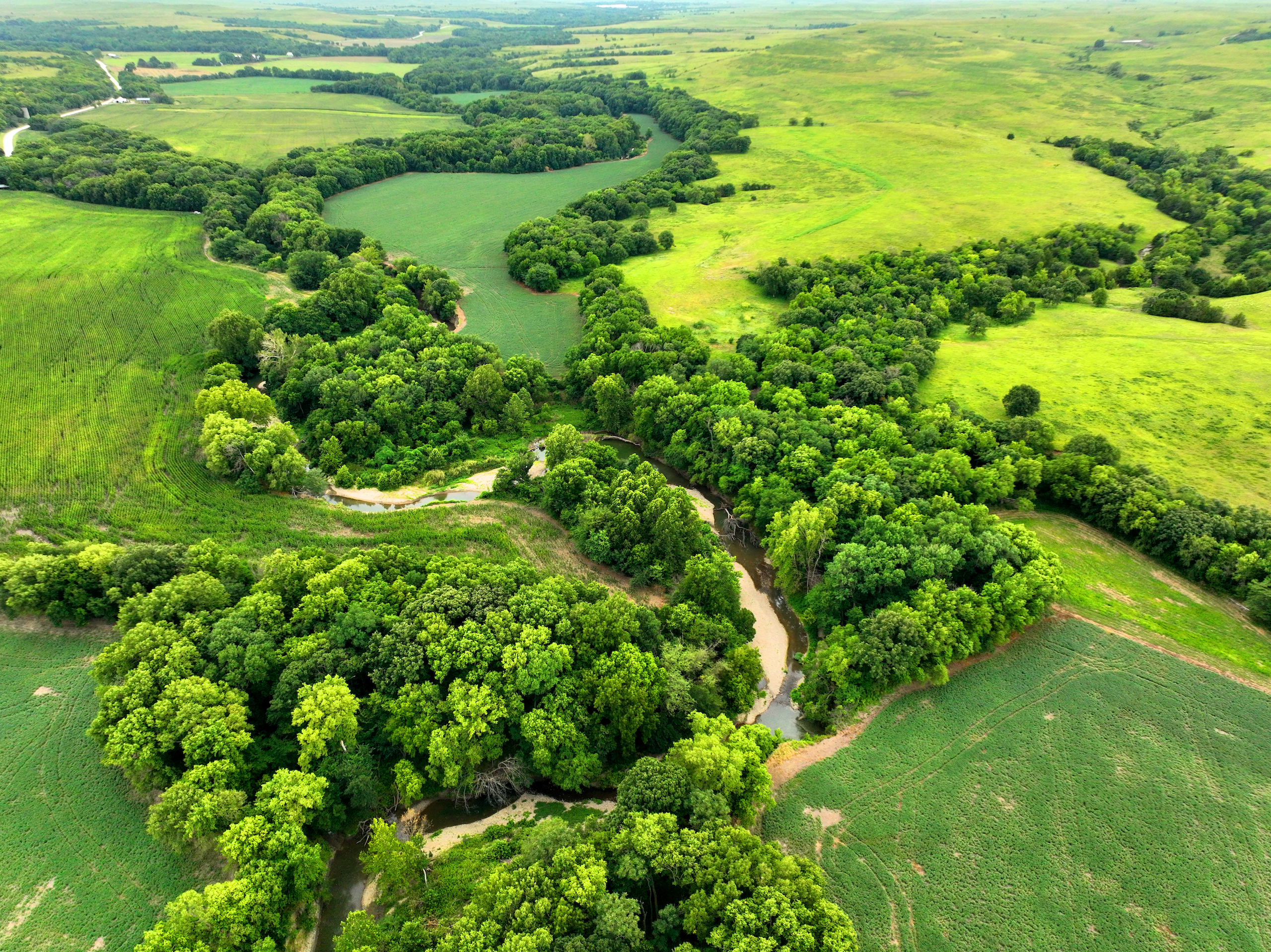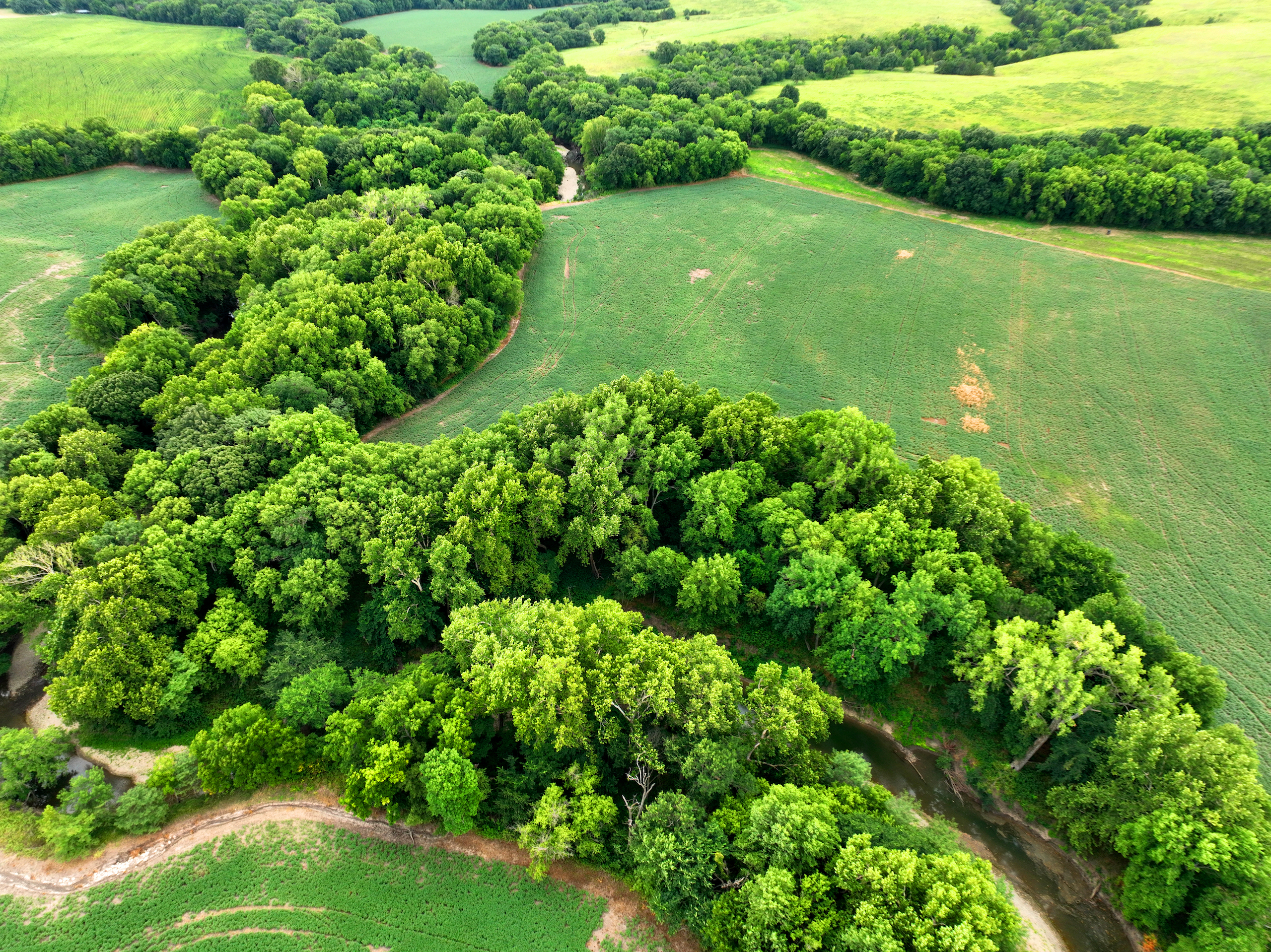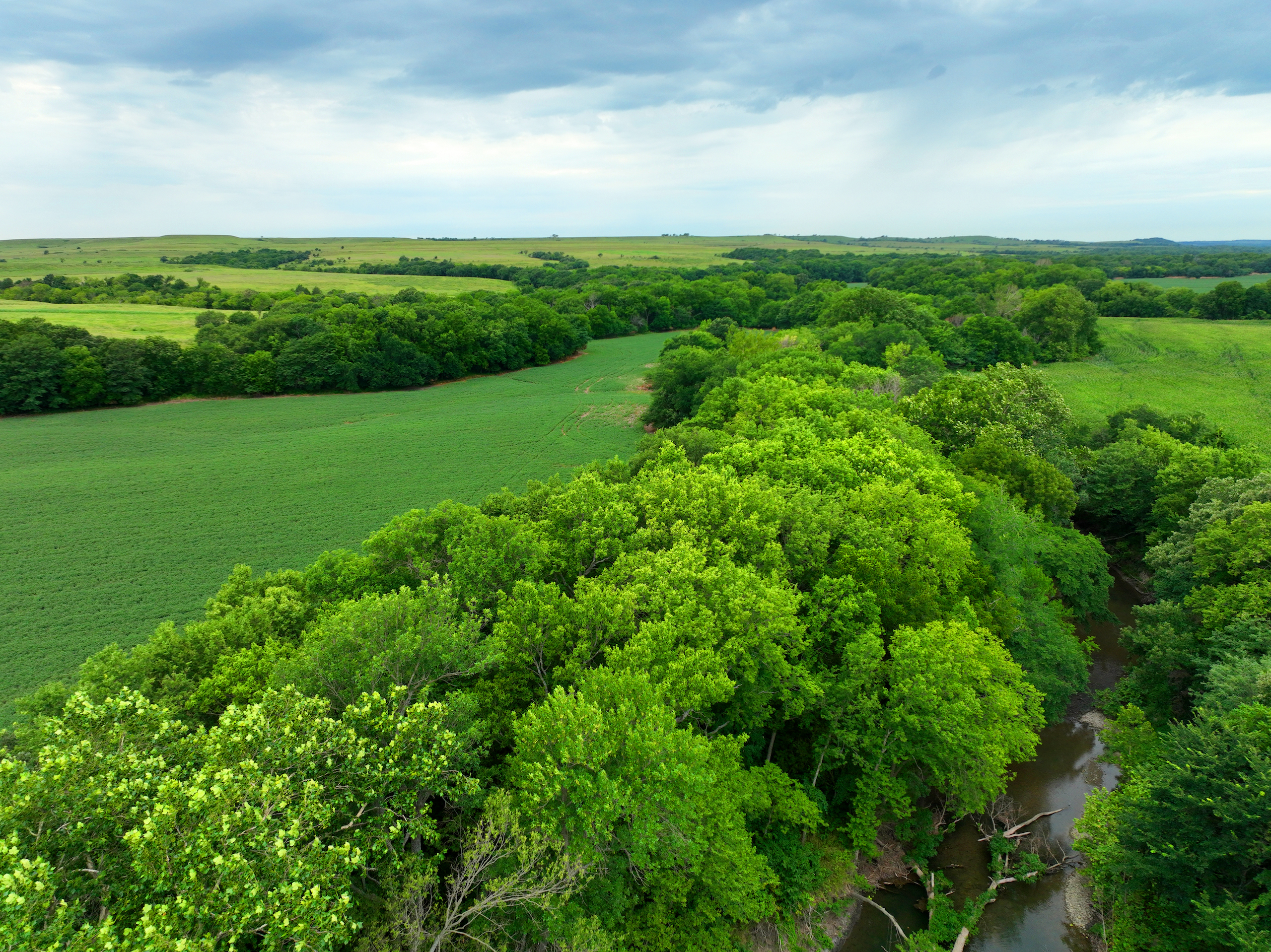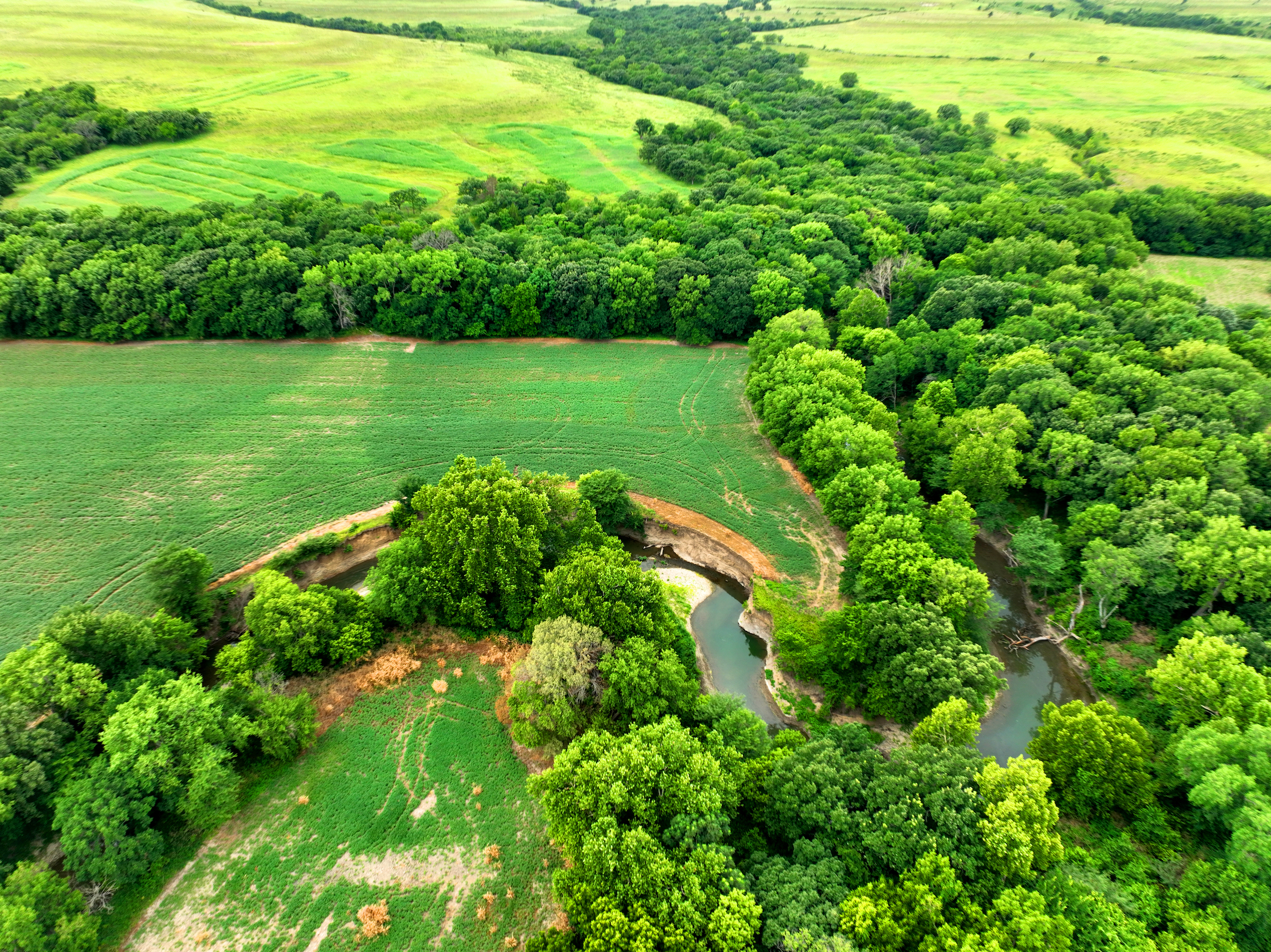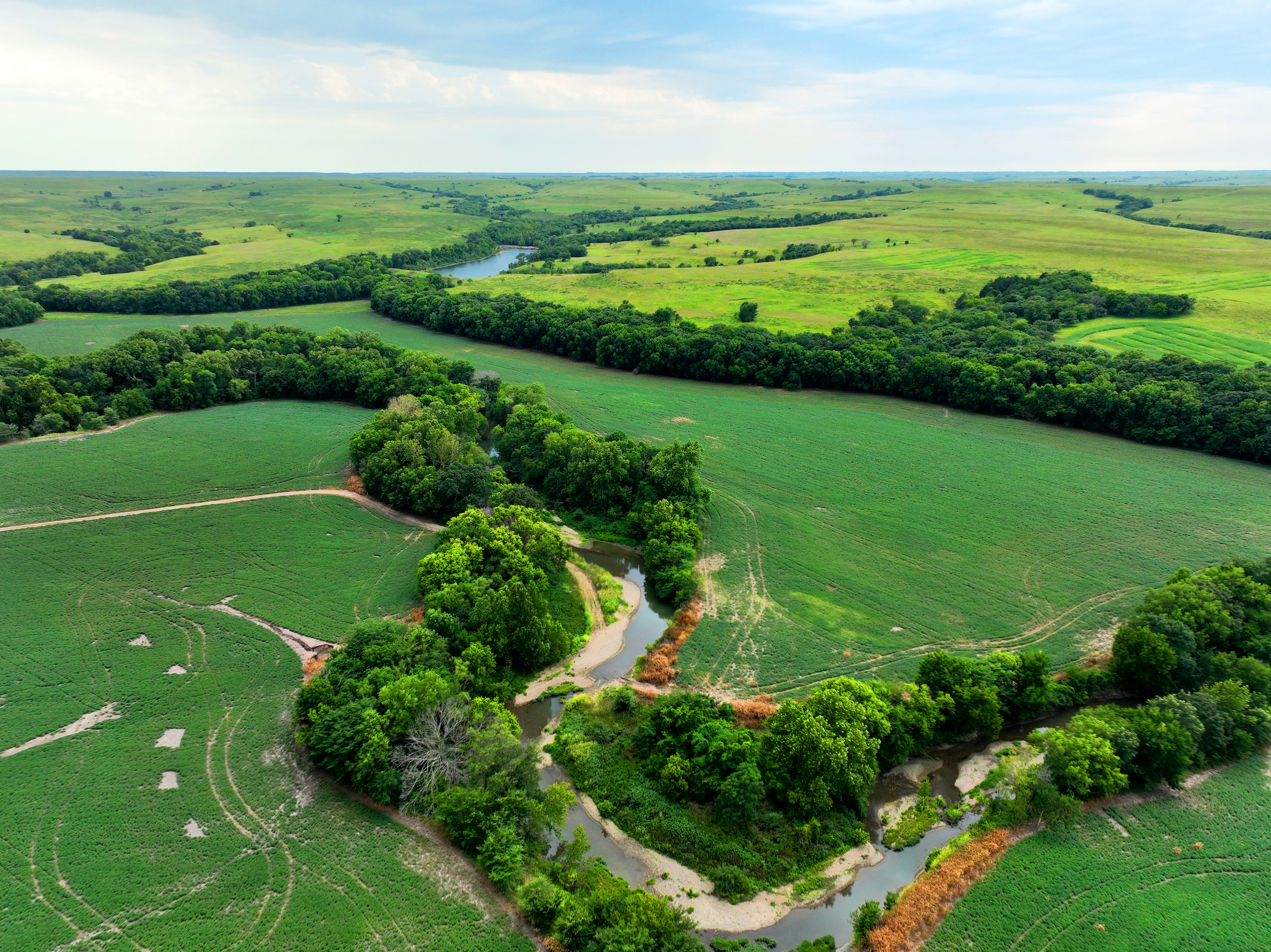 There are not too many farms on the open market that will be able to compete with this one when it comes to recreation. This farm is located approximately 6 miles south of Alma, Kansas, on Hessdale Road in Wabaunsee County. If you’re an avid sportsman looking for a turn-key property, I’m not sure what more you could ask for. The east branch of mill creek winds through the entire property creating approximately one mile of creek frontage. Four separate crop fields surrounded with timber are situated throughout the farm; 2 of the crop fields are hidden plots located between the creek and the flint hills timber/pasture. This creates unreal setups when it comes to whitetails and turkeys. Three new Banks Blinds have been strategically placed in these isolated plots making for some of the best Kansas hunting you’ll find in the eastern portion of the state. Tree stands are also scattered throughout the timber draws and creek banks if you're more of a stand guy. Located on the southwest portion of this tract is a stunning 9-acre lake with rock banks and crystal-clear water. This lake is loaded with fish; bass and catfish are the dominant species. Approximately 160-acres of cropland exist, usually planted to corn or soybeans. Currently, 40 acres of corn is planted while the balance is planted to soybeans. A cash rental agreement between the landowner and the tenant is in place on the cropland; no grazing lease exists. While turkey numbers throughout Kansas are down, this property seems to have an abundance of turkeys. Several toms are calling this place home, roosting in the mature oak trees and strutting in the isolated crop fields. Whitetails are a staple; there is definitely a chance to harvest a trophy whitetail year after year on this farm. There are two separate clover food plots located in different portions of the farm. This farm literally has it all: timber, creek, lake, cropland, food plots, and blinds. Call us today!