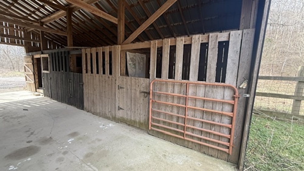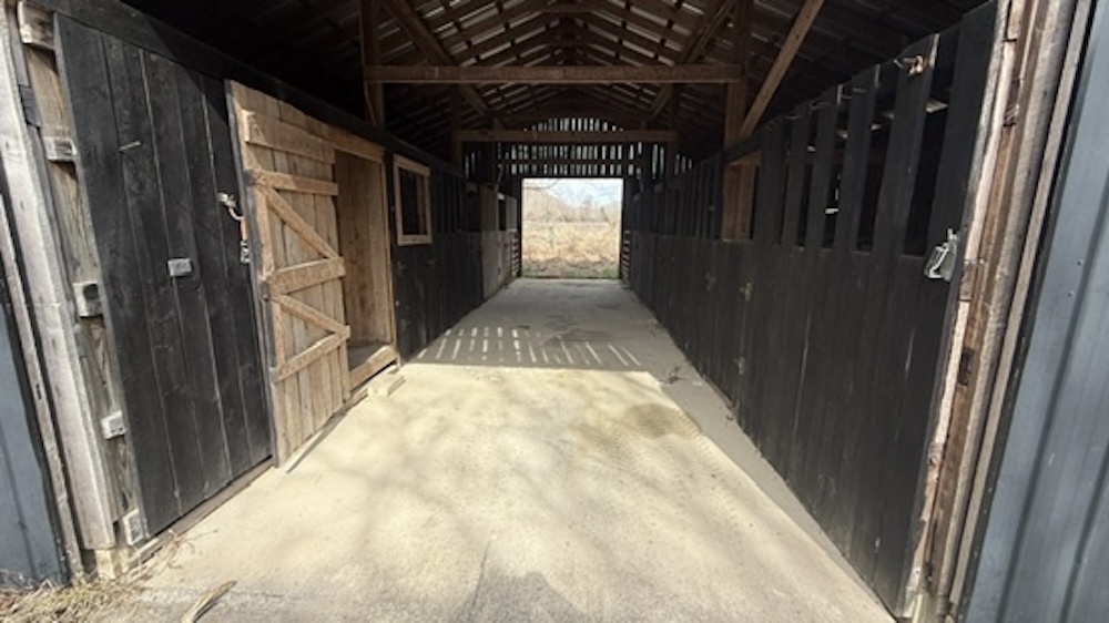 Equestrian and livestock infrastructure includes a horse barn with five stalls, a tack room, electric service, and water access. A hay barn is also located on the property and may require maintenance. Fencing and open ground support agricultural or livestock operations. Approximately 20 acres are currently in crop production and are being leased. Buyers should verify lease terms and crop arrangements.