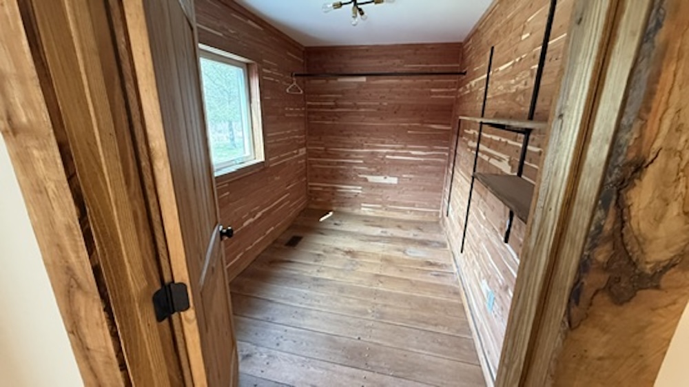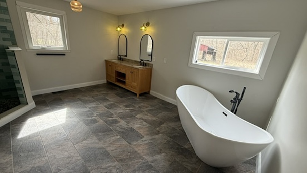 The farmhouse offers approximately 1,800 square feet of living space with three bedrooms and two bathrooms. Interior features include wood flooring, updated appliances, and a tankless water heater. The primary suite consists of a walk-in closet and a large bathroom with a tile shower and a separate tub. The layout provides functional living space suitable for full-time residence or farm occupancy.