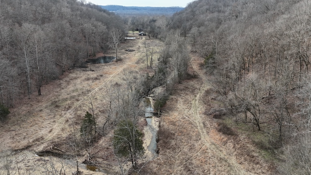 Water resources include county water service, a natural spring, a creek running through the property, and two ponds. These features support agricultural and recreational uses. Wildlife sign including deer and turkey has been observed on the property. The mix of timber, crop ground, water, and cover creates habitat conditions consistent with the region.