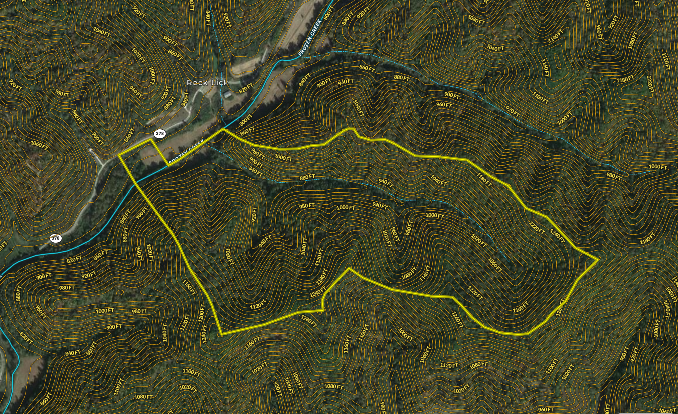 Look at this beautiful mountain property with over 1000' gorgeous blueline stream frontage. This property lies in one of the most beautiful, Appalachian mountain settings you'll find anywhere. You couldn't ask for a more peaceful and quiet home or cabin setting than along the west area of the property along Hwy 378, a quiet country road. With several acres of open, flat ground for cropping, food-plotting, home/cabin building, or even a small hobby farm, this property has that perfect blend of forest to open fields. Along the western front, edge is nearly 400' of Hwy 378 road frontage for excellent access and over 1000' of Frozen Creek, a blueline stream providing year-round water for a multitude of uses. Additional access to this property is by a 460' easement leading from KY 378 across the creek at the northwest corner. This beautiful tract shines as a multi-use/recreational getaway property or homestead in the making. From a recreation and hunting standpoint to the perfect homesteading property, this land has all the ingredients for that "country feel." Utilities are easily accessible along Hwy 378. This tract has a nice mix of young to mid-sized oak and hickory hardwoods on the points and ridges tapering into the draws, slopes, and drains, predominantly softer maples, poplar, and American beech. Much of the property could be timbered to recoup the investment in the near future if so desired. Overall, this beautiful forest is a pleasure to hike and explore, with old roads leading throughout much of the property with various ATV trails currently navigable. With just under 600' of elevation change to the highest peak at the easternmost edge of the property, this property feels even bigger than it is, with the central valley measuring nearly a mile long. The tranquil mountain forest here is home to all kinds of wildlife, including giant whitetails, eastern toms, and the occasional black bear, bobcat, and fox wandering through. This beautiful majestic property is located along HWY 378 and Frozen Creek, which stretches over 14 miles before eventually running into the North Fork Kentucky River many miles to the southwest. If this sounds like what you have been looking for, call me, and let's see if this property is what you've been searching for.