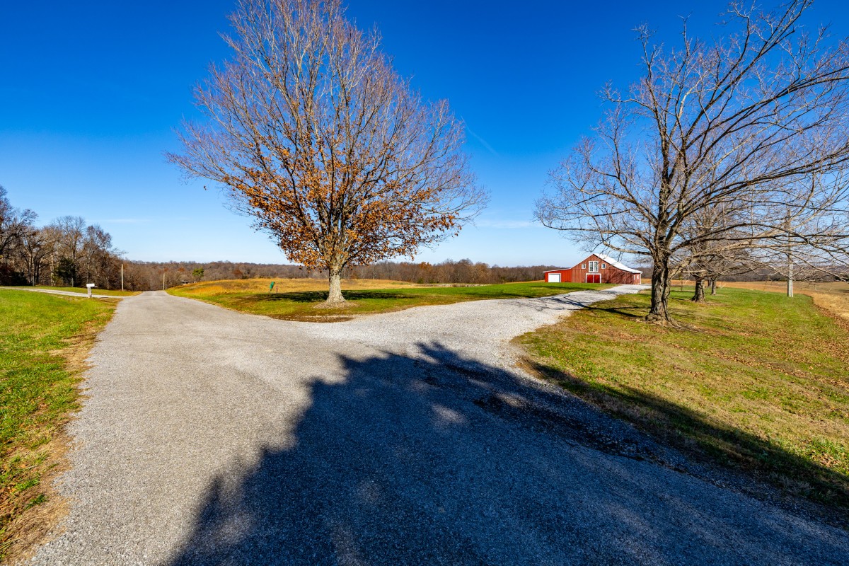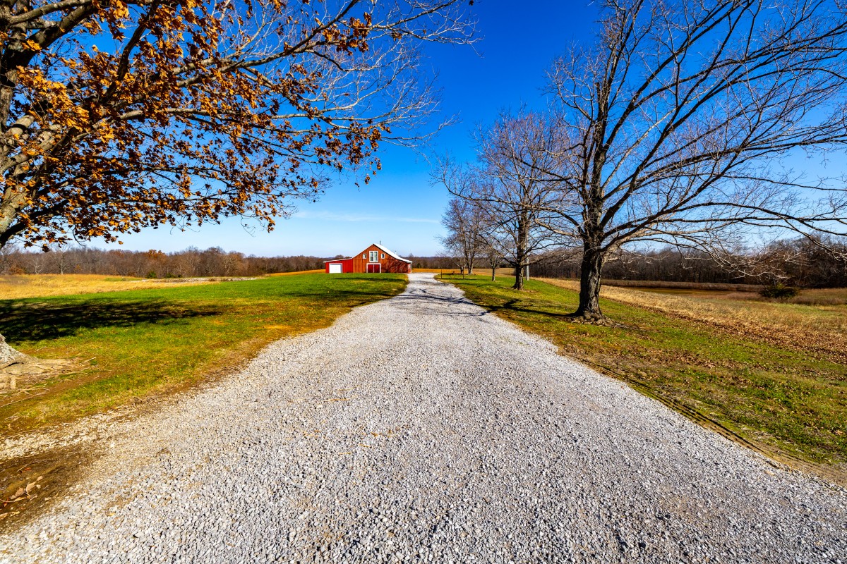 - Large gravel drive and parking area