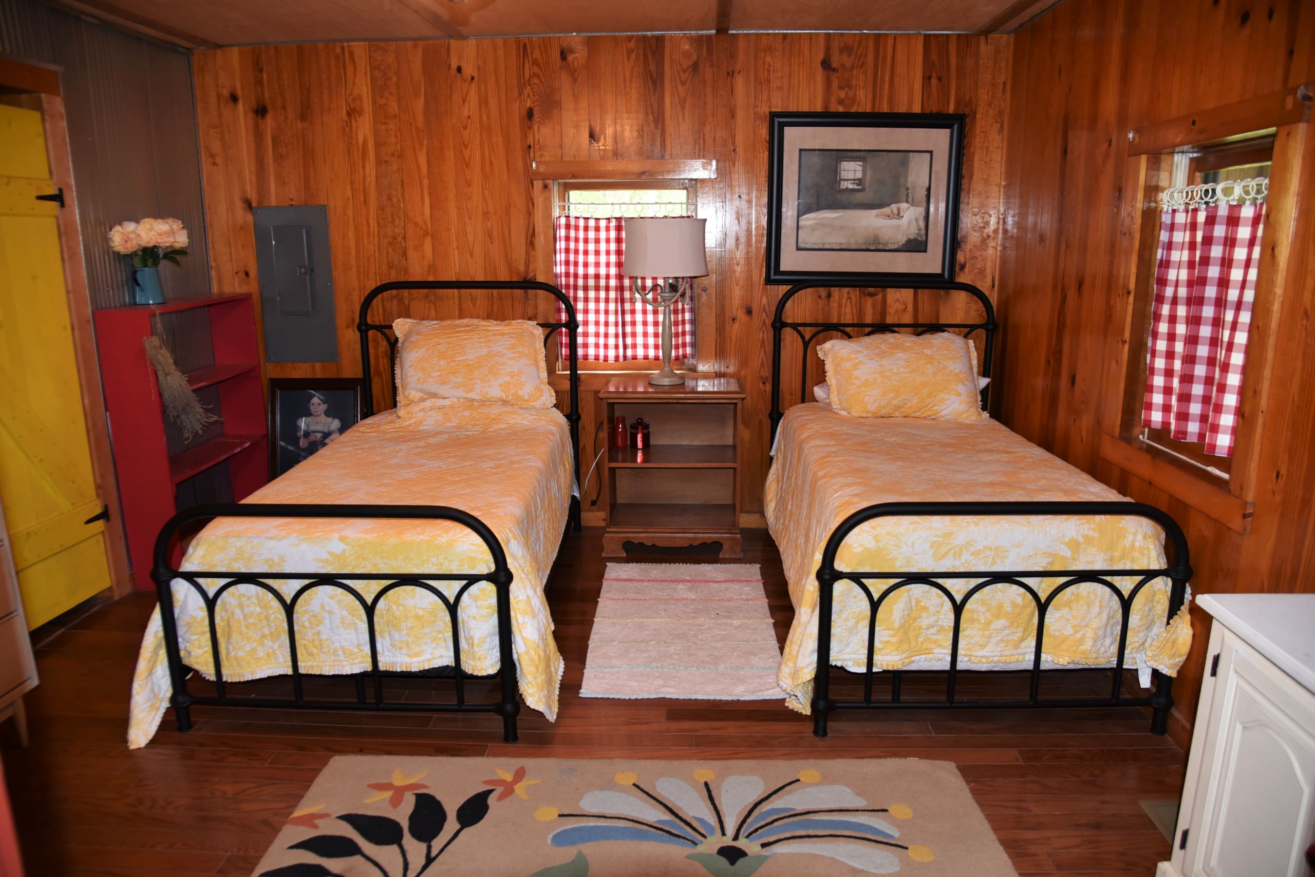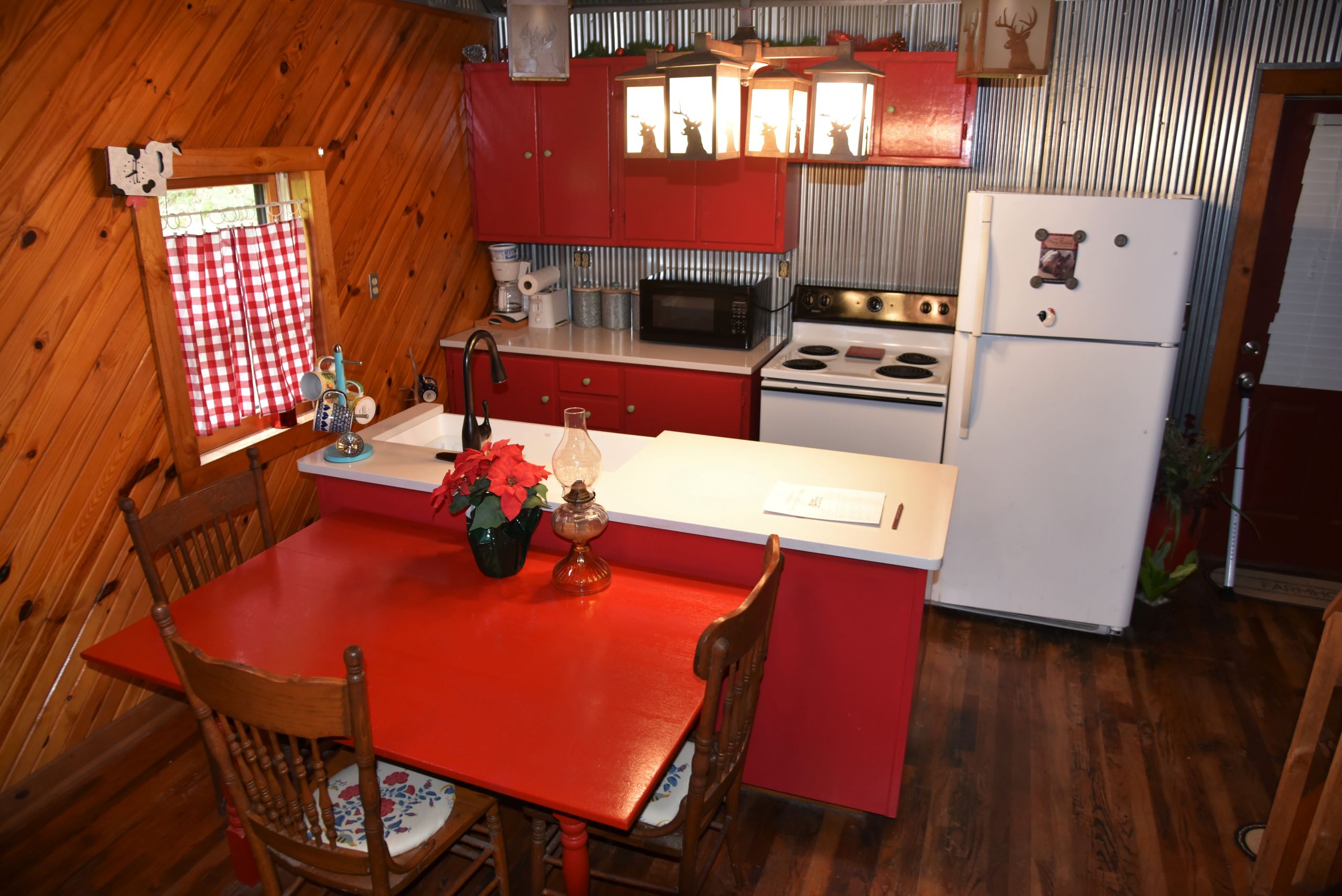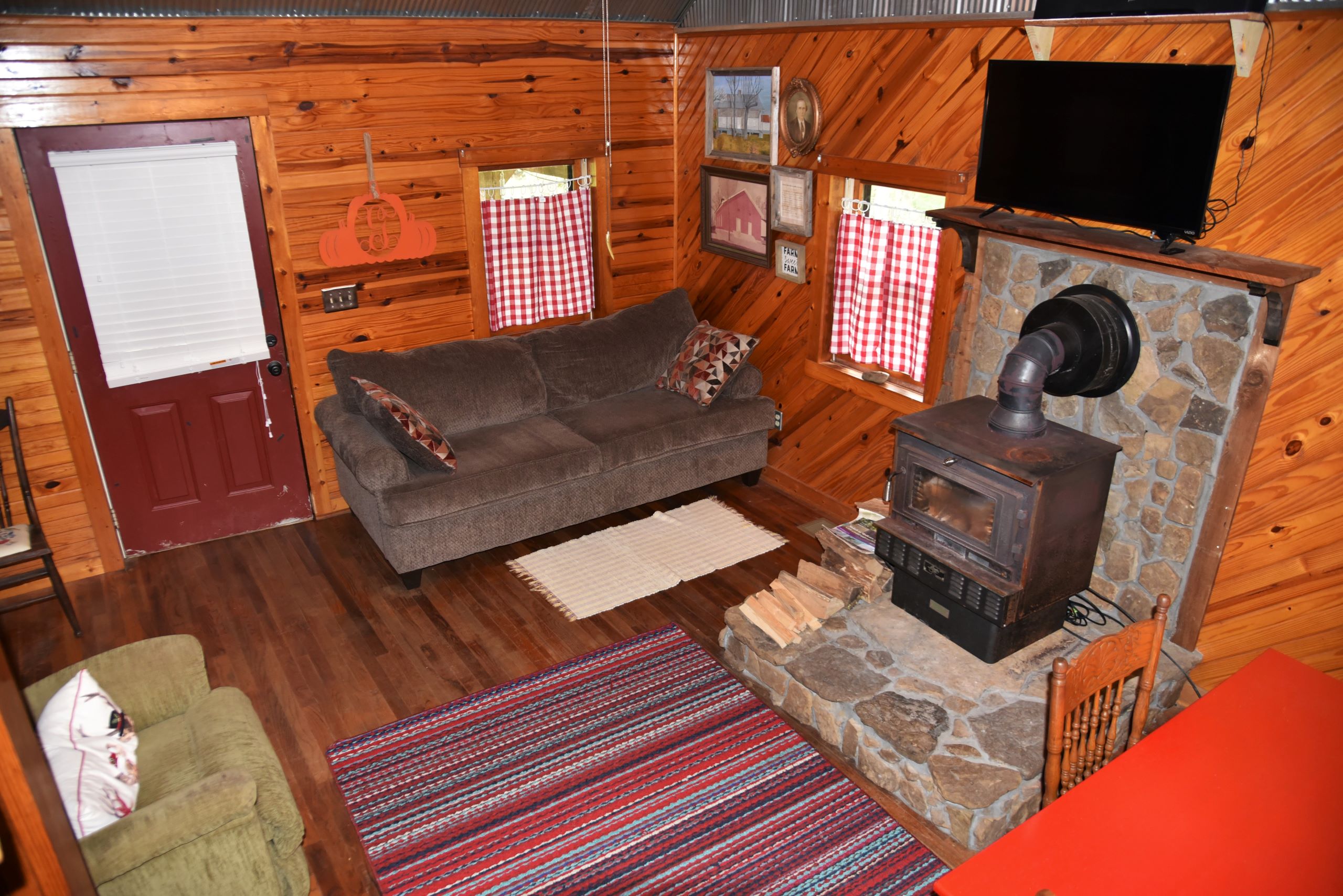 - Wood walls, floors and ceiling with barn tin accents throughout