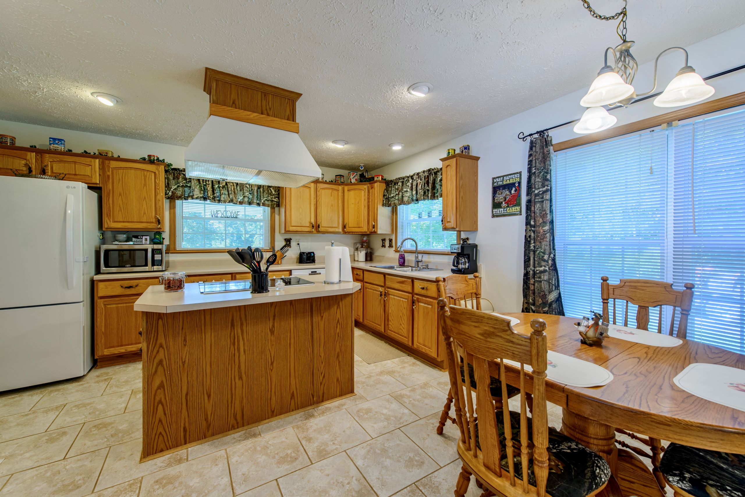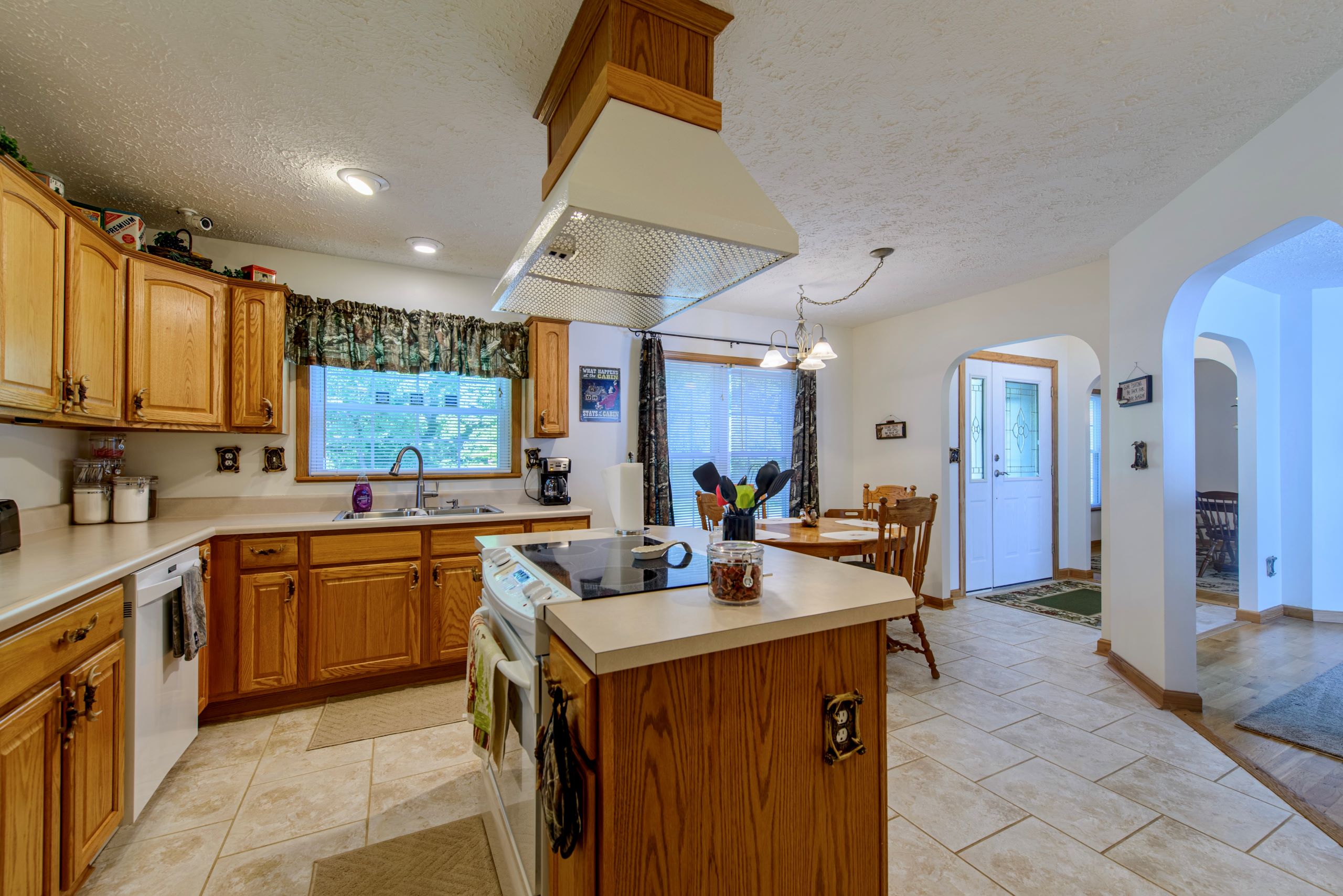 - Large kitchen with an island, plenty of countertop and cabinet space, and dining area